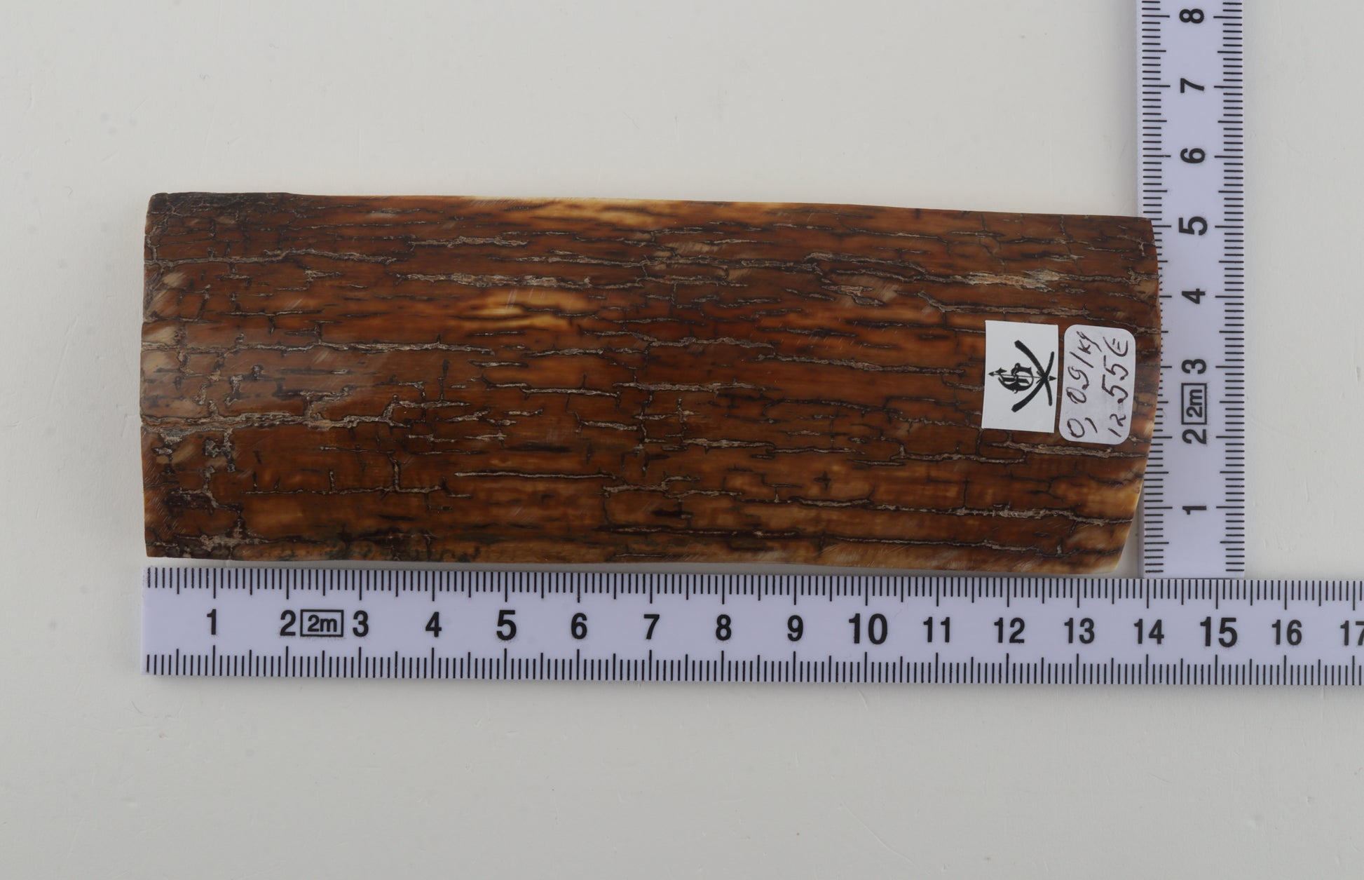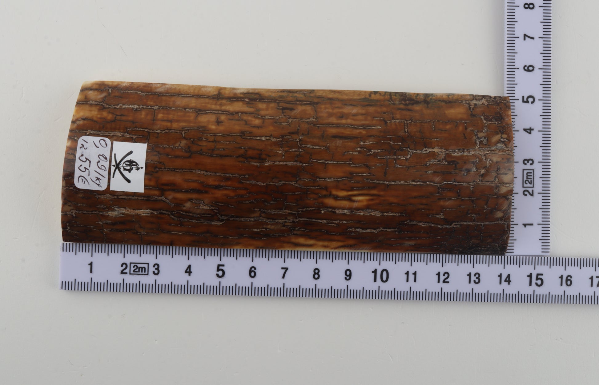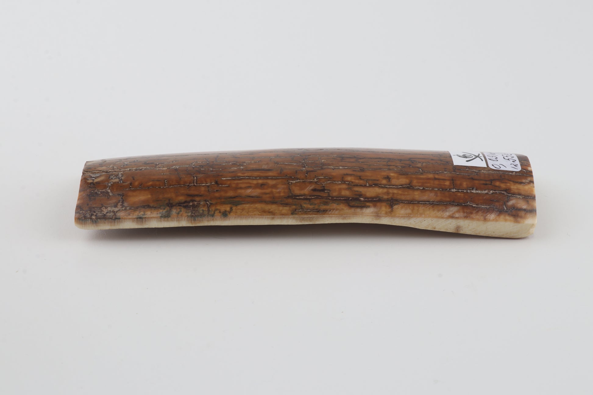 This is a premium-quality piece of Siberian woolly mammoth bark (Mammuthus primigenius). The ivory is naturally dense and solid, without cracks. There are two tiny, non-penetrating fissures on the narrower cross-cut section. Consistent width with reserves on both ends. The natural colour of the bark is caramel.