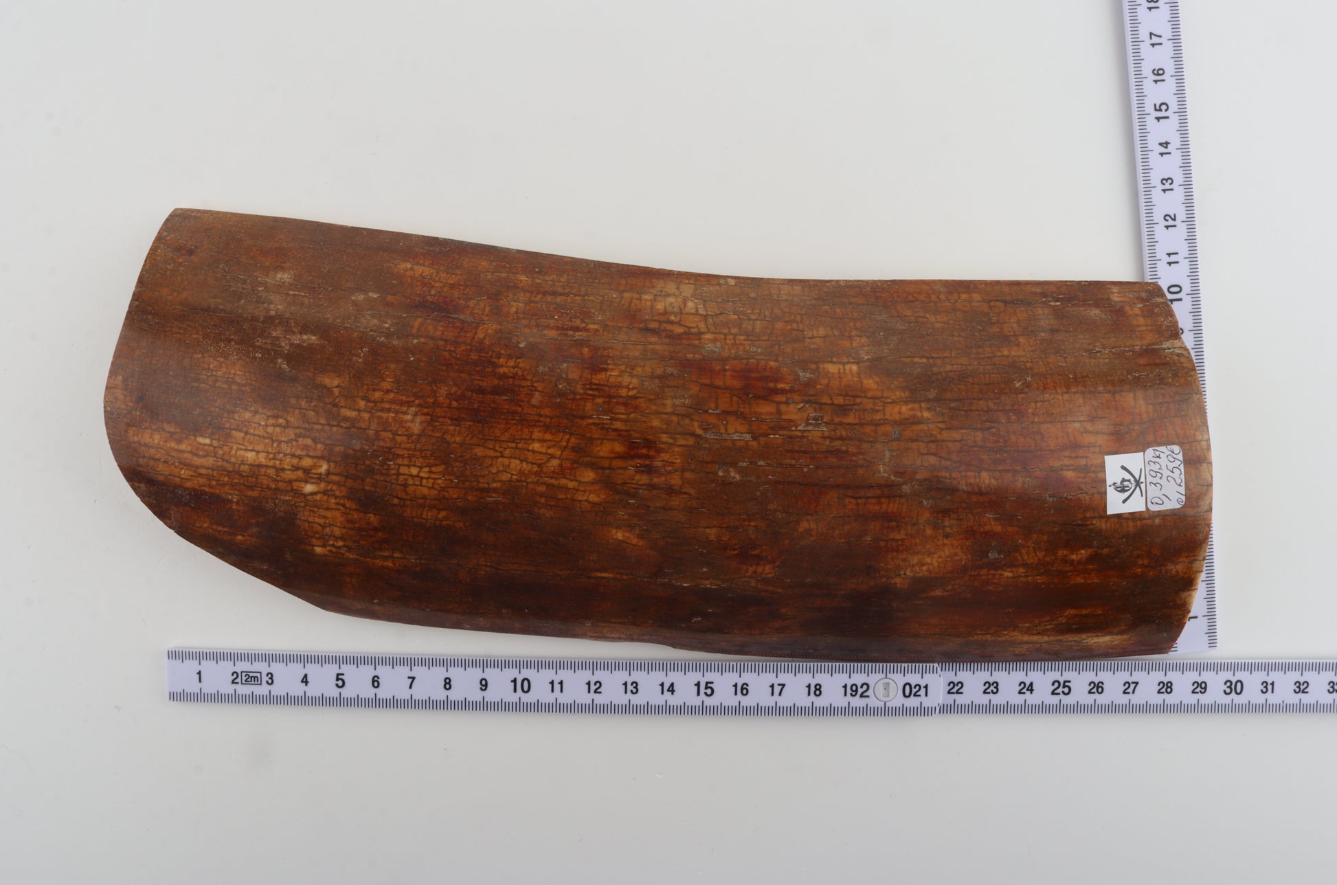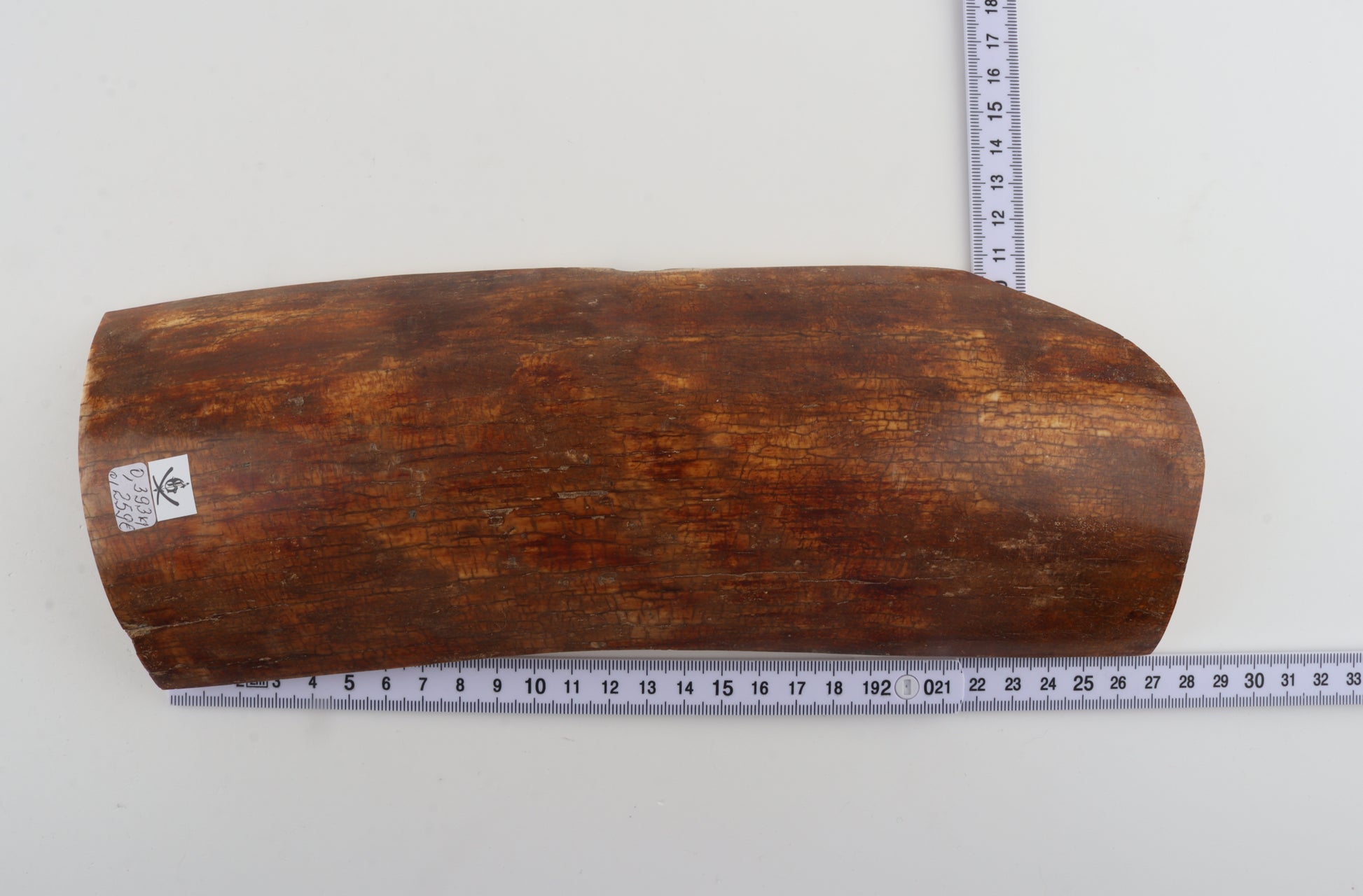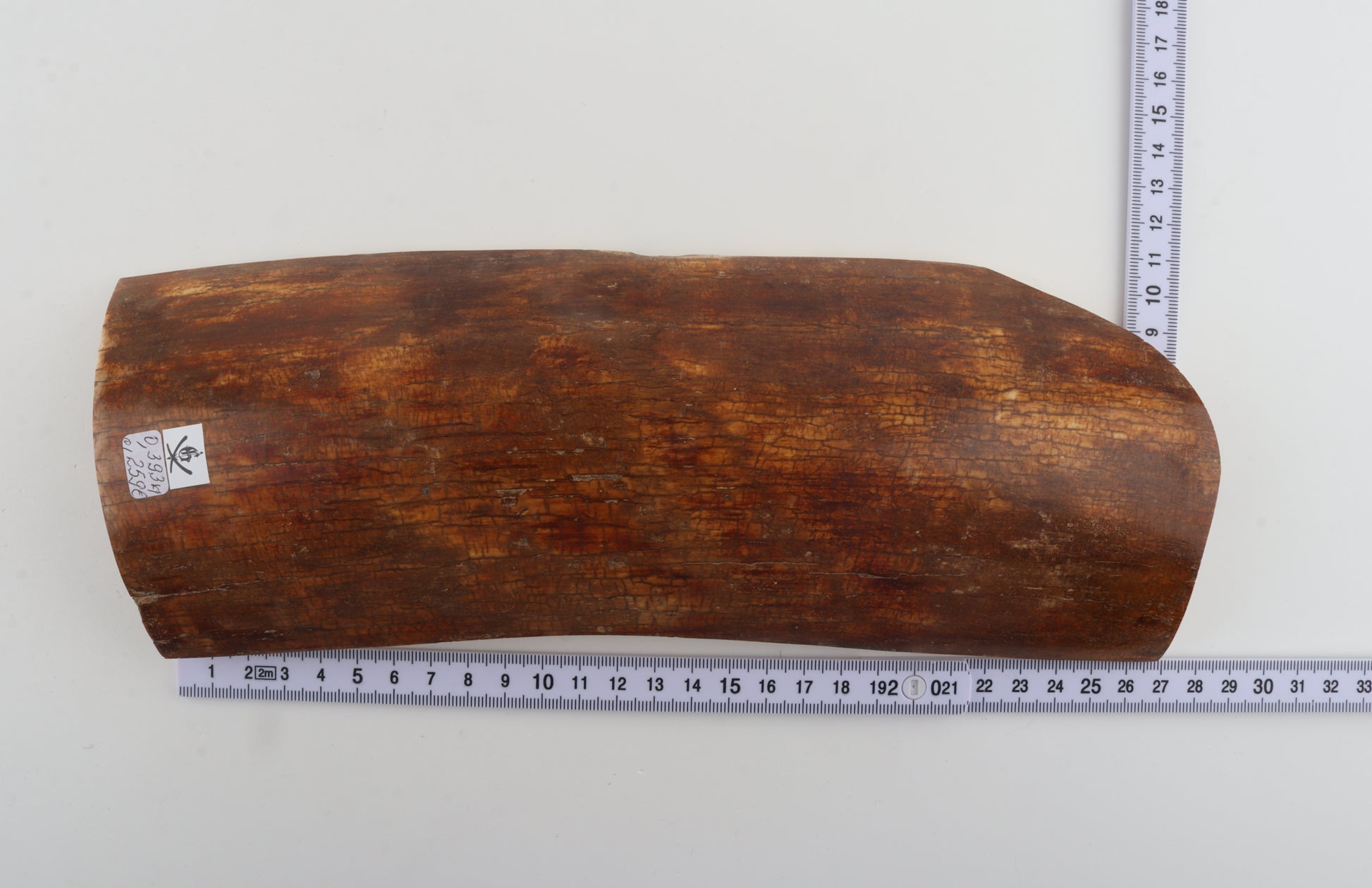 This is a premium-quality piece of Siberian woolly mammoth bark (Mammuthus primigenius). The ivory is naturally dense and solid, despite one small, non-penetrating crack. Tapered width: One cross-cut section is slightly wider than the other. Consistent thickness with reserves on both ends. This piece was cut at an angle - please carefully look at the pictures for precise dimensions. The natural colour of the bark is caramel.