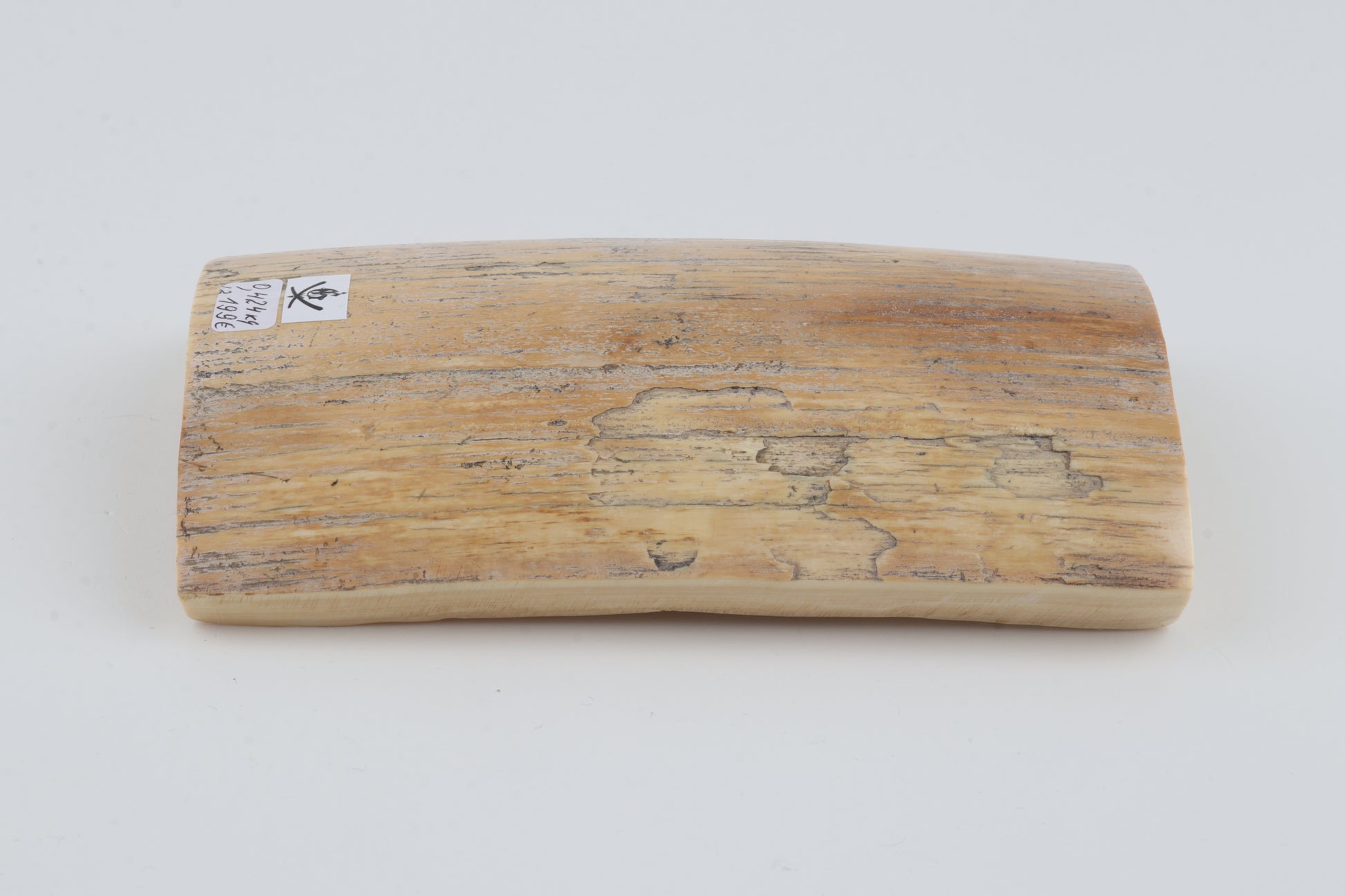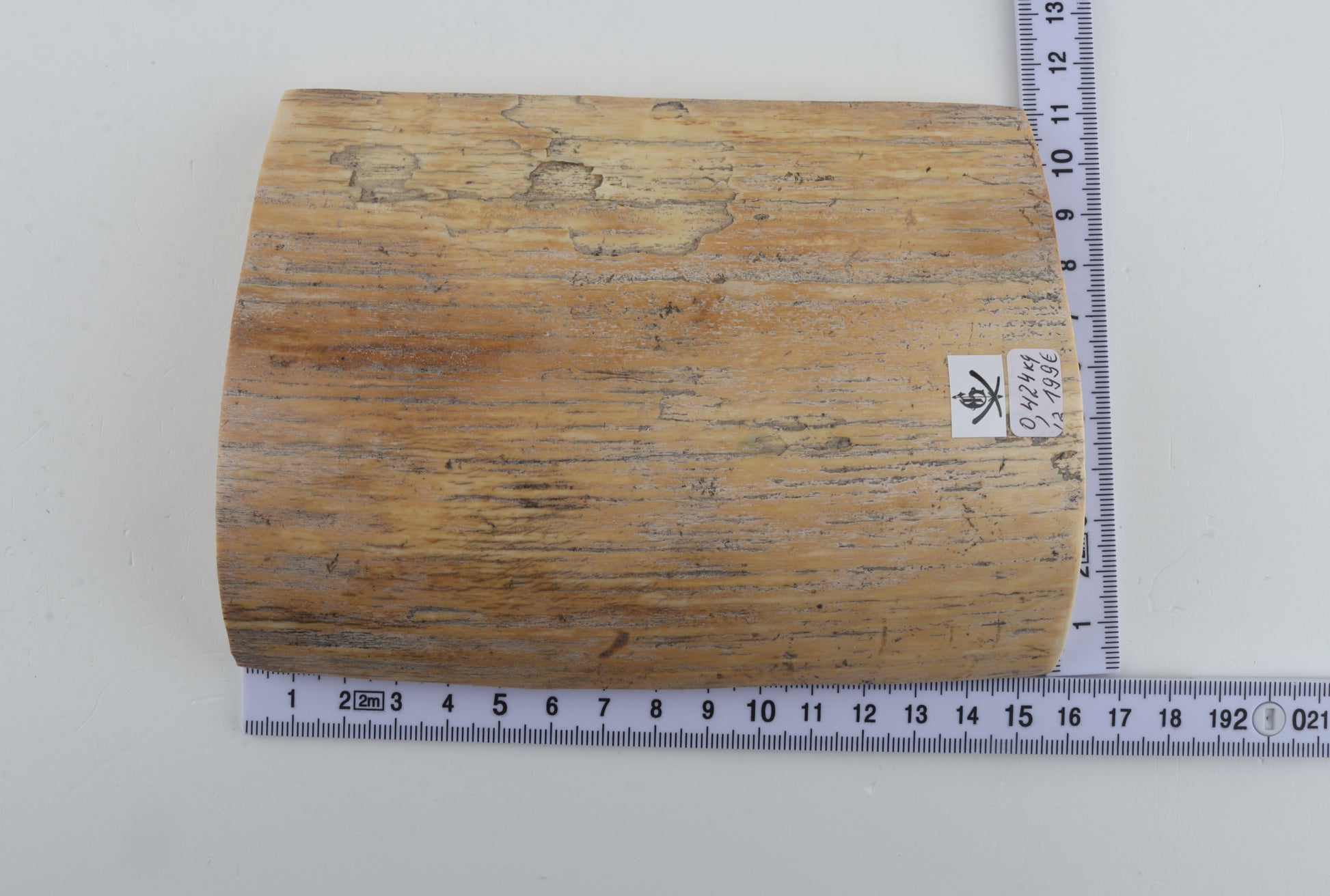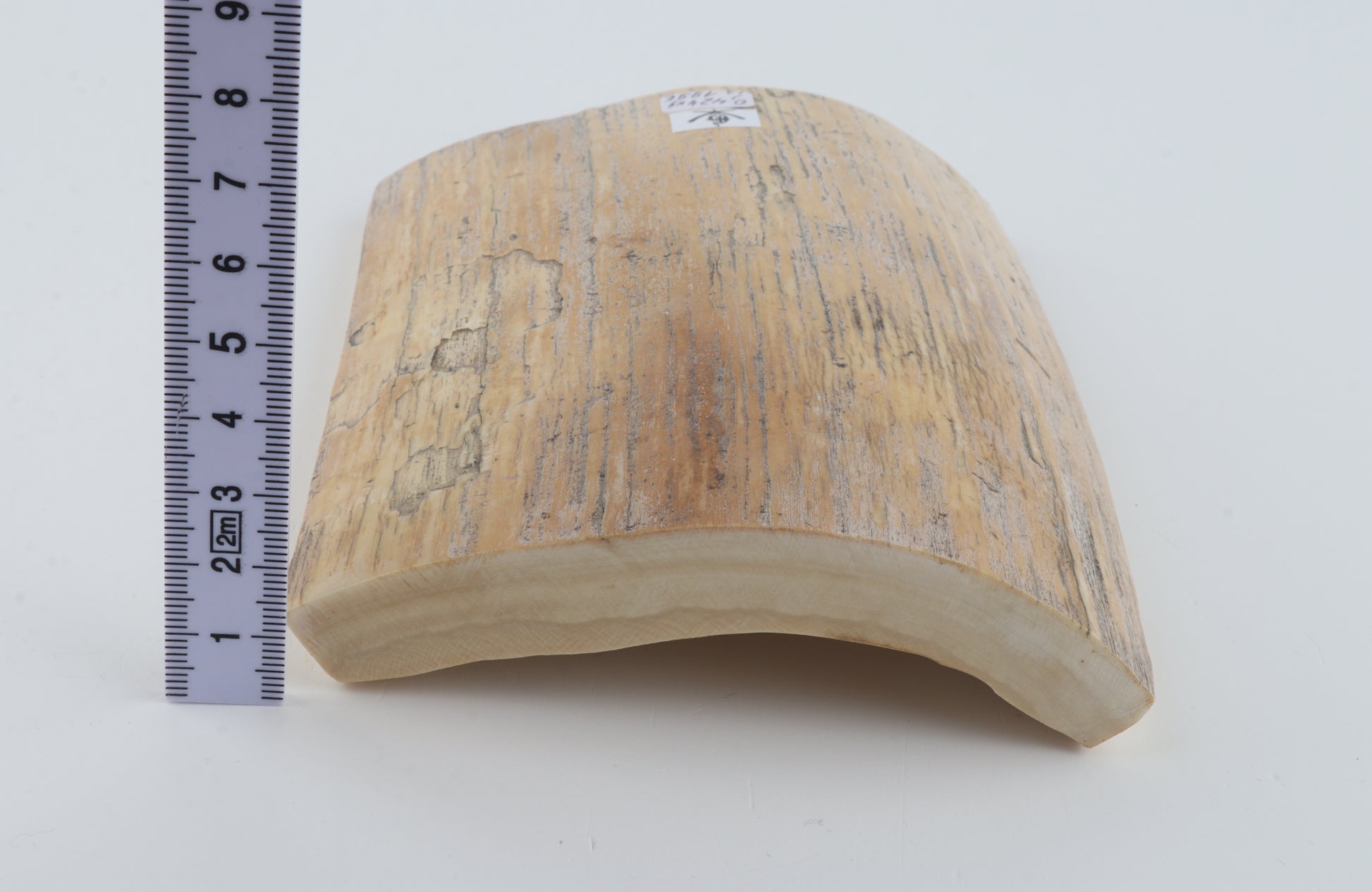 This is a premium-quality piece of Siberian woolly mammoth bark (Mammuthus primigenius). The ivory is naturally dense and solid, without cracks. Tapered thickness with reserves on both ends: One cross-cut section is thicker than the other. Consistent width with plenty of reserves on both ends. The natural colour of the bark is creme.