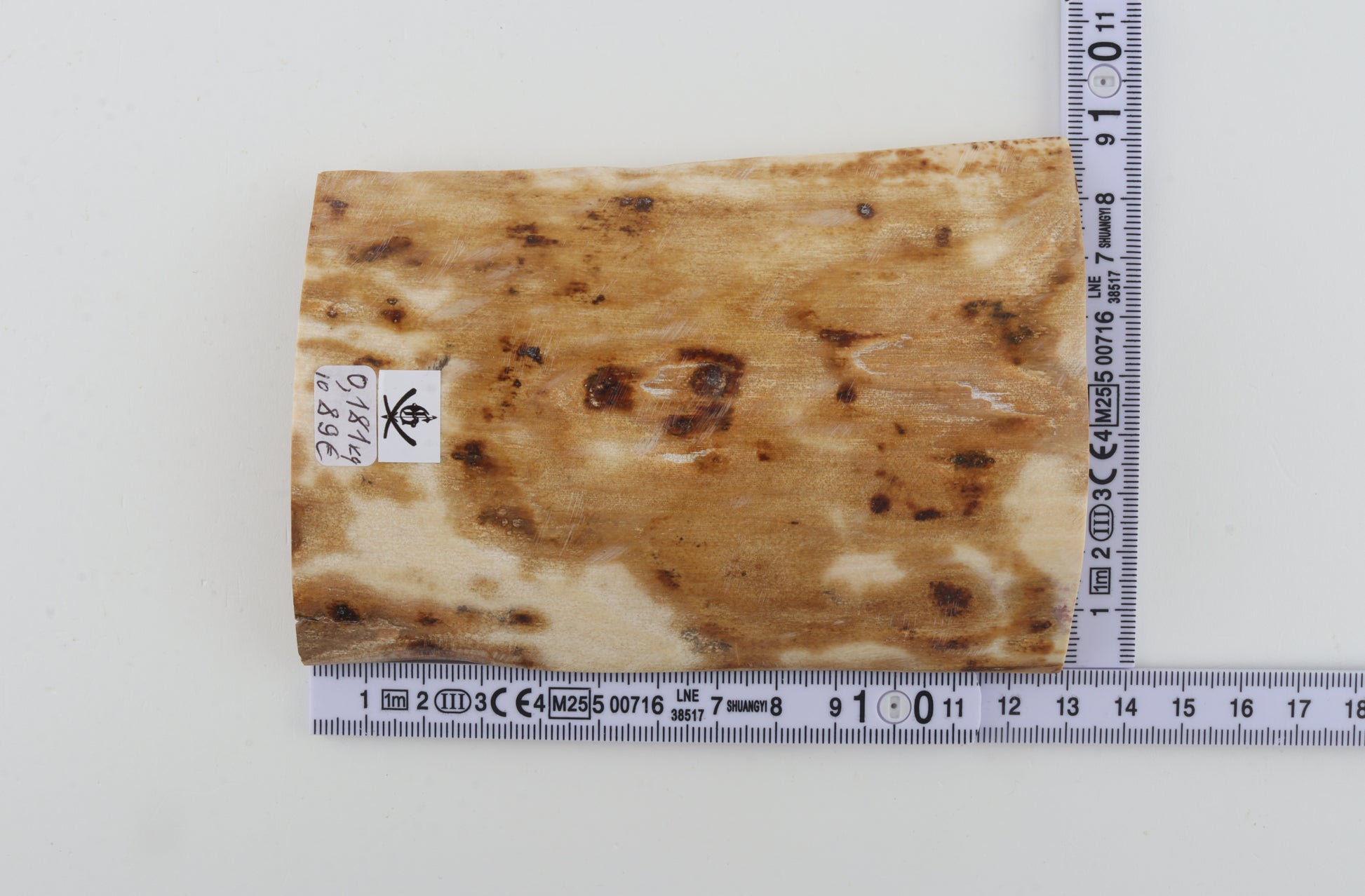 This is a top-quality piece of Siberian woolly mammoth bark (Mammuthus primigenius). The ivory is rock-solid despite some small cracks. One cross-cut section is slightly thicker and narrower than the other. Reserves on both ends. Please carefully look at the pictures for precise dimensions. The colour of the bark is creme-white.