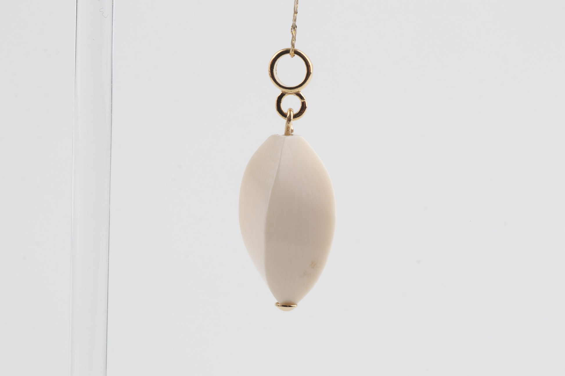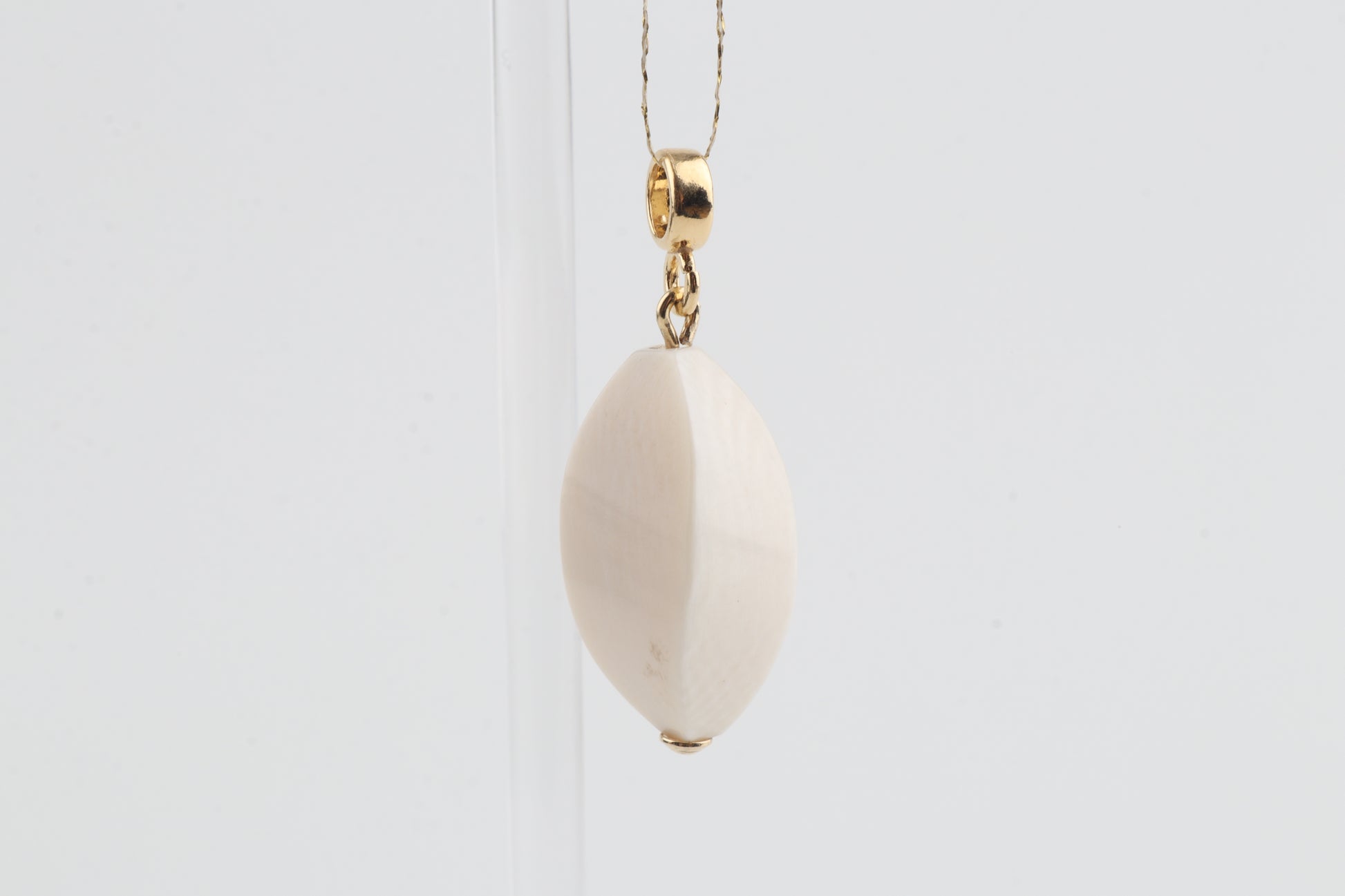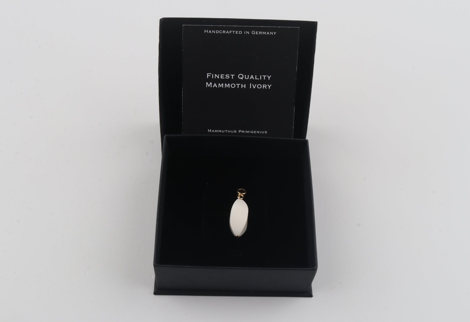 This elegant pendant features an oval of genuine mammoth ivory (Mammuthus primigenius), polished to a smooth satin finish that highlights the material’s natural creamy tone and fine grain.