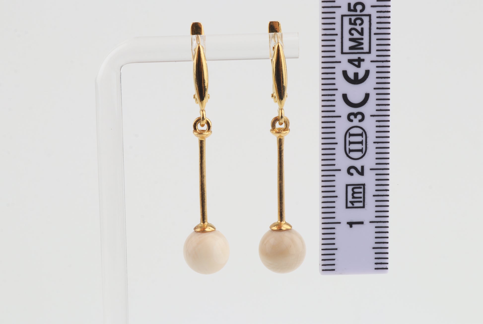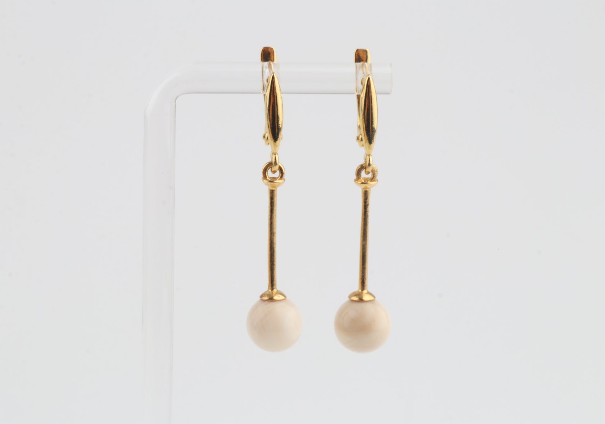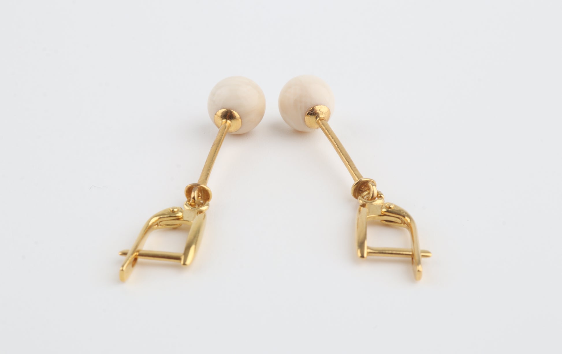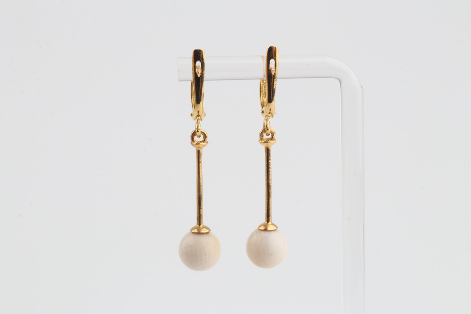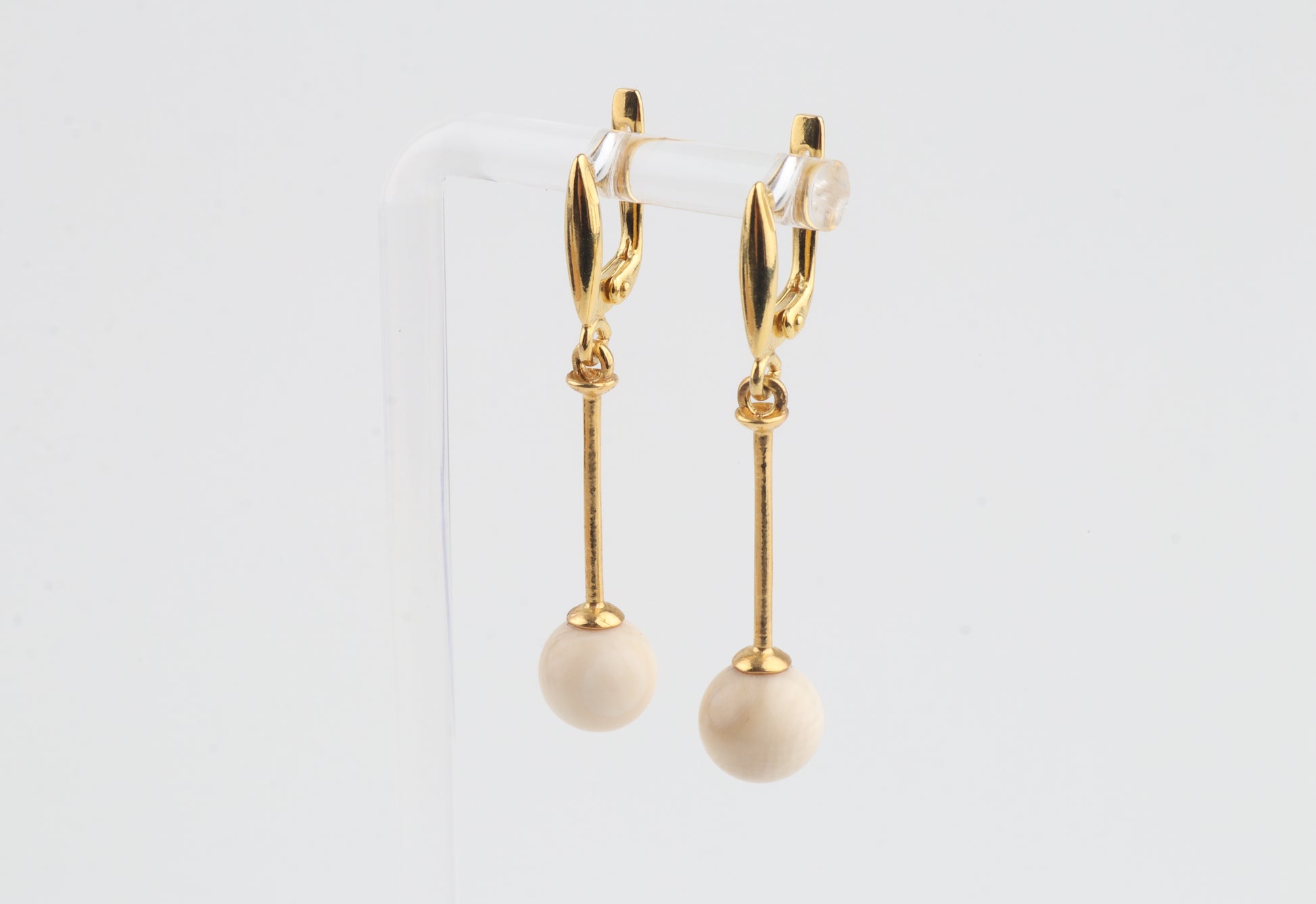 These elegant drop earrings feature mammoth ivory pearls (Mammuthus primigenius) suspended from slender gold-plated sterling silver bars with leverback closures. The clean, elongated design highlights the natural creamy tone of the mammoth ivory, creating a refined silhouette that moves gracefully with the wearer.