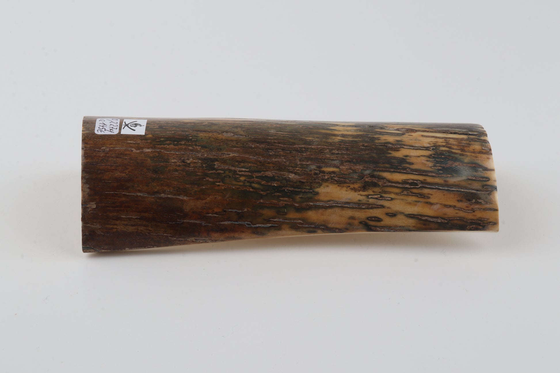 This is a premium-quality piece of Siberian woolly mammoth bark (Mammuthus primigenius). The ivory is naturally dense and solid, despite some small, non-penetrating cracks. Tapered thickness with reserves on both ends: One cross-cut section is thicker than the other. Consistent width with reserves on both ends. The natural color of the bark is green-beige