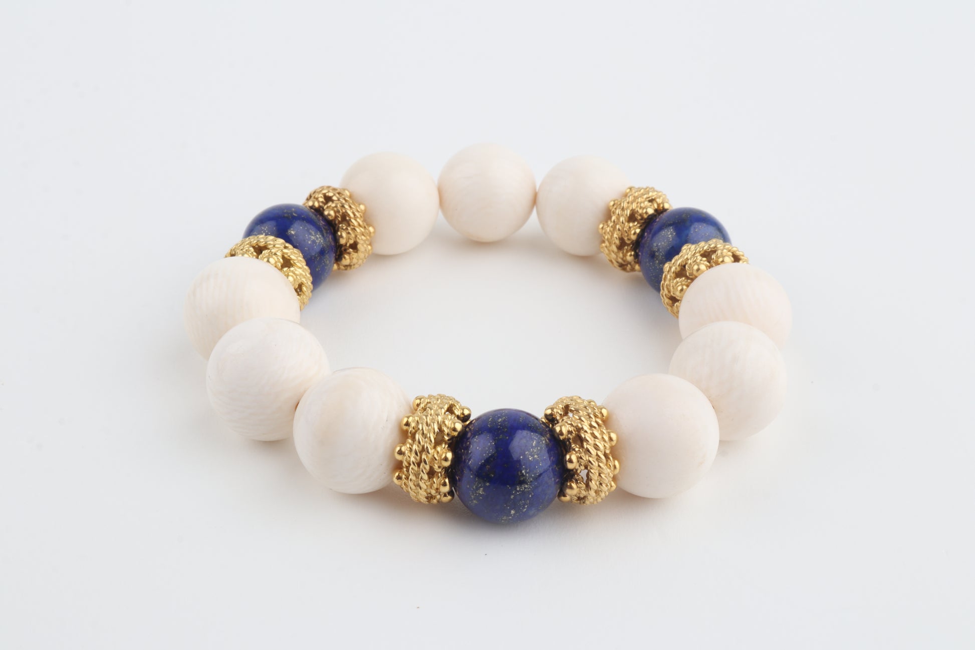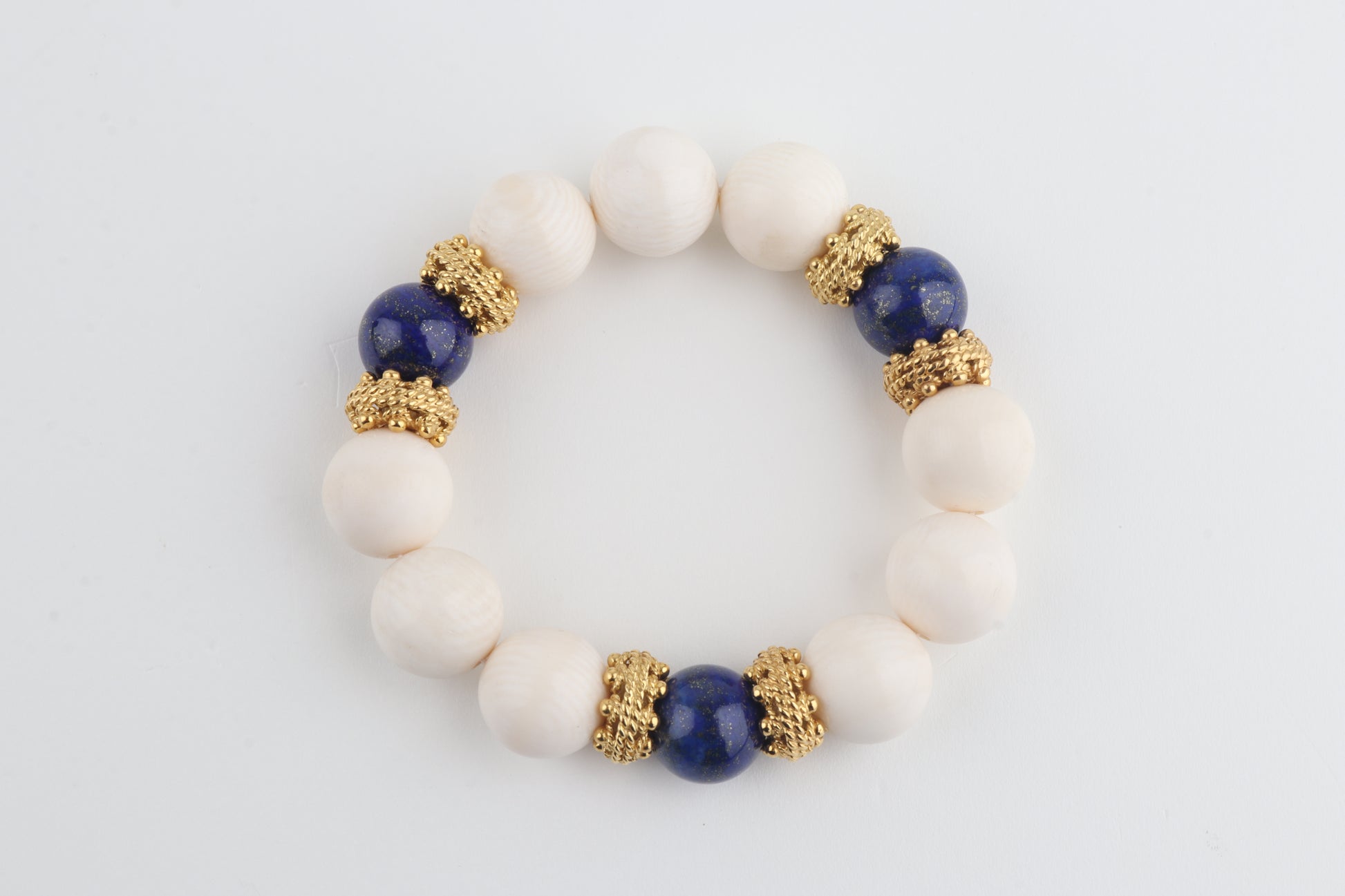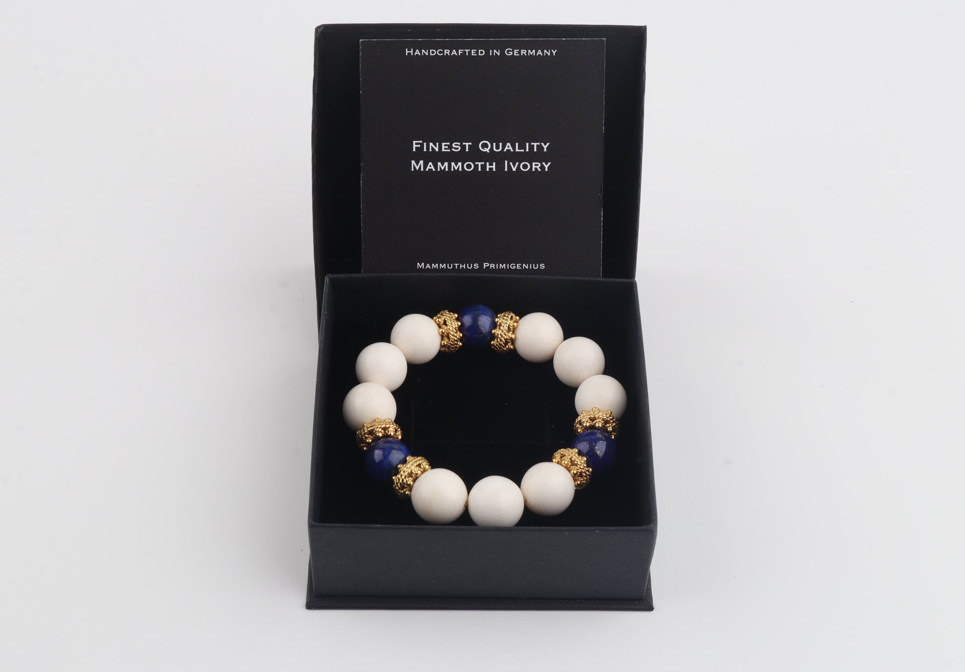 This exceptional statement bracelet pairs 12 mm mammoth ivory beads (Mammuthus primigenius) with their soft, creamy tones with rich cobalt-blue lapis lazuli spheres, framed by intricately detailed gold-plated sterling silver spacers. The contrast of pristine mammoth ivory and deep blue gemstone evokes a timeless aesthetic rooted in nature.