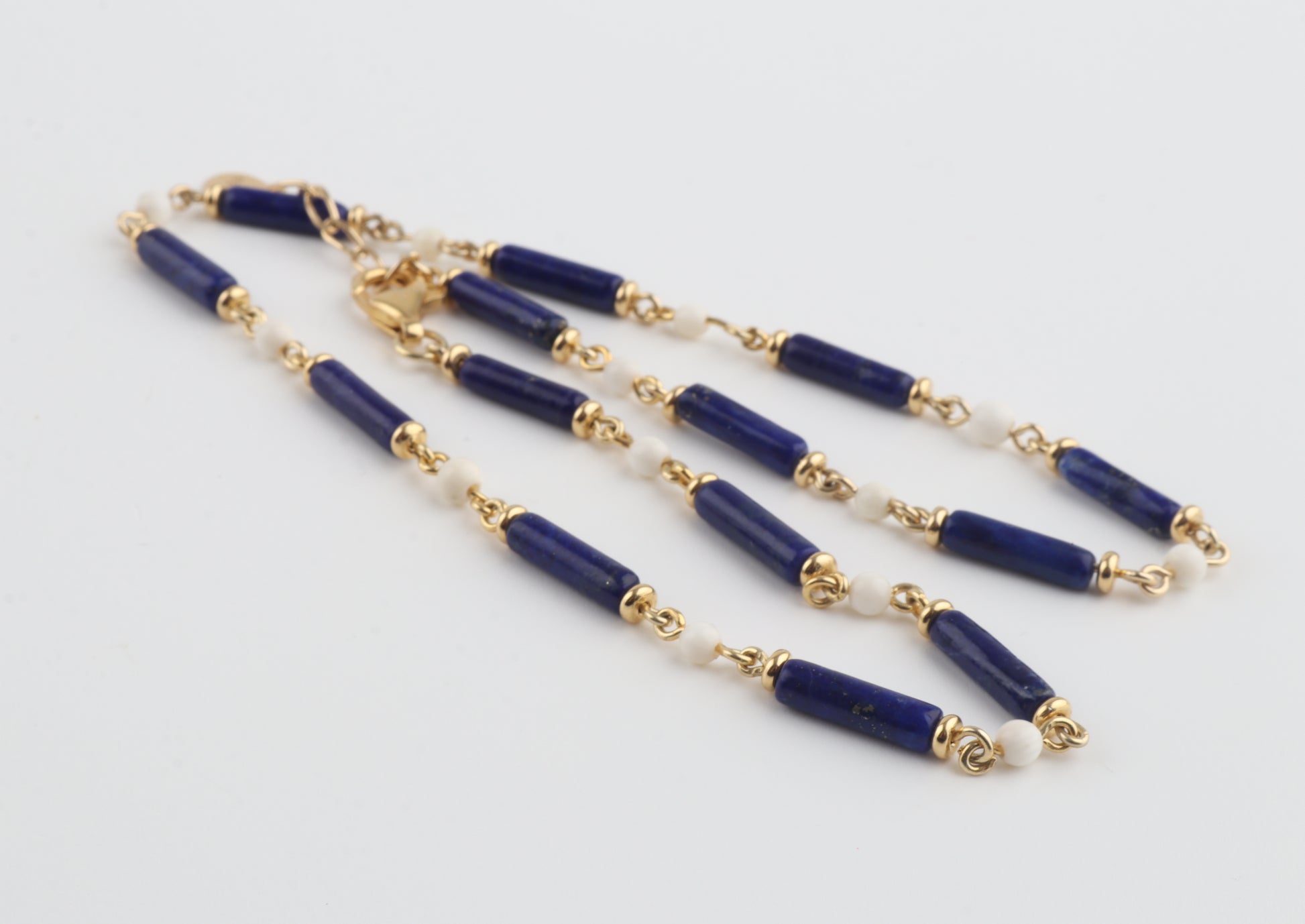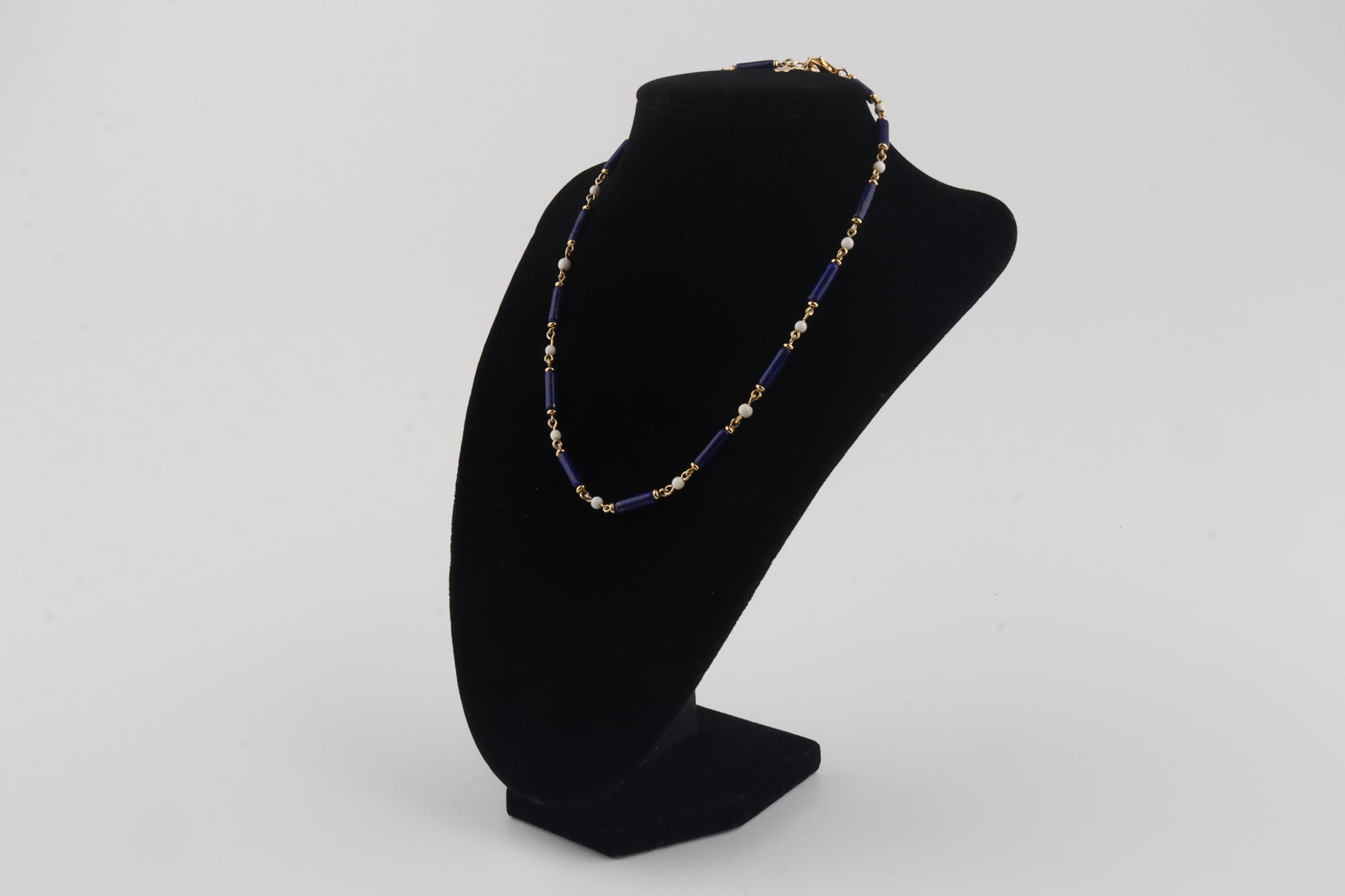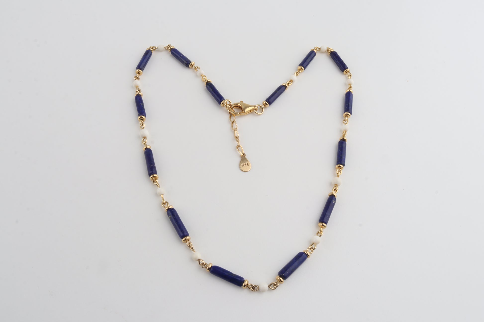 A striking combination of deep royal-blue lapis lazuli tubes and warm, creamy mammoth ivory beads (Mammuthus primigenius), handcrafted into an elegant choker necklace. Each component is individually linked with gold-plated sterling silver elements, giving the piece a refined, luxurious finish.