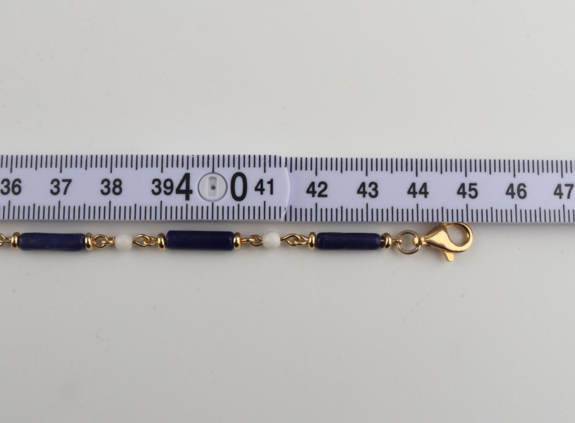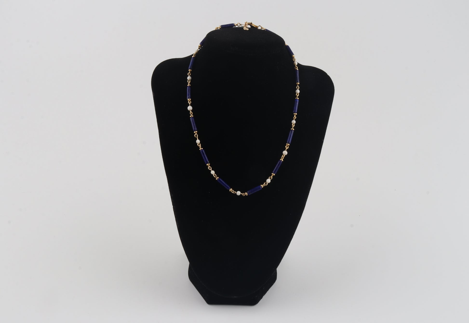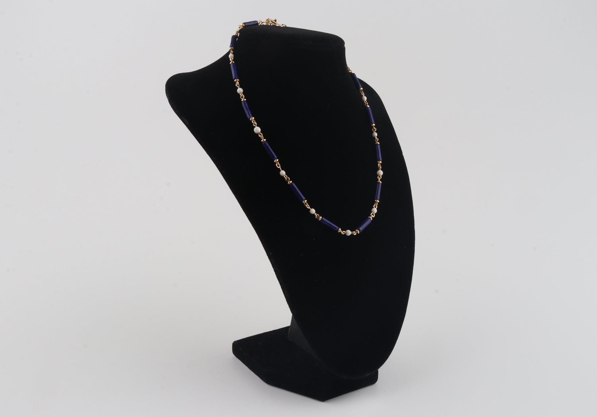 A striking combination of deep royal-blue lapis lazuli tubes and warm, creamy mammoth ivory beads (Mammuthus primigenius), handcrafted into an elegant choker necklace. Each component is individually linked with gold-plated sterling silver elements, giving the piece a refined, luxurious finish.
