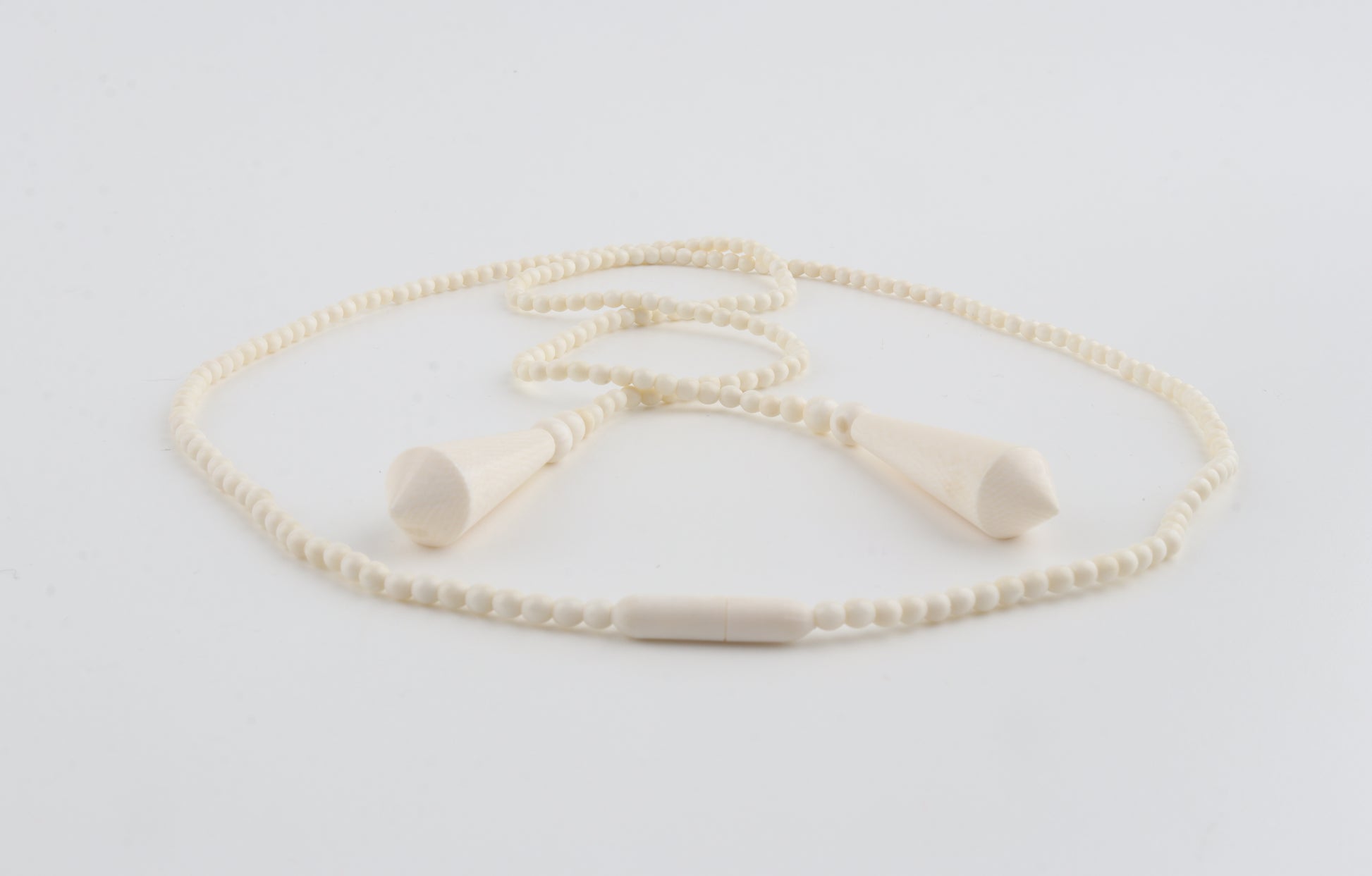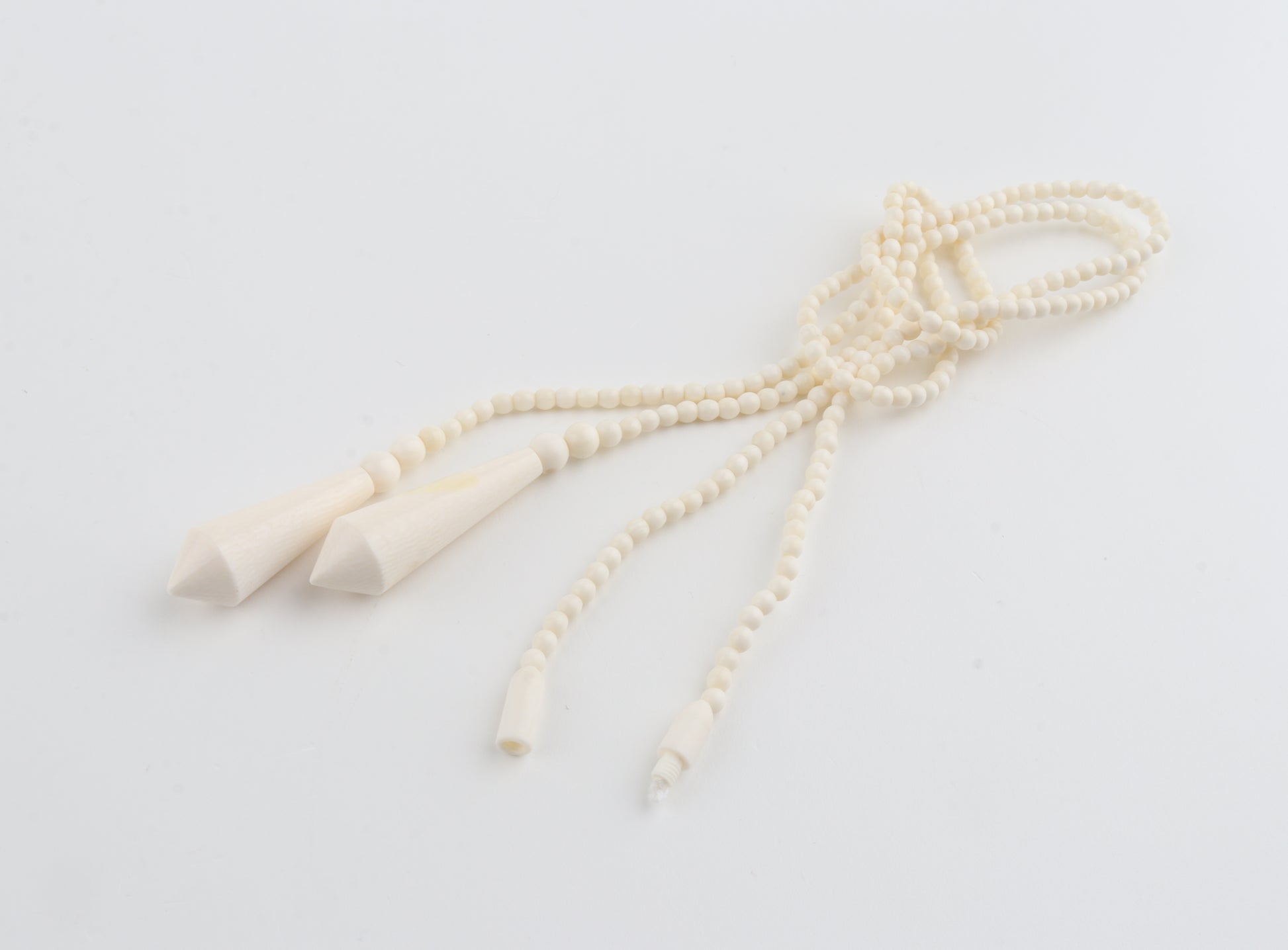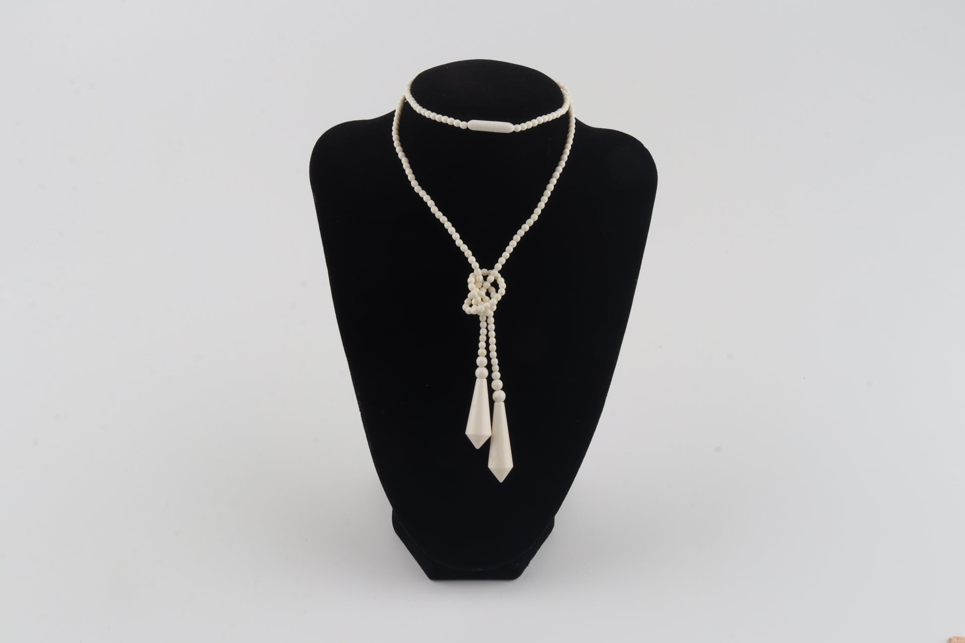 This elegant lariat necklace is crafted entirely from genuine mammoth ivory beads (Mammuthus primigenius), featuring a beautifully hand-tied center knot and two faceted ivory drops for a refined, elongated silhouette.