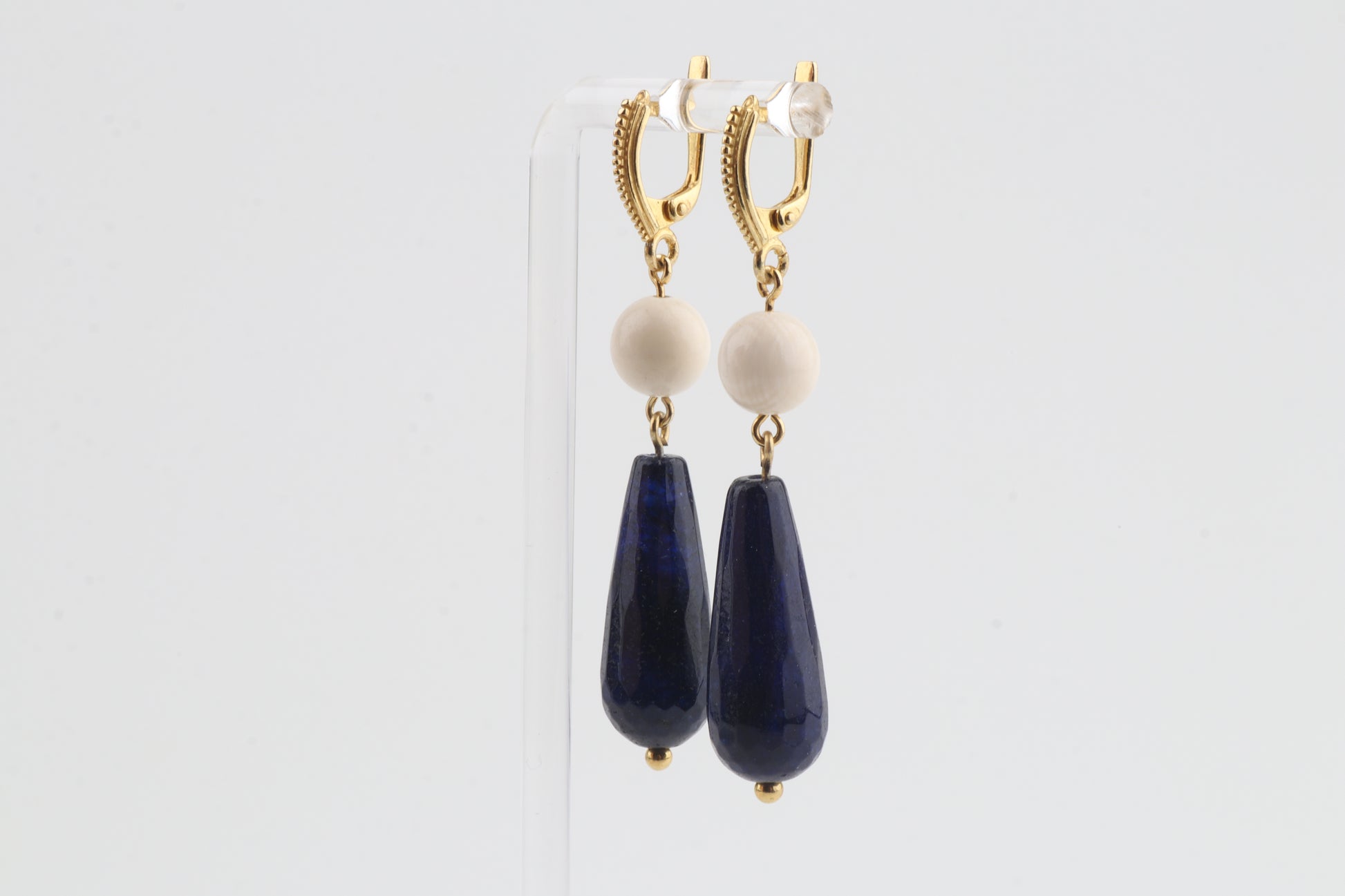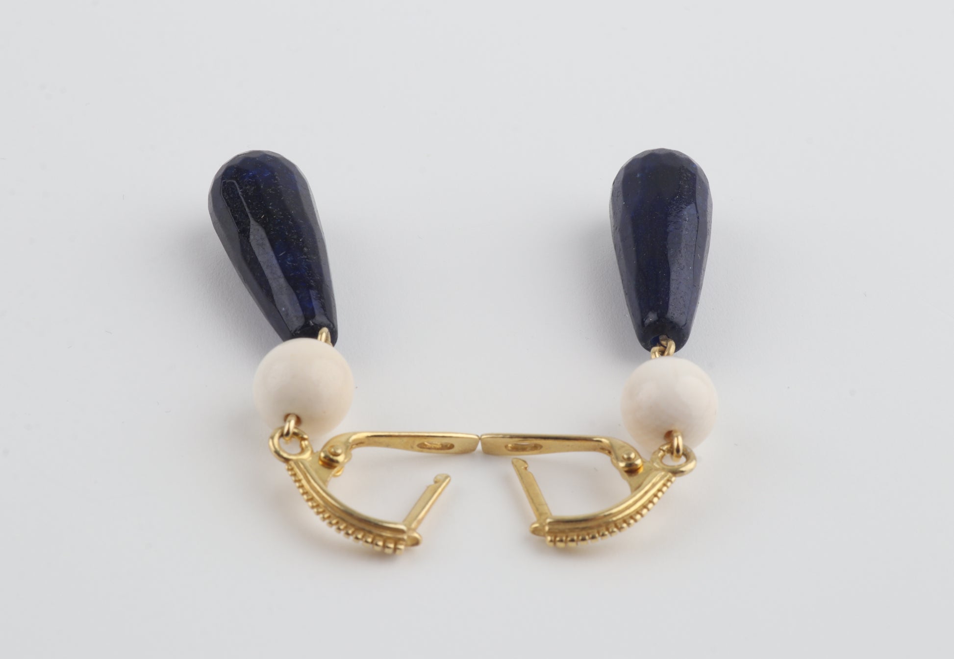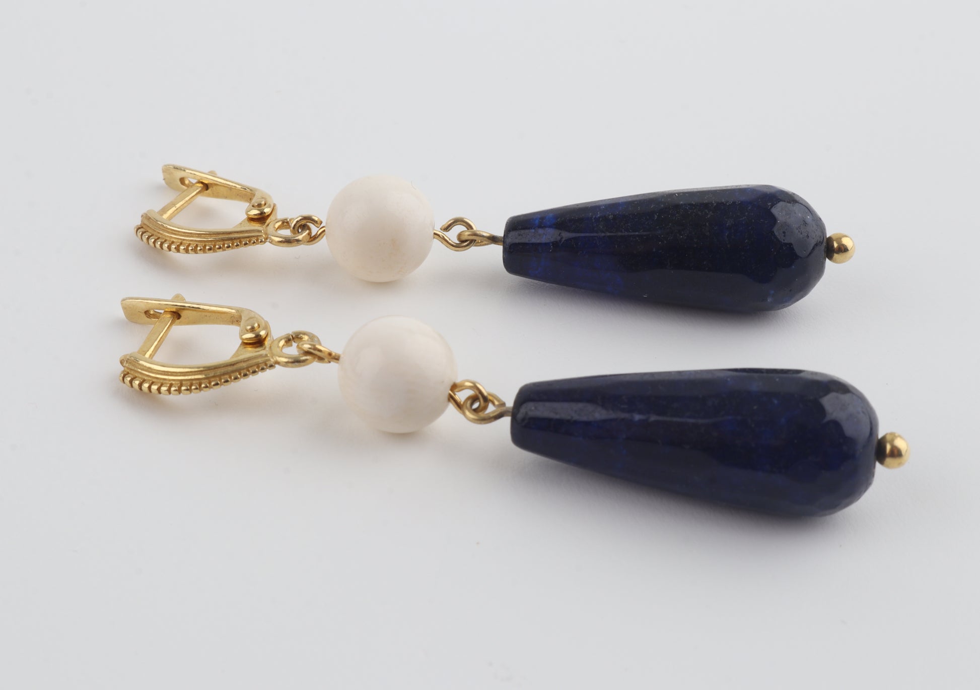 These drop earrings pair smooth 9 mm mammoth ivory beads (Mammuthus primigenius) with faceted blue agate teardrops. Their deep oceanic tones beautifully contrasted against the ivory’s soft, creamy warmth. Each element is connected by gold-plated sterling silver fittings.