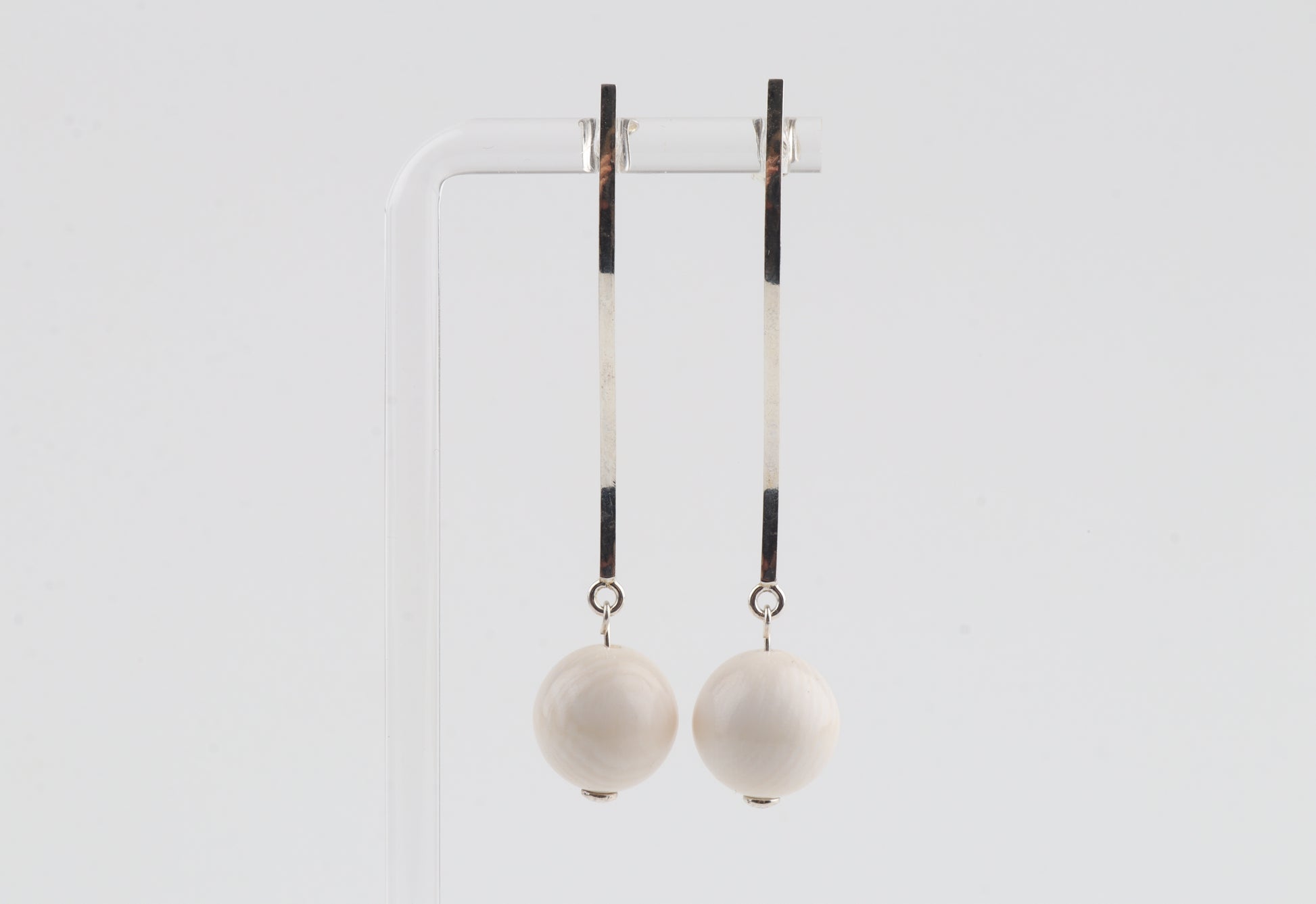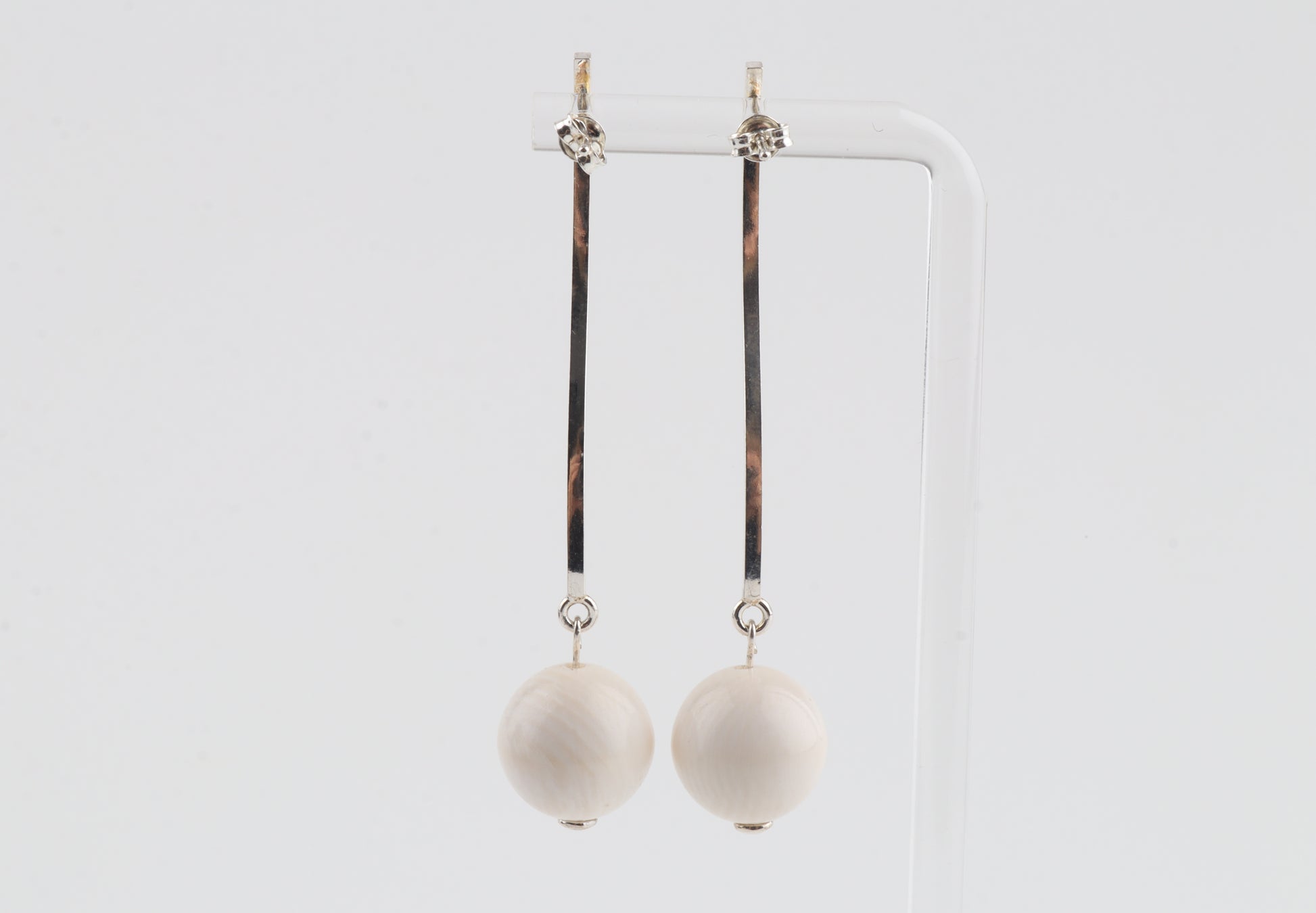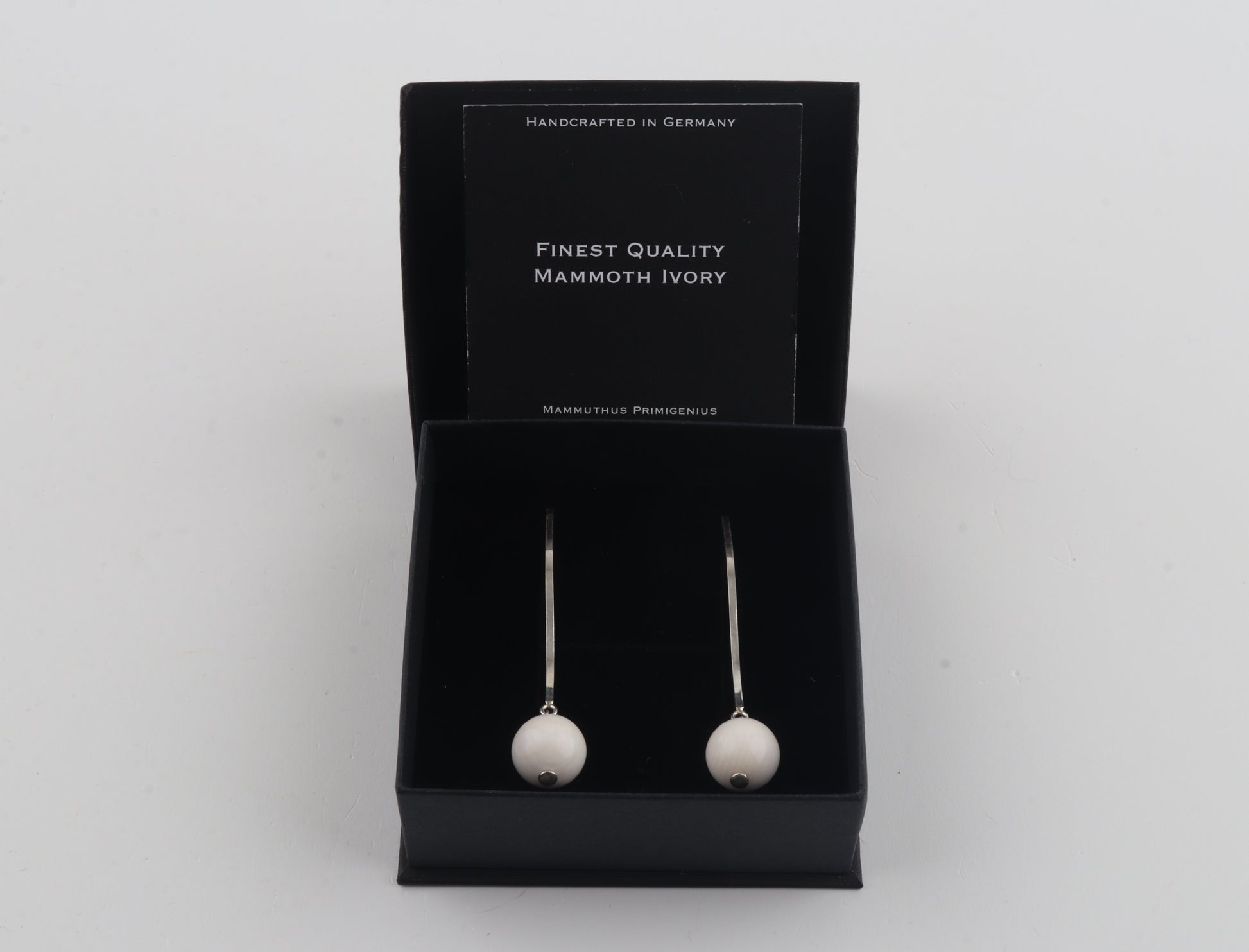 These sleek, modern earrings feature mammoth ivory spheres (Mammuthus primigenius) suspended from long, elegant sterling-silver studs. The minimalist linear design brings a refined contrast between the cool shine of silver and the warm, natural tone of mammoth ivory. Lightweight yet striking, they offer an effortlessly sophisticated look suitable for both everyday wear and special occasions.