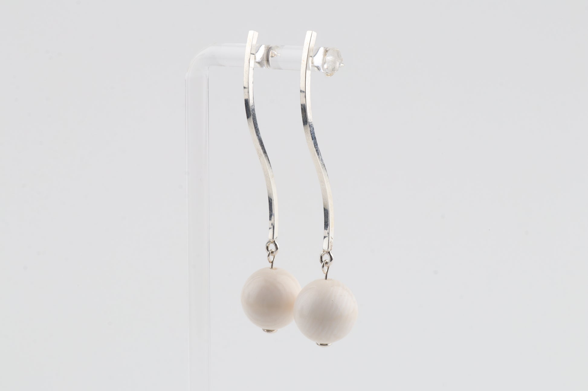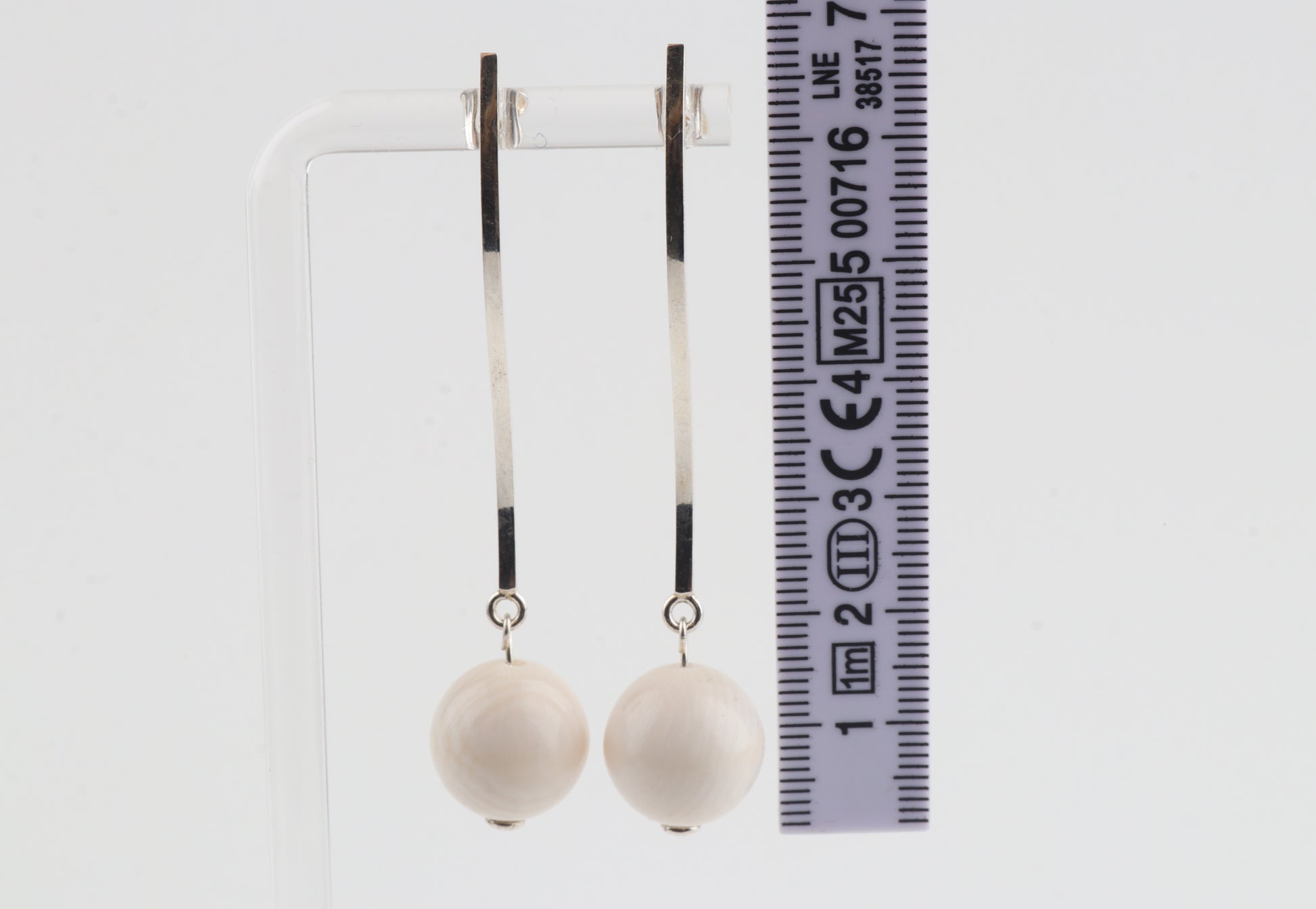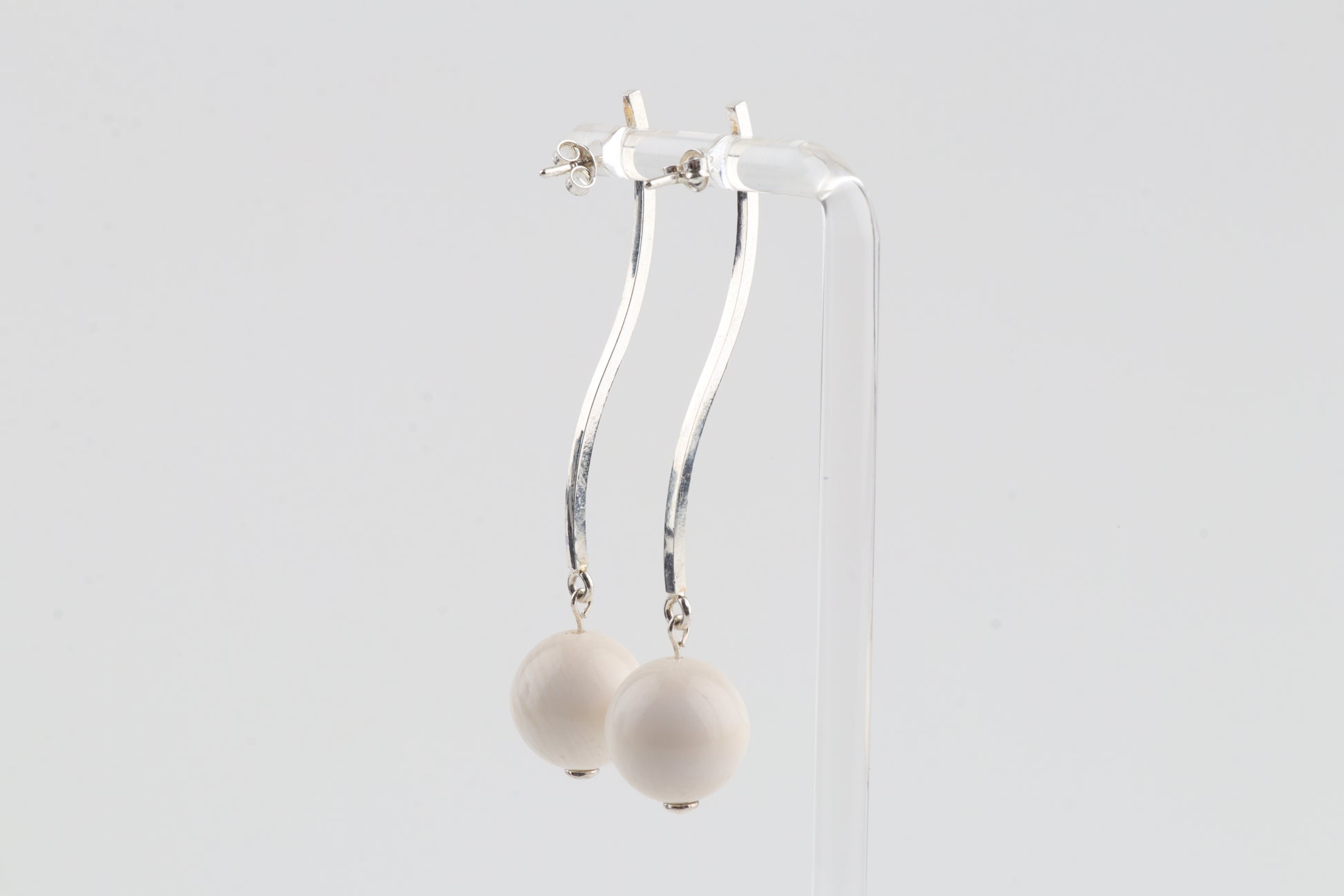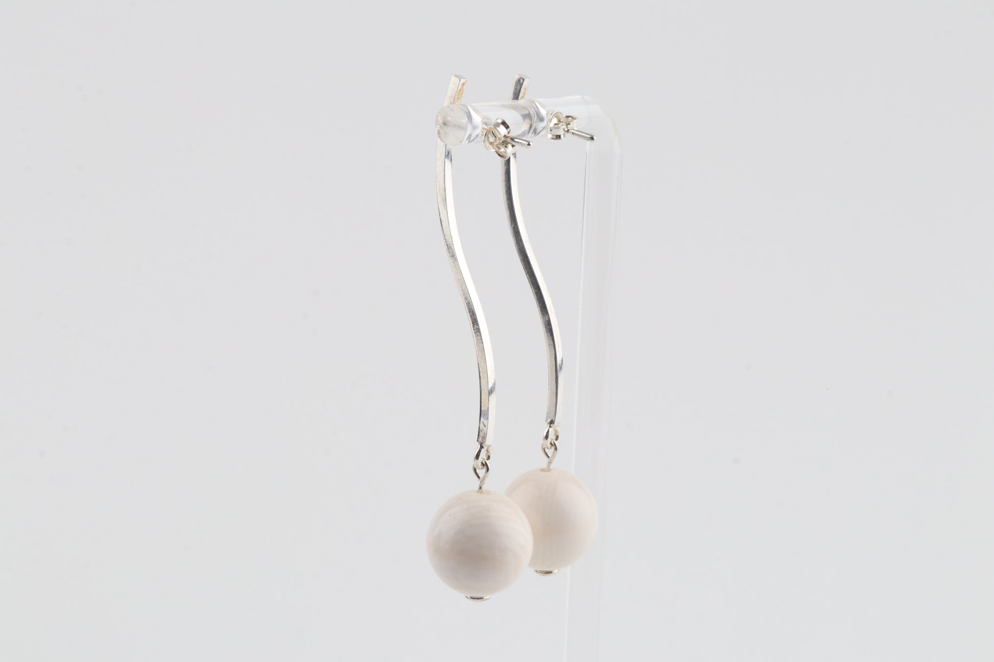 These sleek, modern earrings feature mammoth ivory spheres (Mammuthus primigenius) suspended from long, elegant sterling-silver studs. The minimalist linear design brings a refined contrast between the cool shine of silver and the warm, natural tone of mammoth ivory. Lightweight yet striking, they offer an effortlessly sophisticated look suitable for both everyday wear and special occasions.