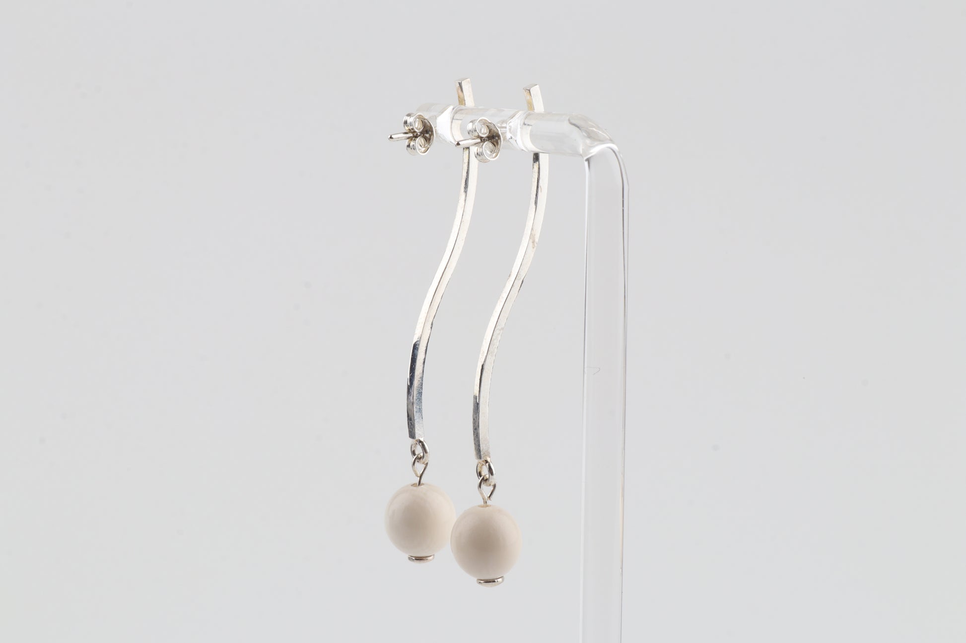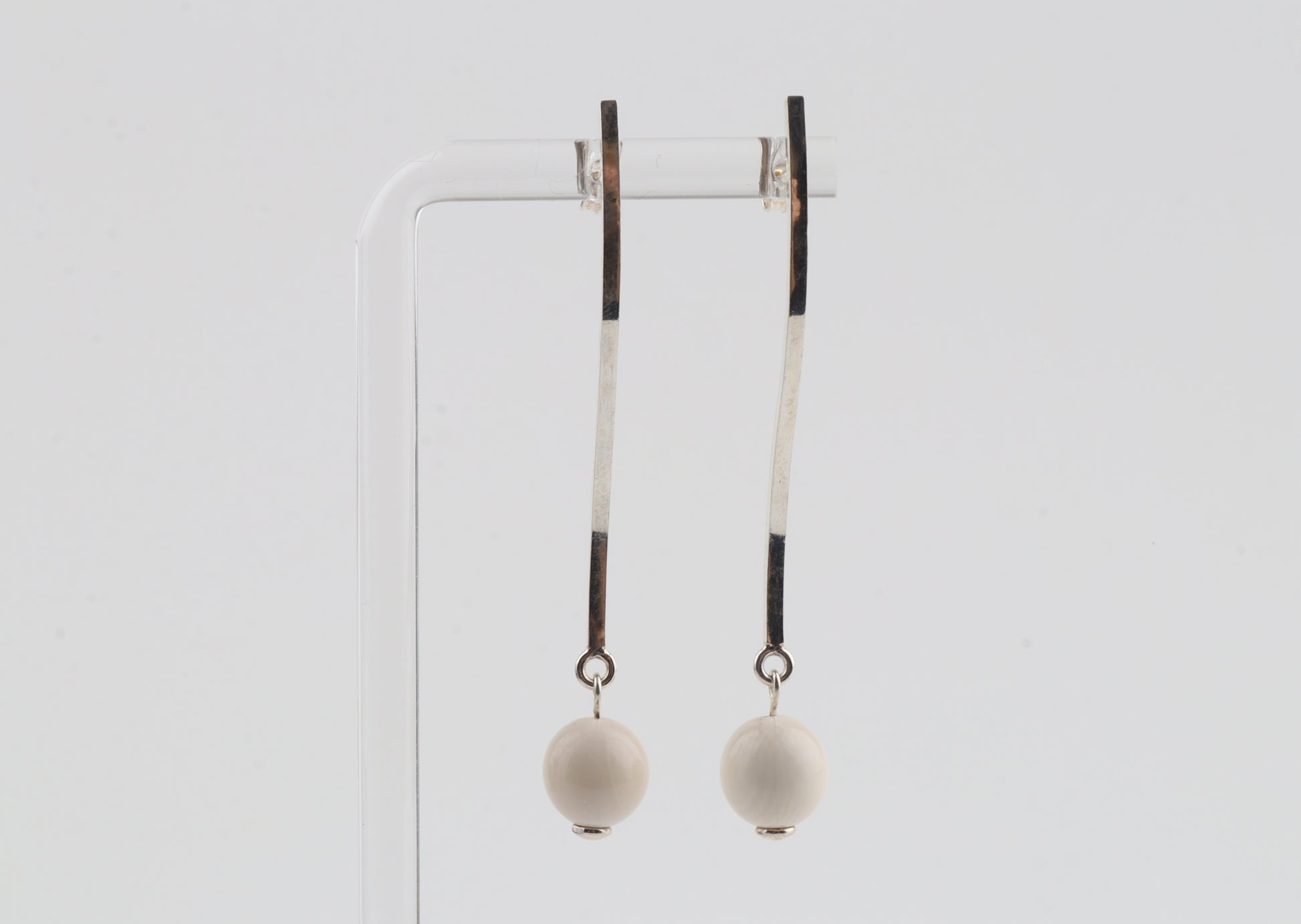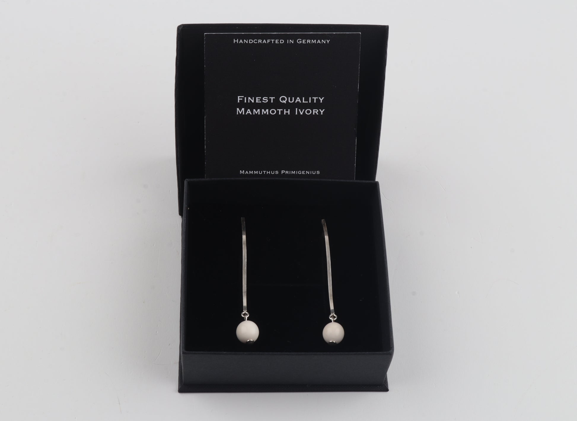These refined earrings feature 9mm mammoth ivory spheres (Mammuthus primigenius) suspended from long, slender sterling silver studs. The minimalist design creates a graceful, elongated silhouette, while the warm ivory tone offers a soft contrast to the cool shine of silver.
