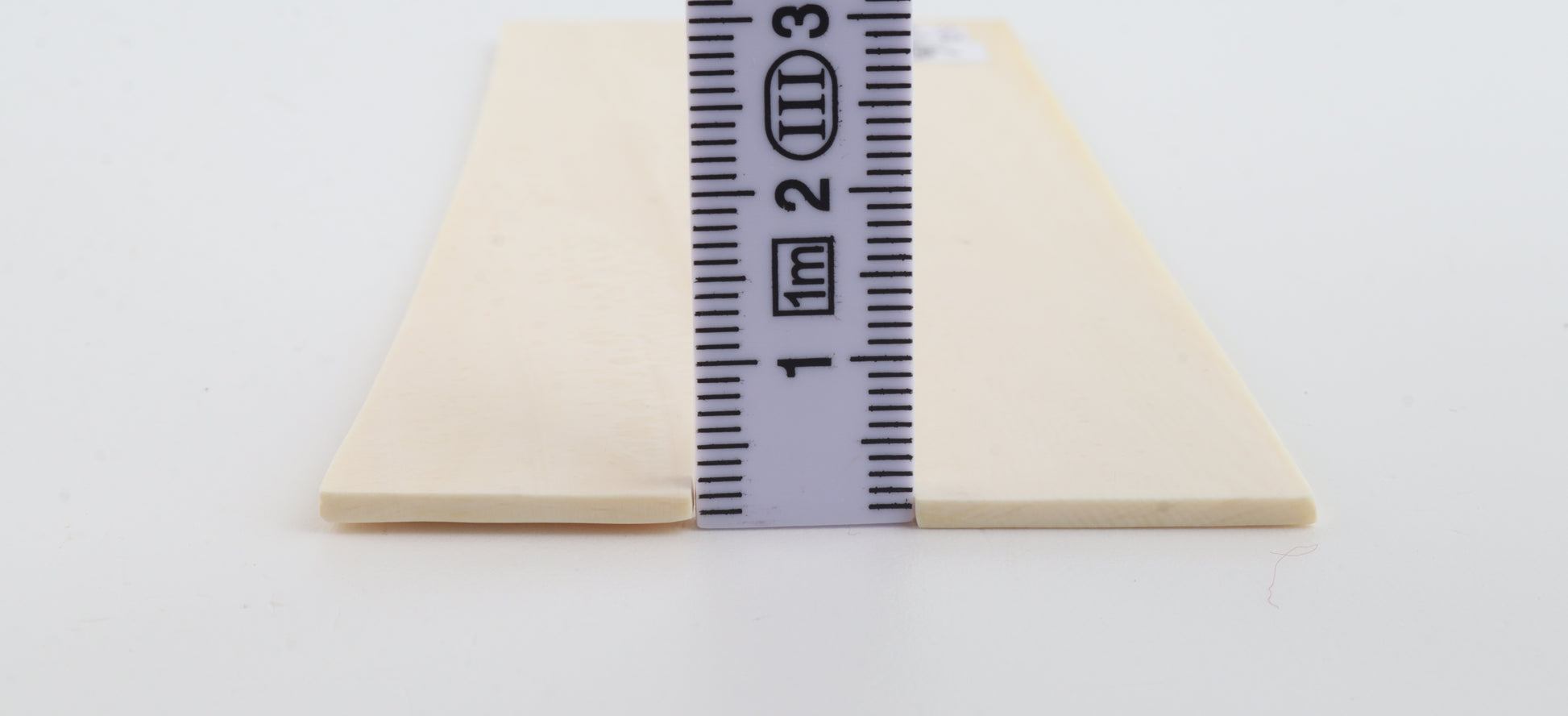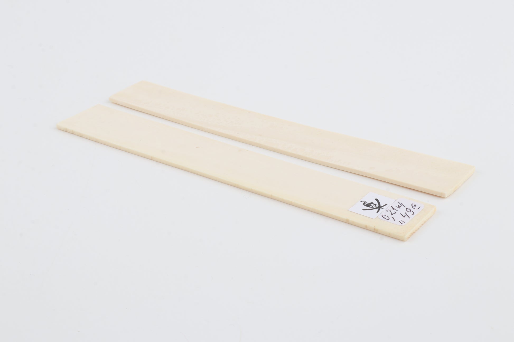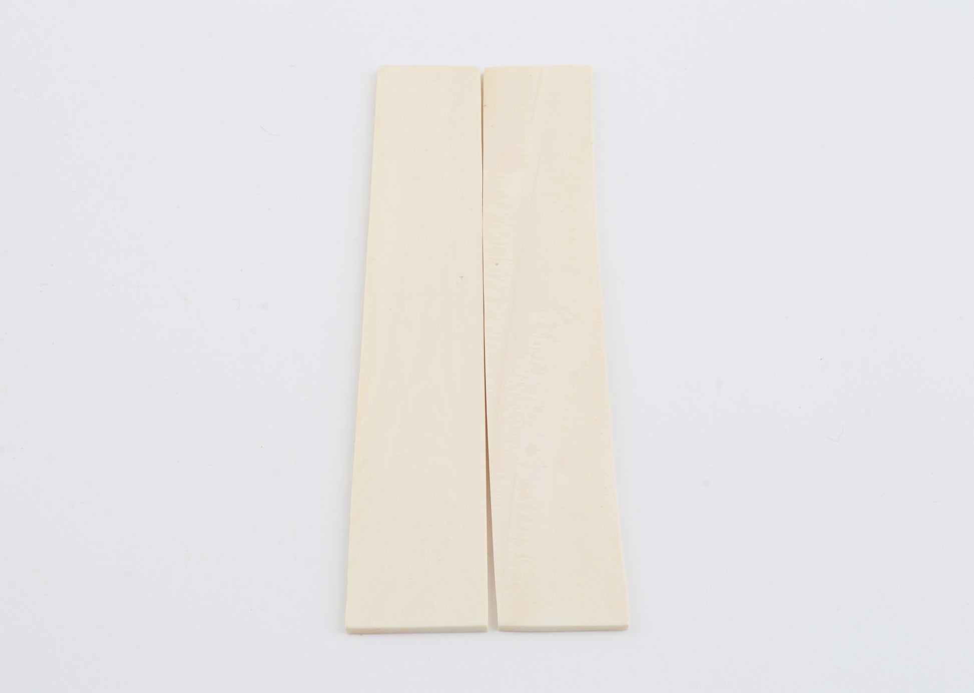 This is a pre-cut pair of natural woolly mammoth ivory scales (Mammuthus primigenius). These scales are in an immaculate condition. The ivory is dry and without cracks. Consistent width and thickness with reserves on both ends. The undersides are flat. These pieces display the typical ivory tone.