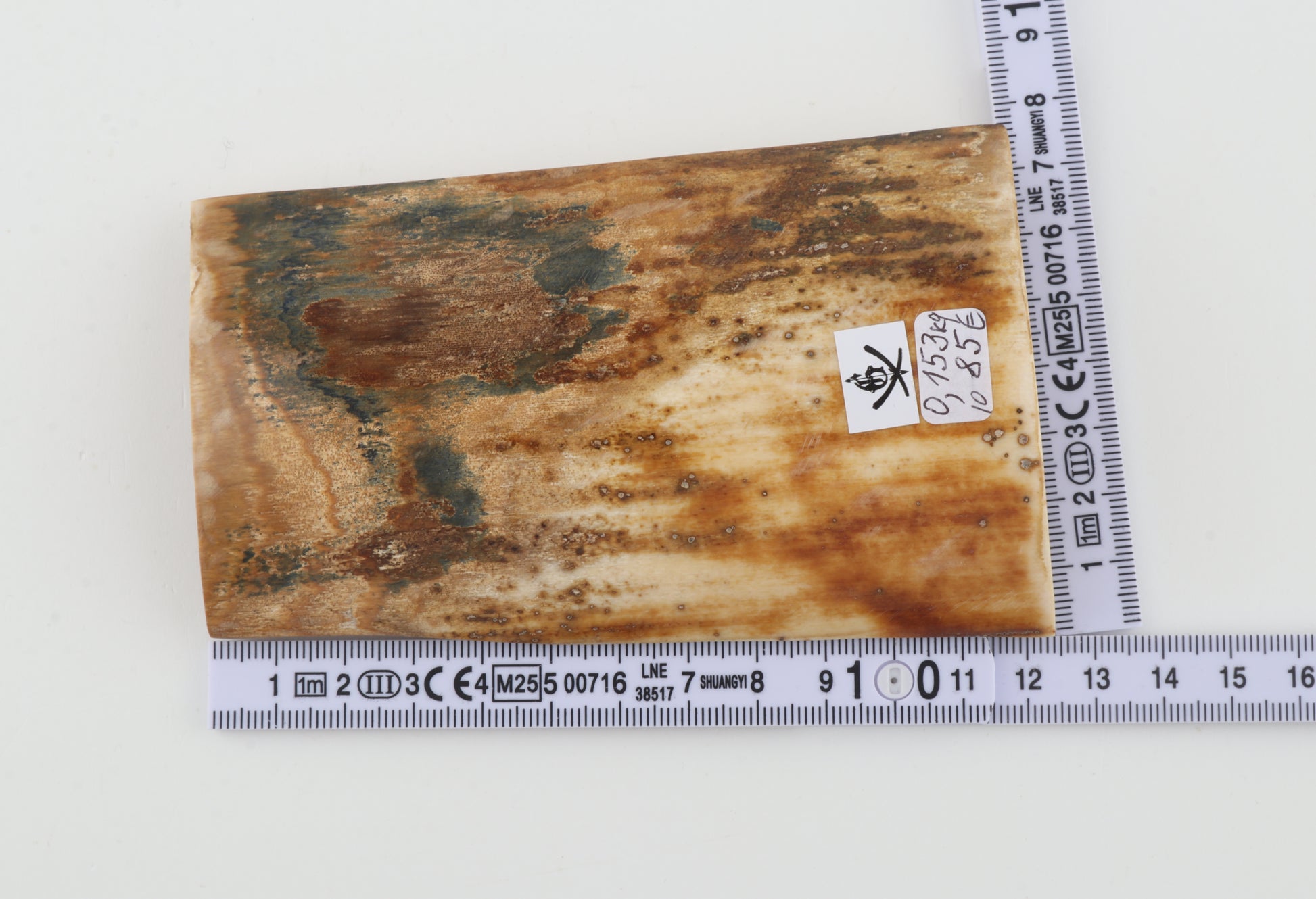 This is a top-quality piece of Siberian woolly mammoth bark (Mammuthus primigenius). The ivory is rock-solid without cracks. One cross-cut section is thicker and wider than the other. Reserves on both ends. Please carefully look at the pictures for precise dimensions. The colour of the bark is a mix of orange, blue and brown.