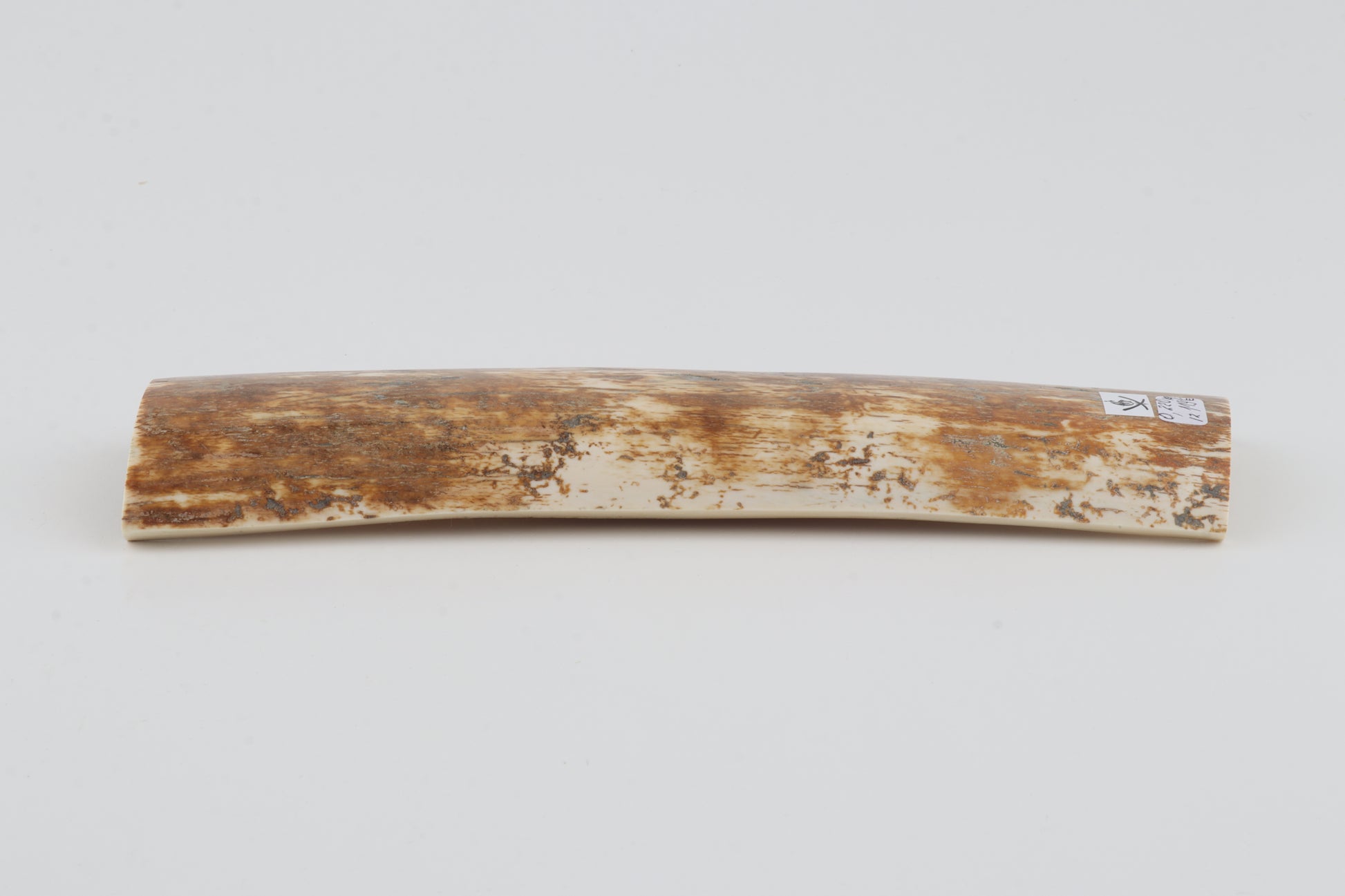 This is a premium-quality piece of Siberian woolly mammoth bark (Mammuthus primigenius). The ivory is naturally dense and solid, despite some small cracks. Tapered thickness: One cross-cut section is slightly thinner than the other. Consistent width with reserves on both ends. The natural colour of the bark is a mix of orange, ivory and beige.