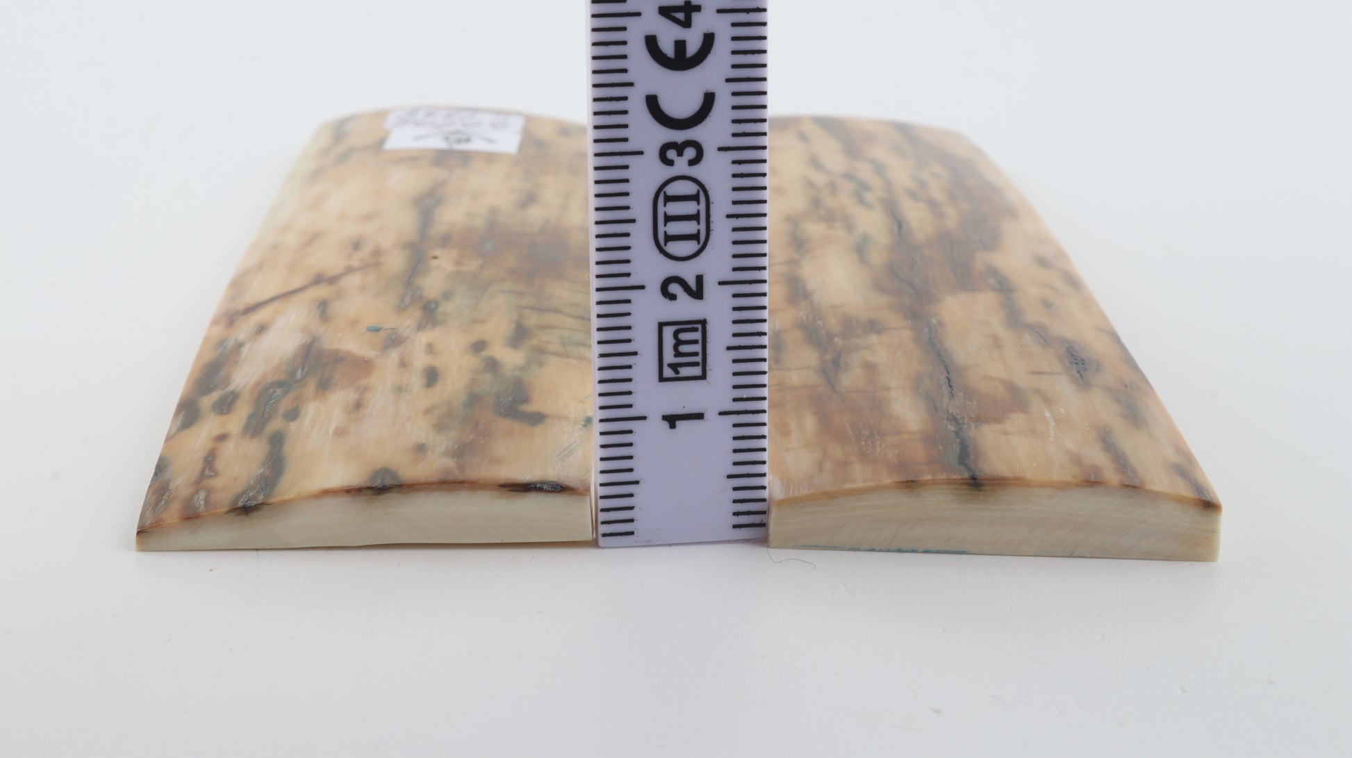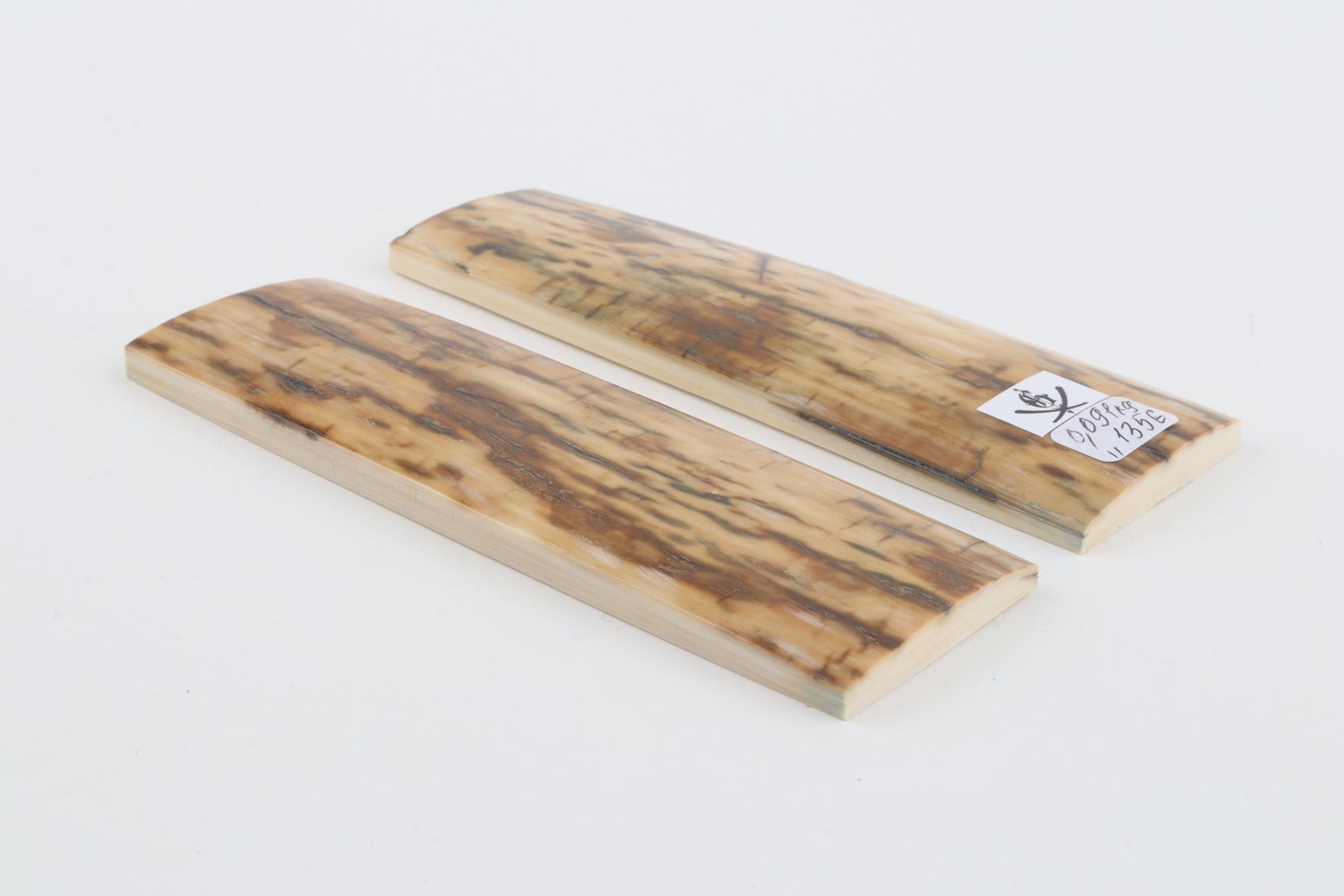 This is a pre-cut pair of natural woolly mammoth bark scales (Mammuthus primigenius) in immaculate condition. They feature consistent width and thickness with reserves on both ends, and the undersides are flat. The bark displays a cream color with brownish spots and streaks.