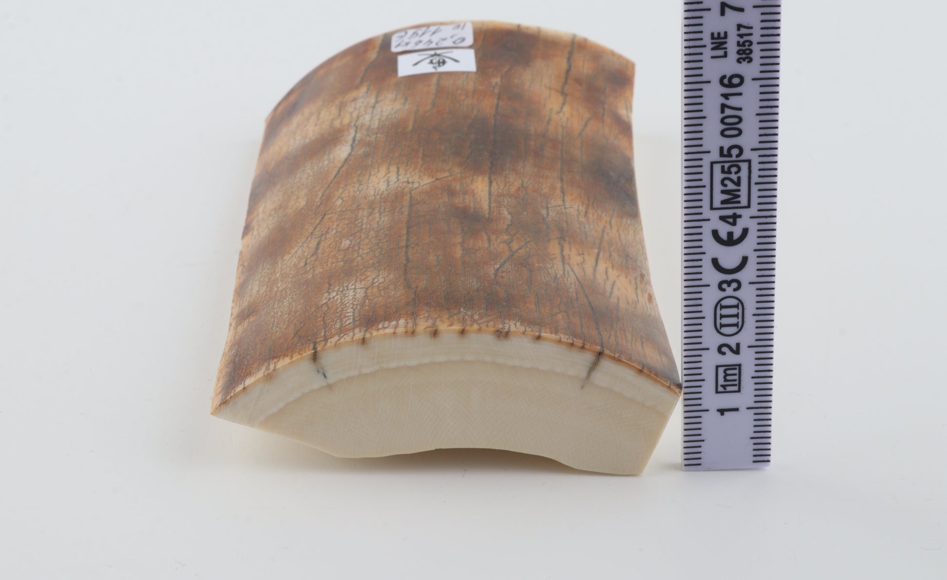This is a premium-quality piece of Siberian woolly mammoth ivory (Mammuthus primigenius). The ivory is naturally dense and solid, despite some small cracks. Tapered width and thickness: One cross-cut section is thicker and narrower than the other. Plenty of reserves on both ends. Please carefully look at the pictures for precise dimensions. The piece displays its original, natural ivory tone. The colour of the outer layer of bark is brown-orange.