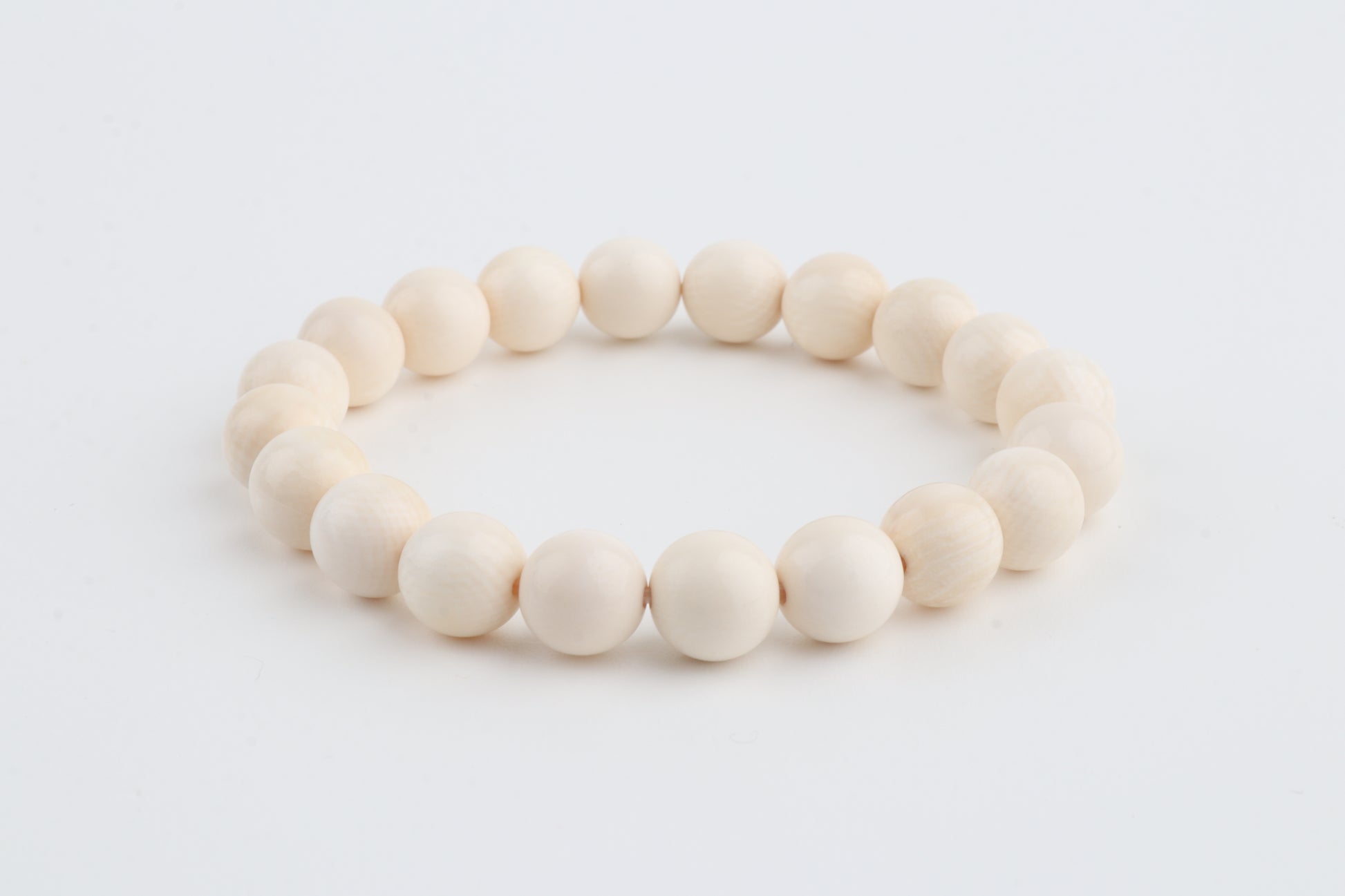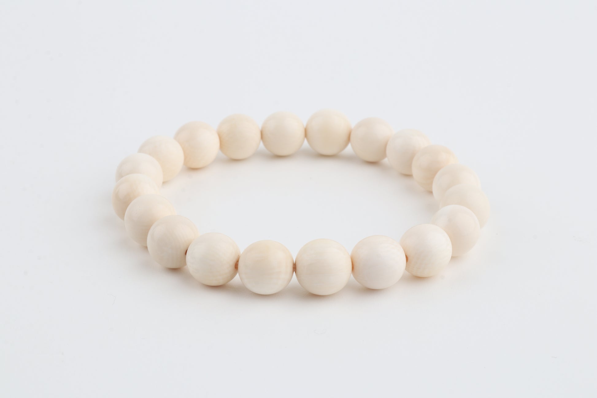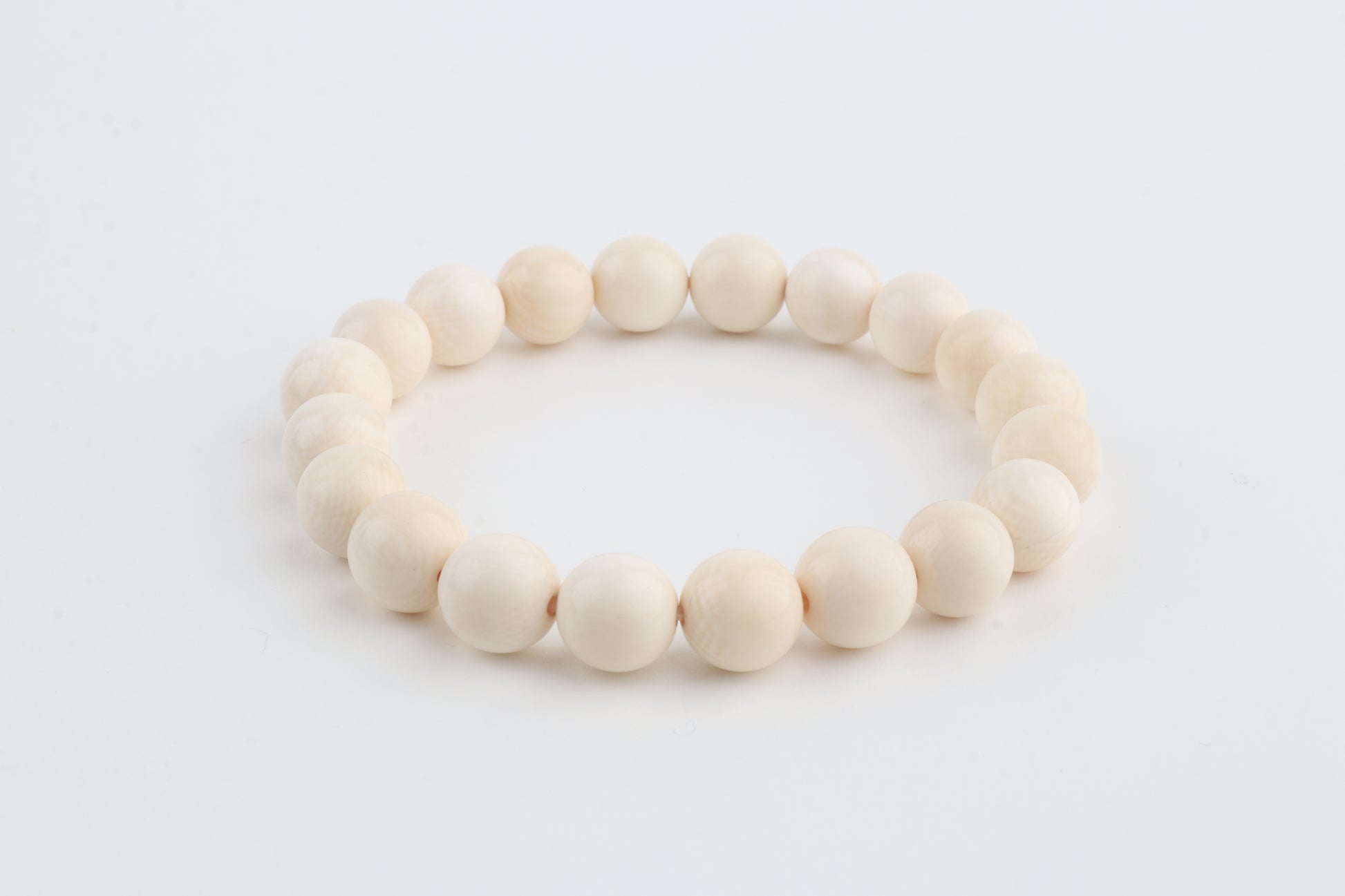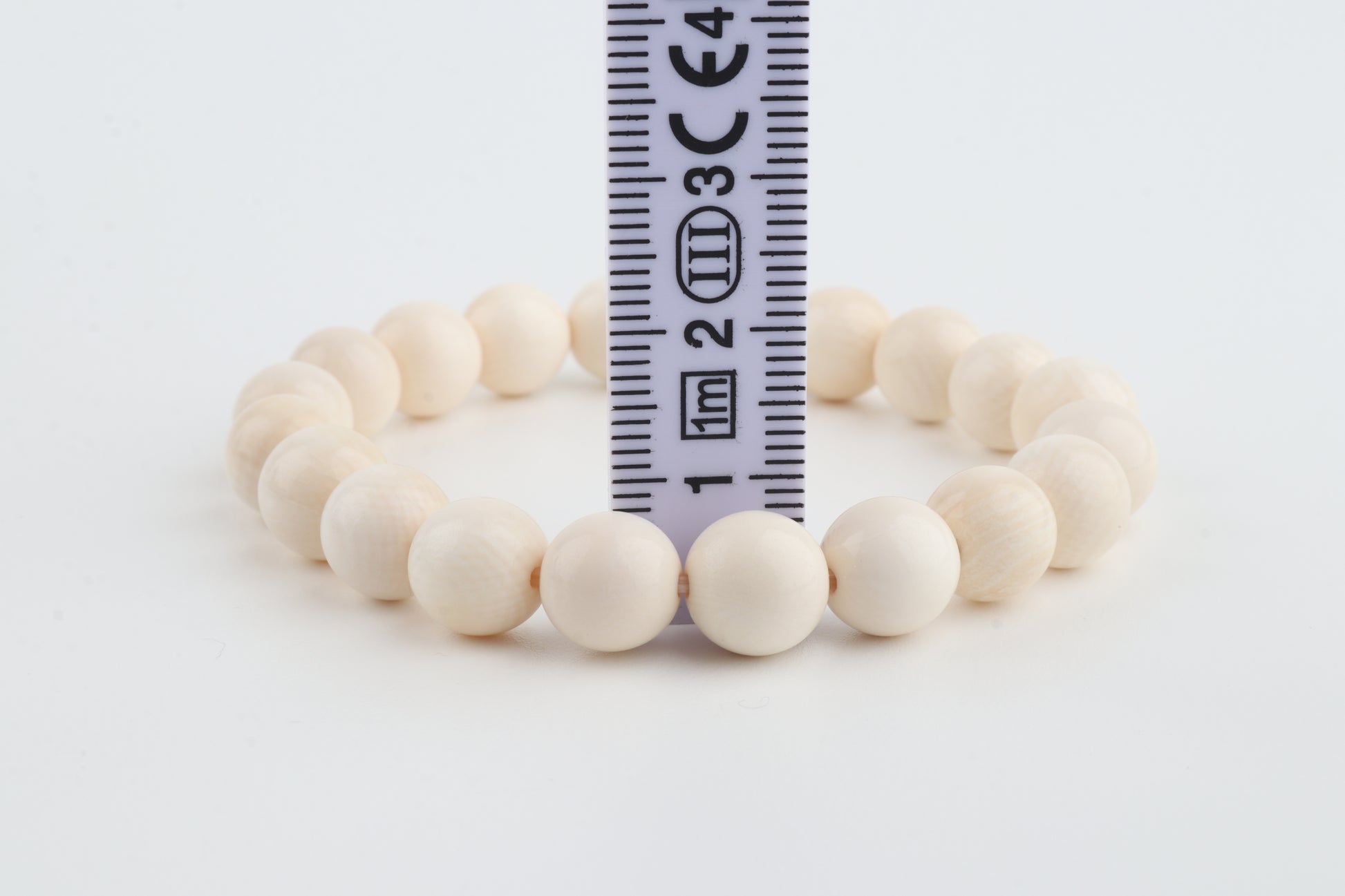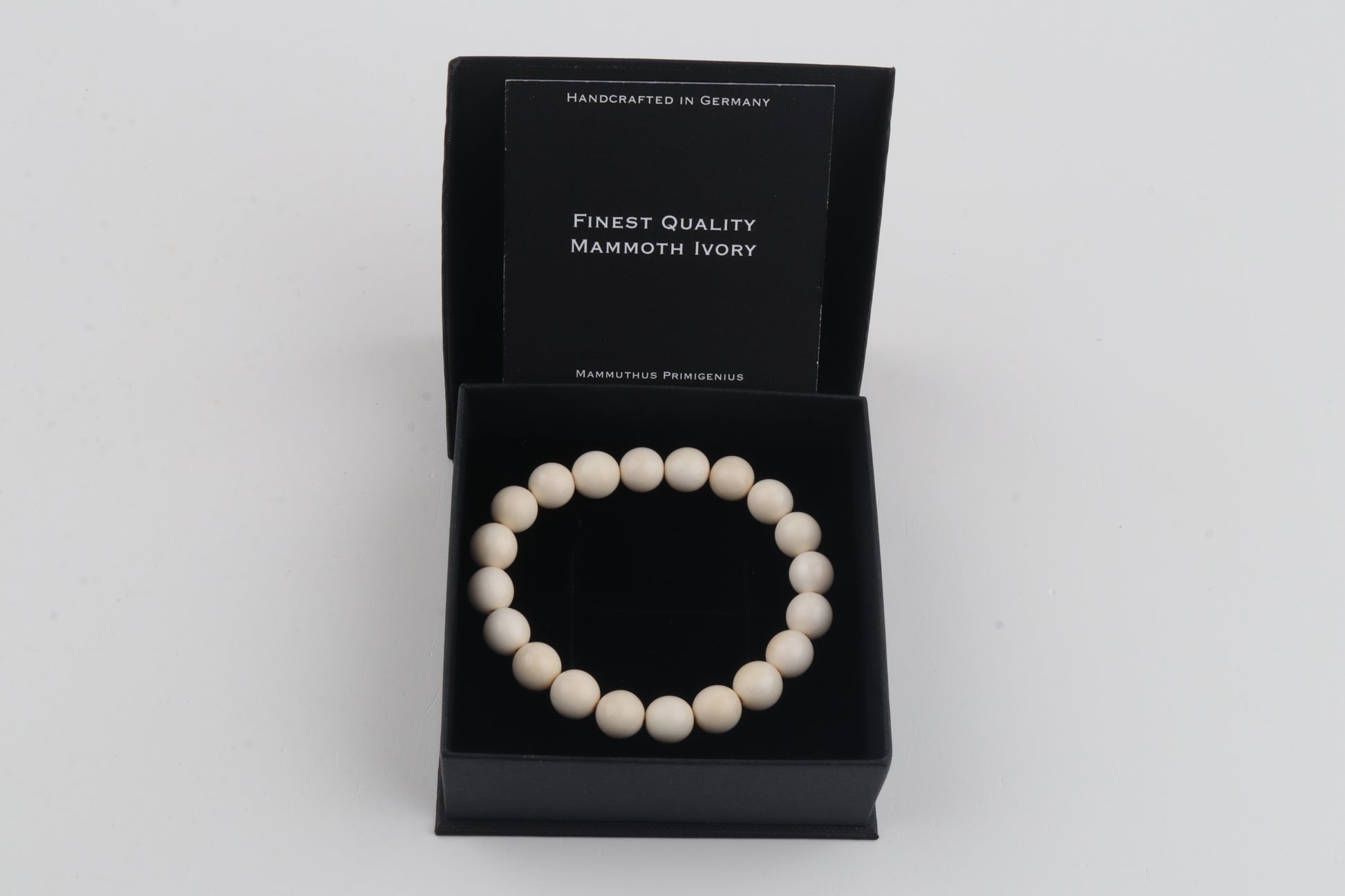 This bracelet is crafted from 9 mm mammoth ivory beads (Mammuthus primigenius), each displaying the soft, creamy tone and subtle grain characteristic of genuine mammoth ivory. Its minimalist design highlights the natural beauty and warmth of the material, offering a timeless piece of wearable history.