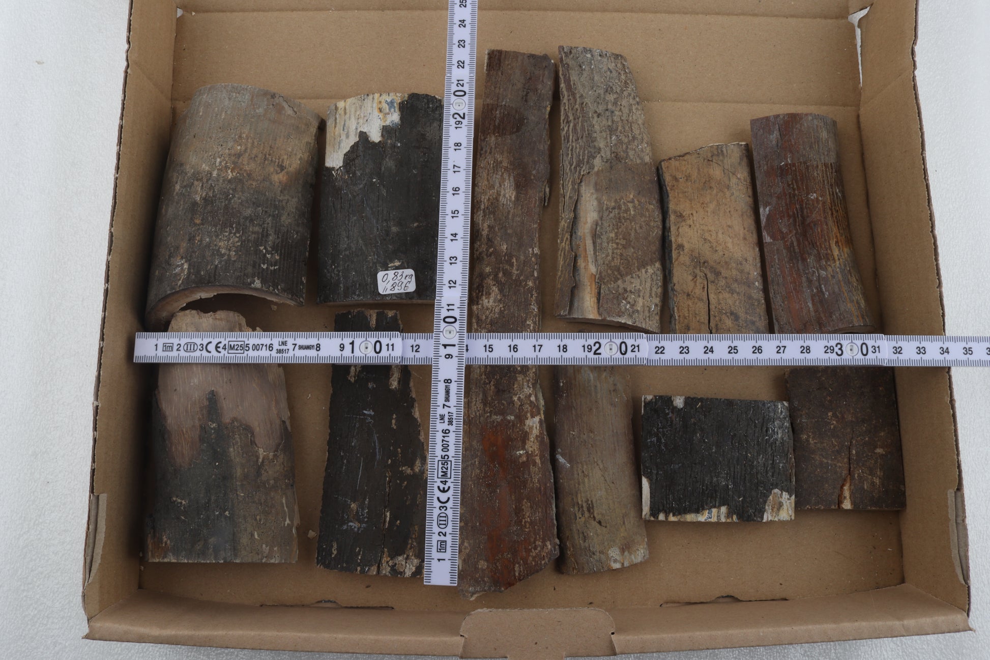 This lot consists of 11 natural Siberian woolly mammoth bark pieces (Mammuthus primigenius). Each piece was hand-selected to form a matching lot. Please carefully look at the pictures for precise dimensions and colours.