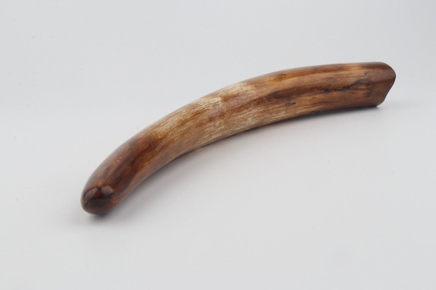 This is a restored woolly mammoth tusk (Mammuthus primigenius) in an immaculate condition. The colour of the bark is brown-orange.