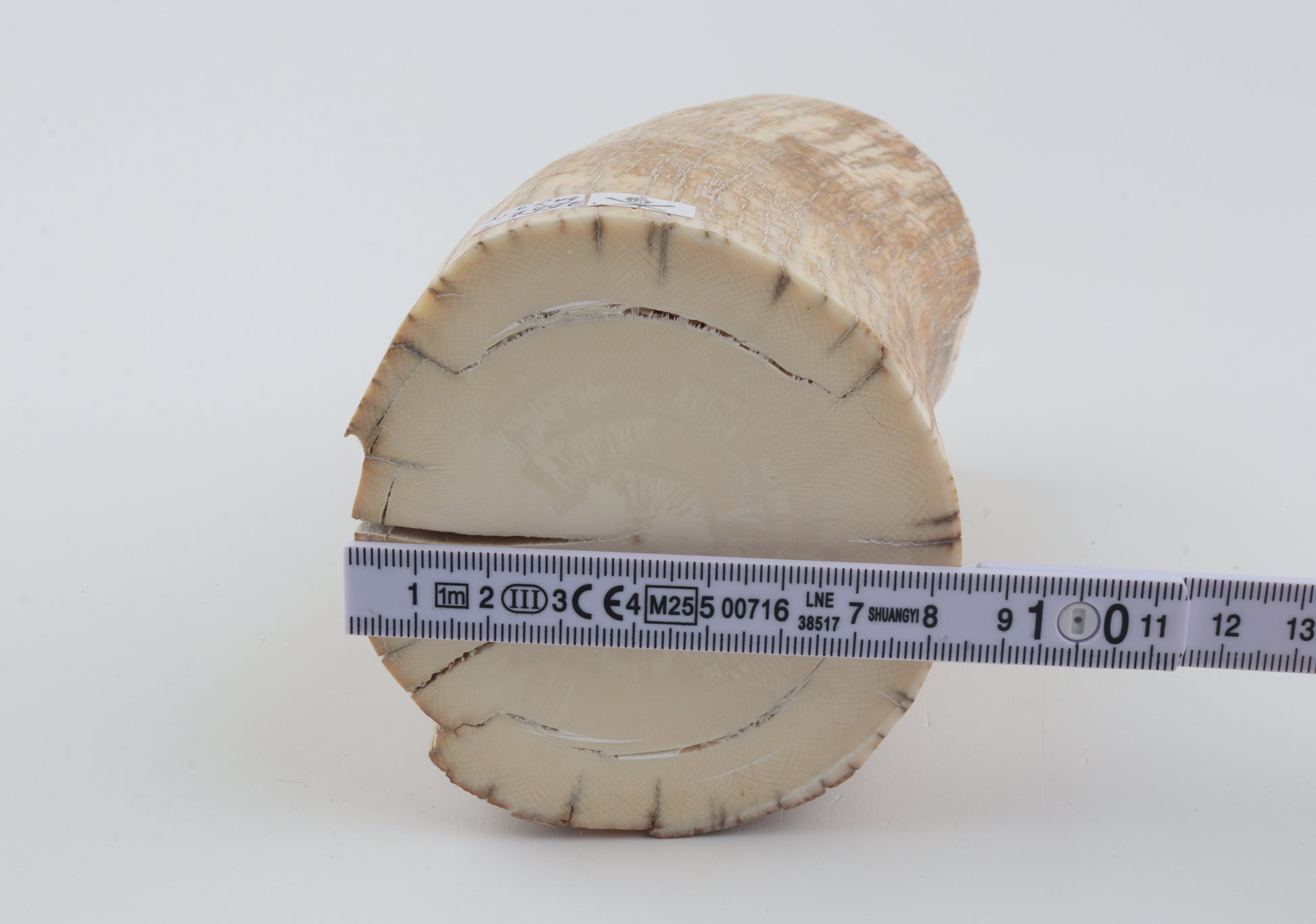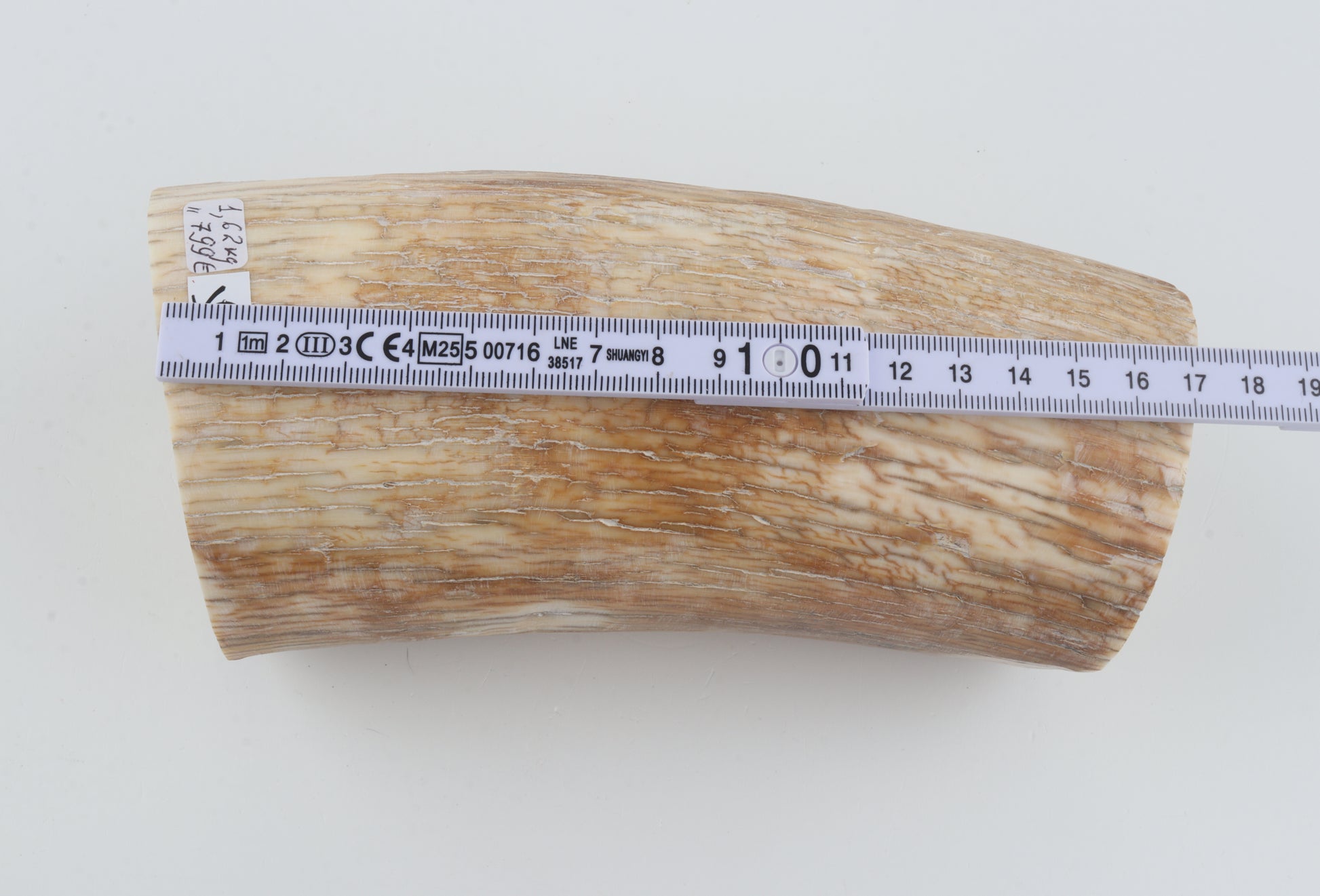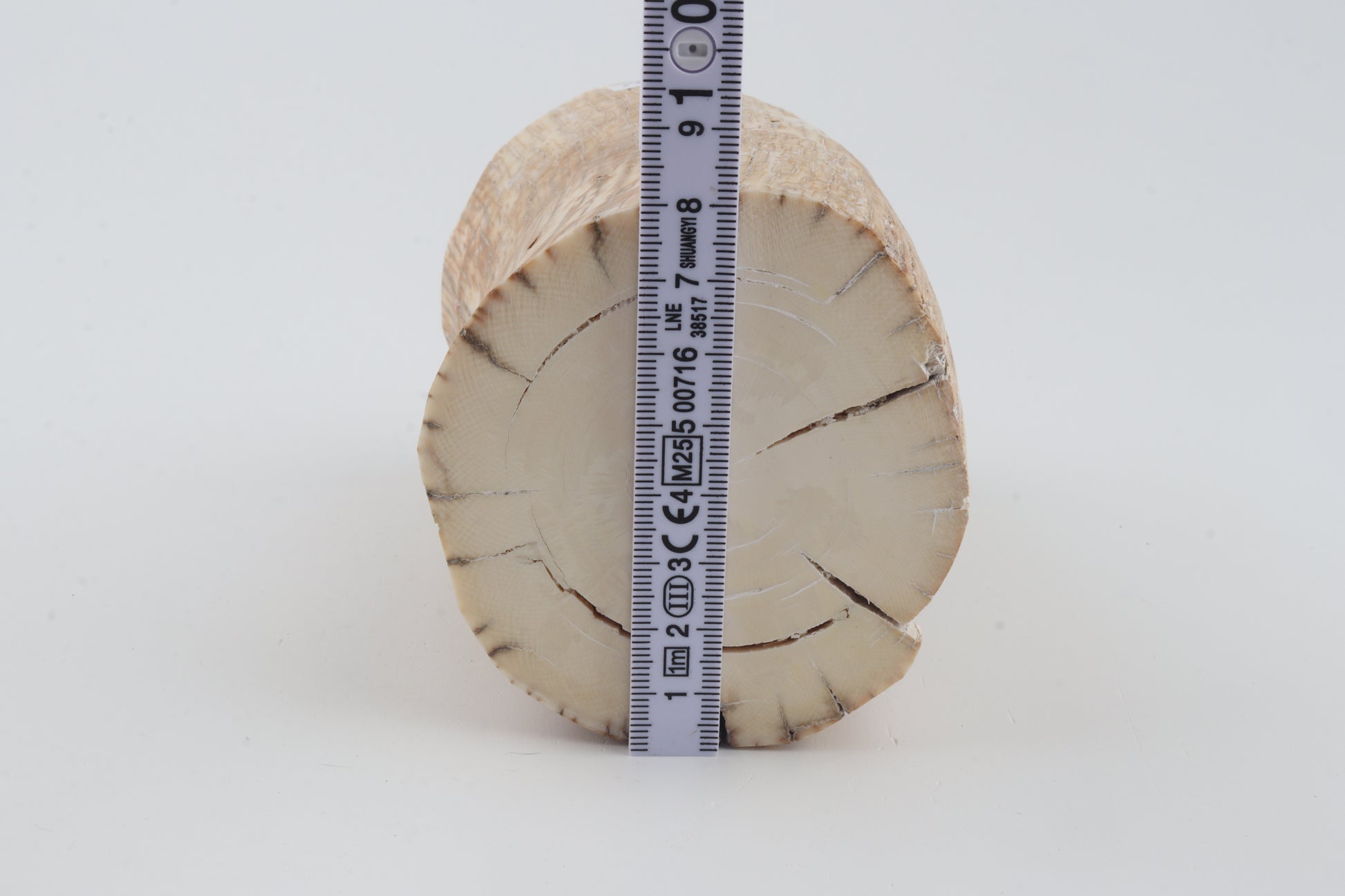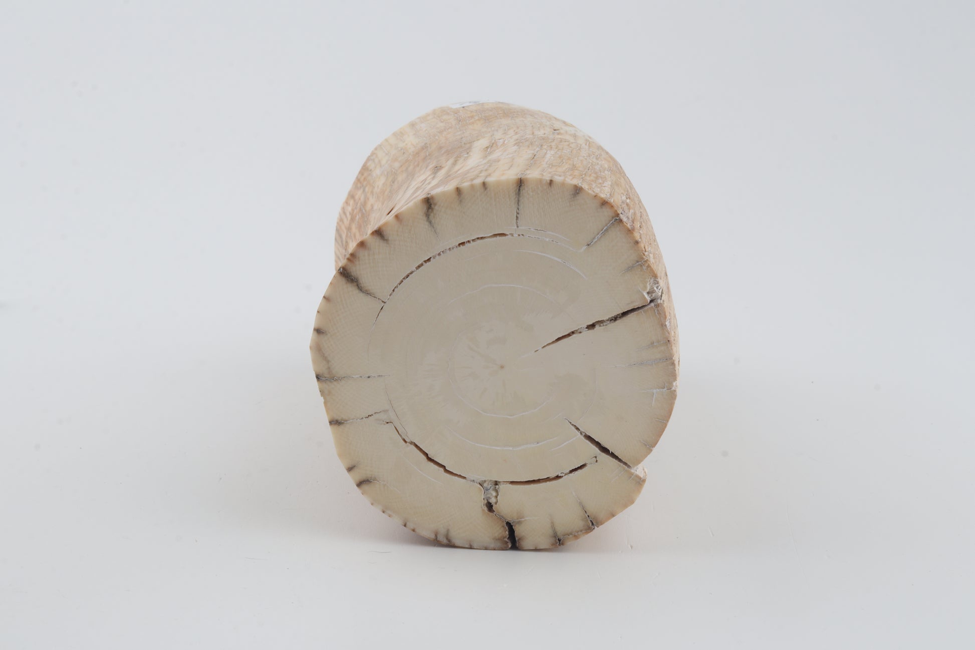 This is a premium-quality, round piece of Siberian woolly mammoth ivory (Mammuthus primigenius). The ivory is naturally dense and solid, despite some cracks. Tapered diameter with plenty of reserves on both ends: One cross-cut section is slightly larger than the other. Please carefully look at the pictures for precise dimensions. The piece displays its original, natural ivory tone. The colour of the outer layer of bark is beige.