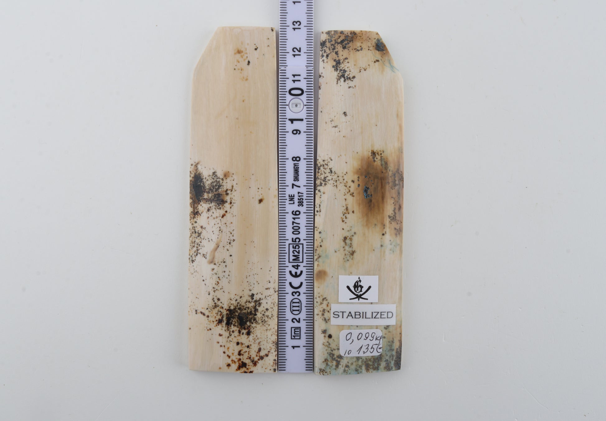 This is a pre-cut pair of stabilized woolly mammoth bark scales (Mammuthus primigenius). These scales can be cut, drilled, sanded, polished etc. to achieve the desired results. Consistent width and thickness with reserves on both ends. The undersides are flat. The colour of the bark is white.