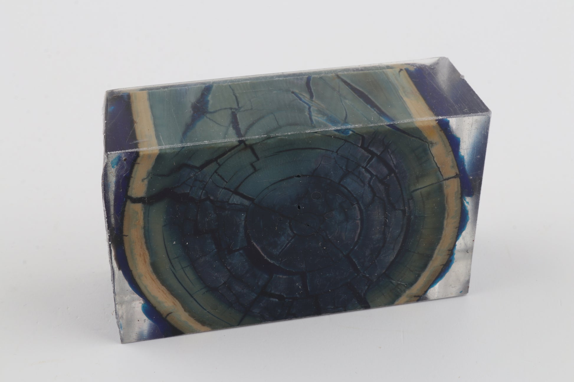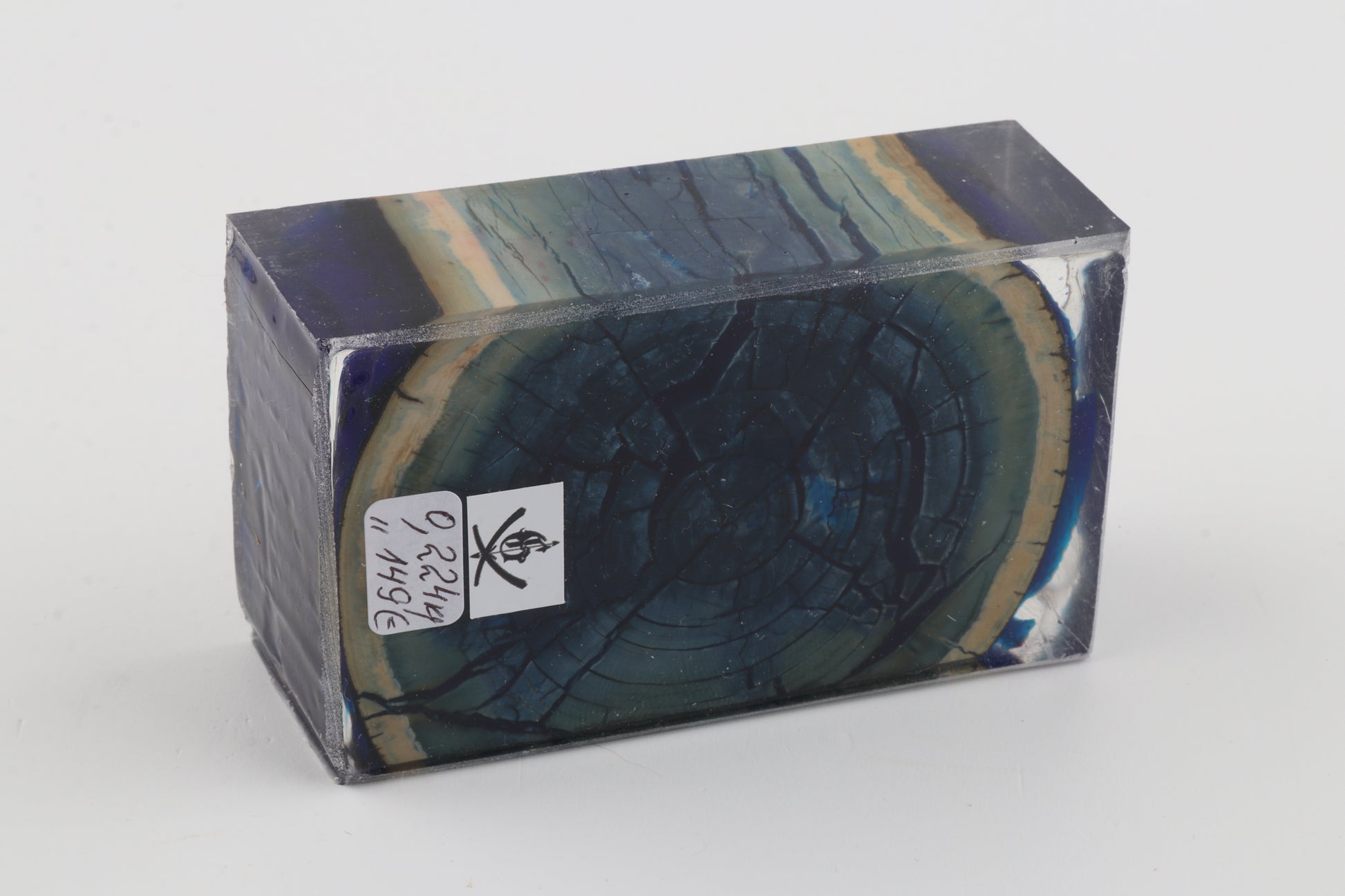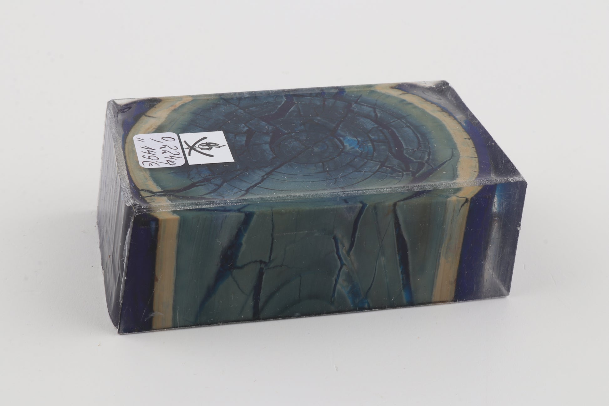 This is a cross-cut stabilised woolly mammoth ivory block (Mammuthus primigenius). This block can be precision-cut, drilled, sanded, polished etc. to achieve the desired results. Consistent width and thickness with reserves on both ends. The colour of the ivory is a mix of blue and green tones, with a dark blue core surrounded by a lighter blue ring.