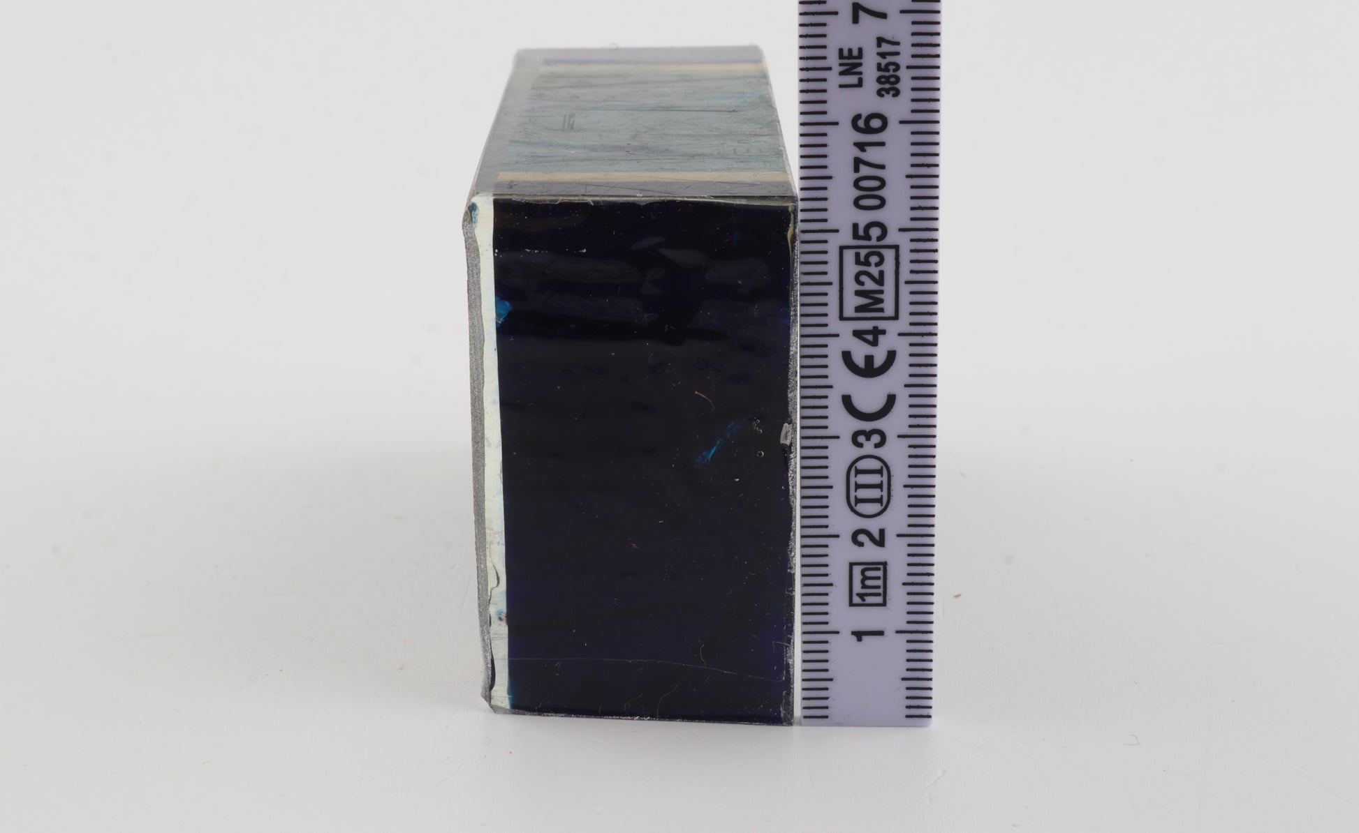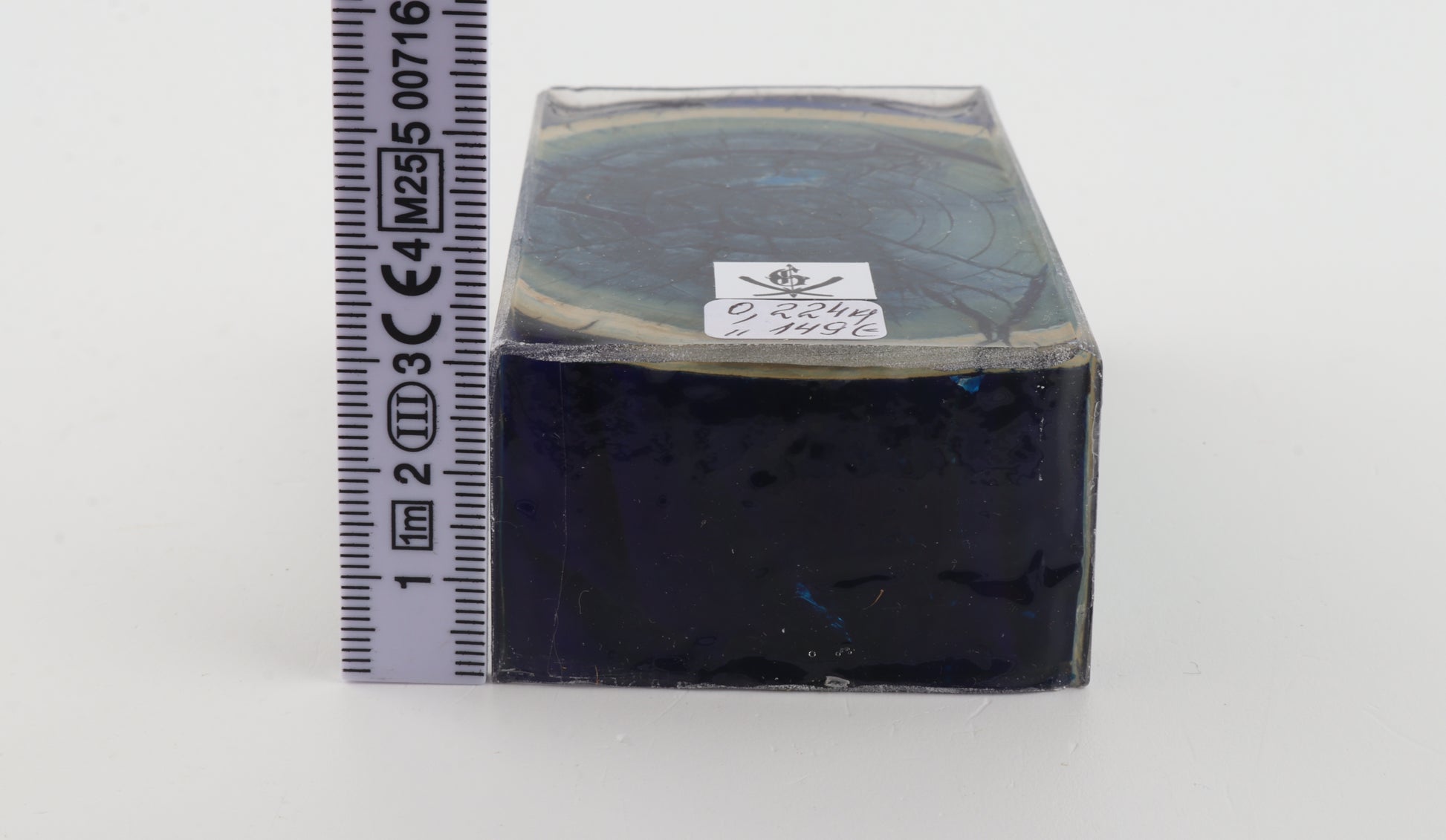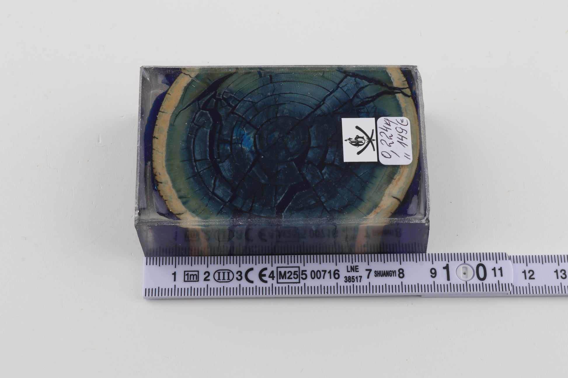 This is a cross-cut stabilised woolly mammoth ivory block (Mammuthus primigenius). This block can be precision-cut, drilled, sanded, polished etc. to achieve the desired results. Consistent width and thickness with reserves on both ends. The colour of the ivory is a mix of blue and green tones, with a dark blue core surrounded by a lighter blue ring.