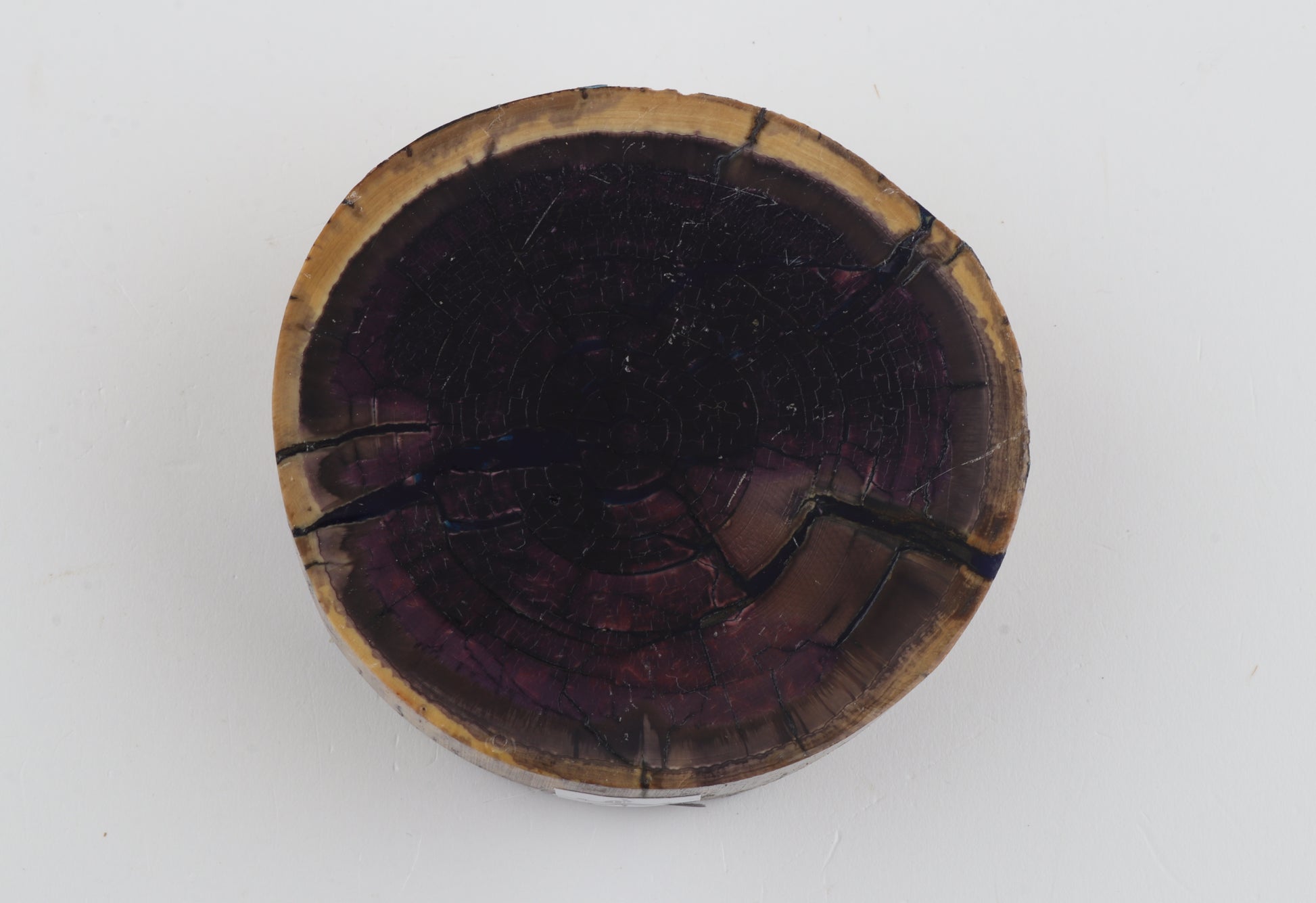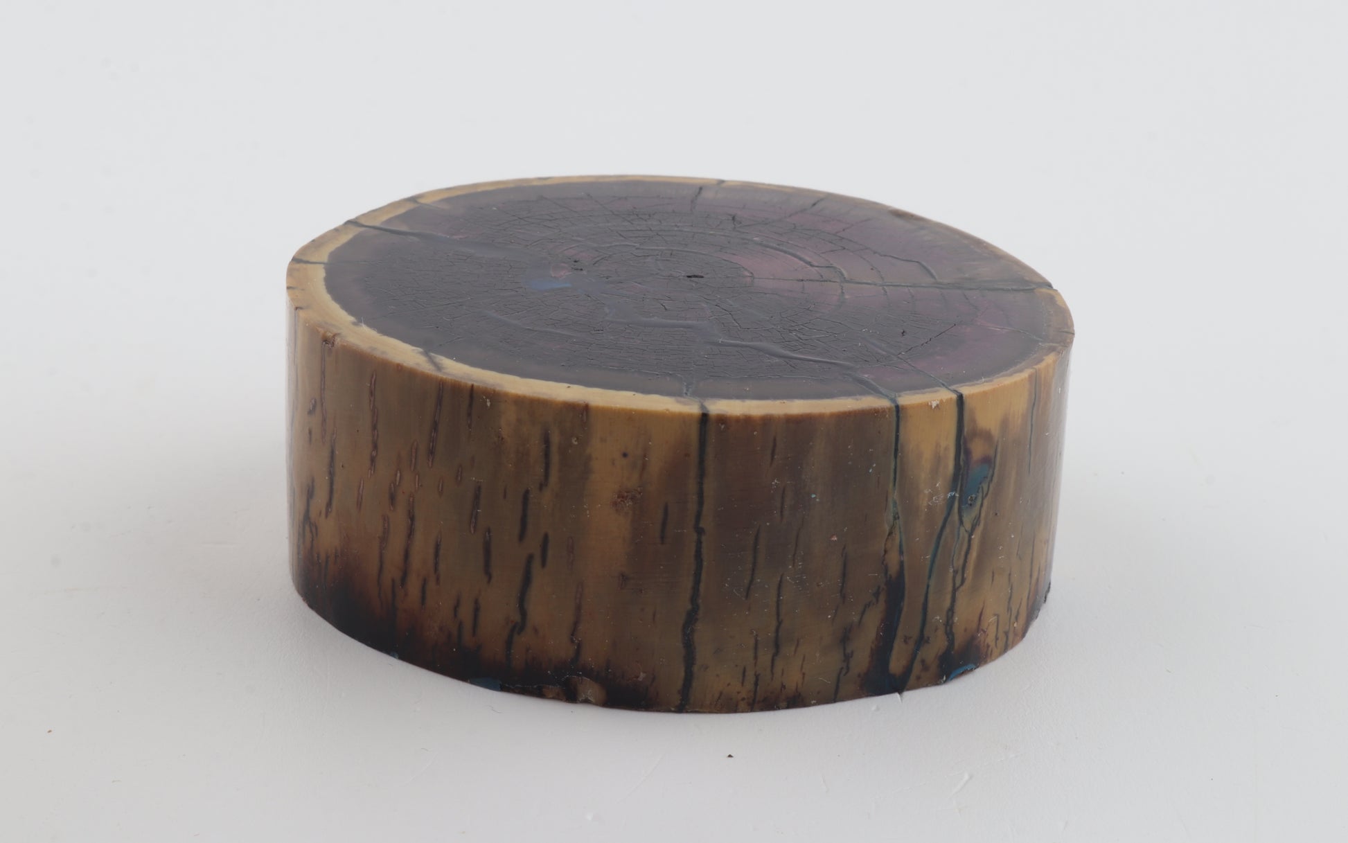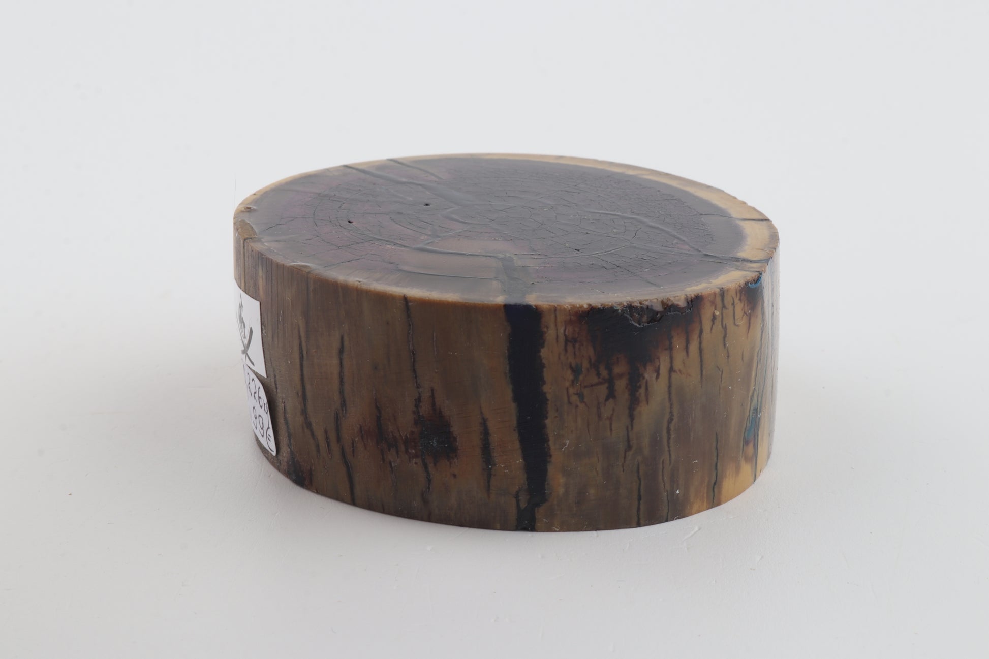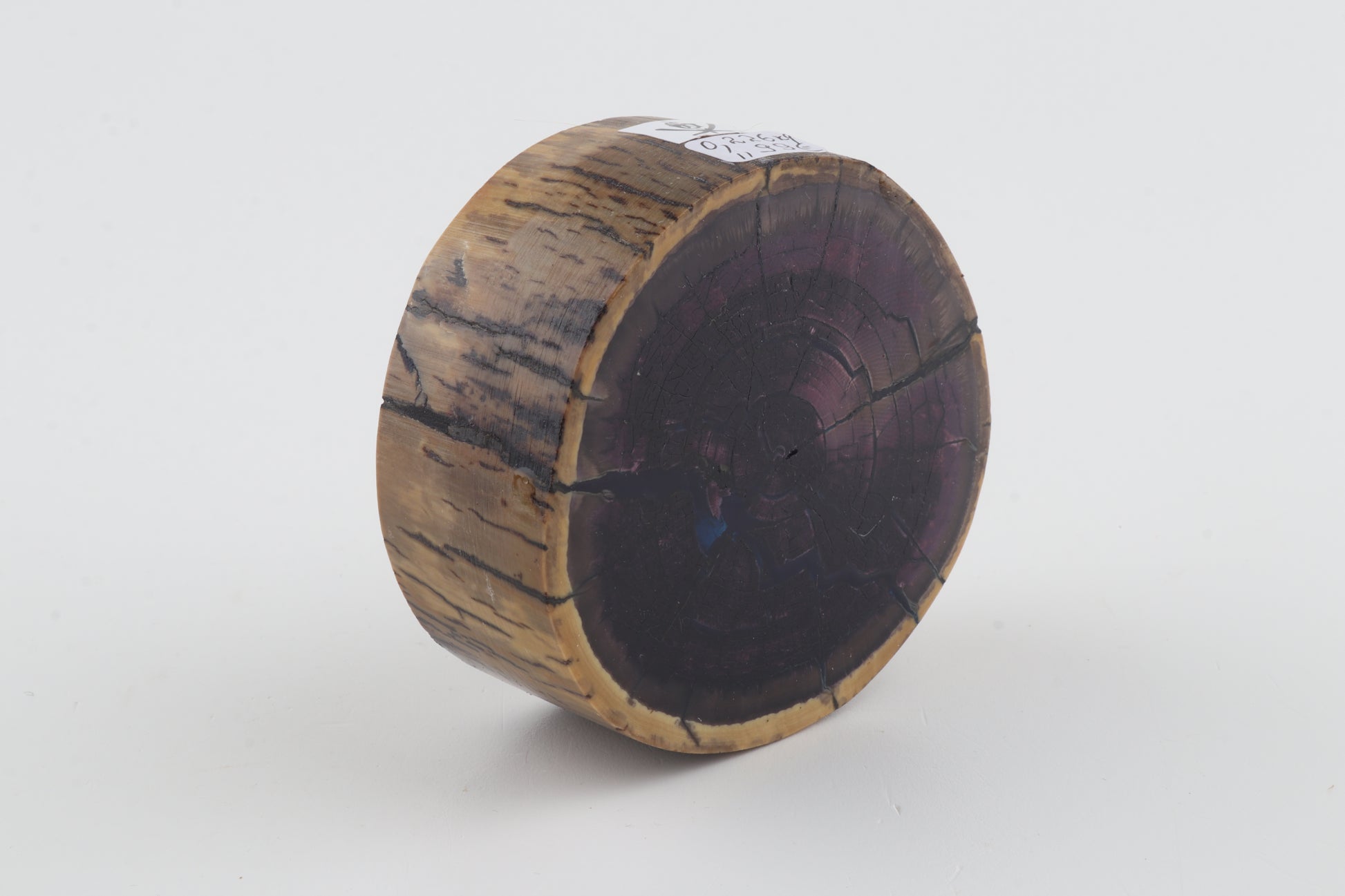 This is a round, cross-cut stabilised woolly mammoth ivory block (Mammuthus primigenius). This block can be precision-cut, drilled, sanded, polished etc. to achieve the desired results. Consistent diameter with reserves on both ends. The colour of the ivory is deep purple and dark brown, with some lighter, yellowish-brown edges.