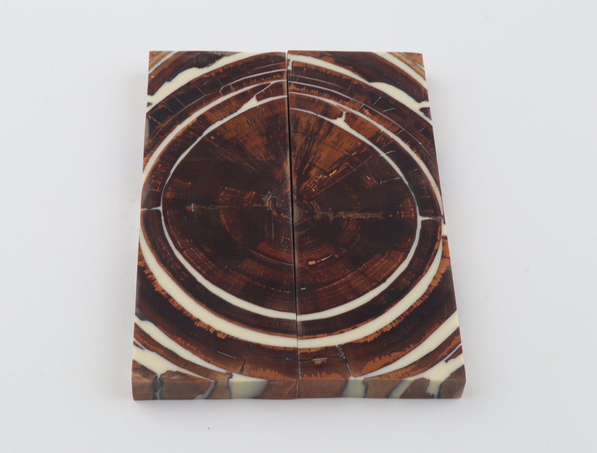 This is a pre-cut pair of stabilised mammoth ivory scales (Mammuthus primigenius). These scales can be precision-cut, drilled, polished, sanded etc. to achieve the desired results. One slab is larger than the other. Consistent width and thickness with reserves on both ends. The colour of the ivory is brown.