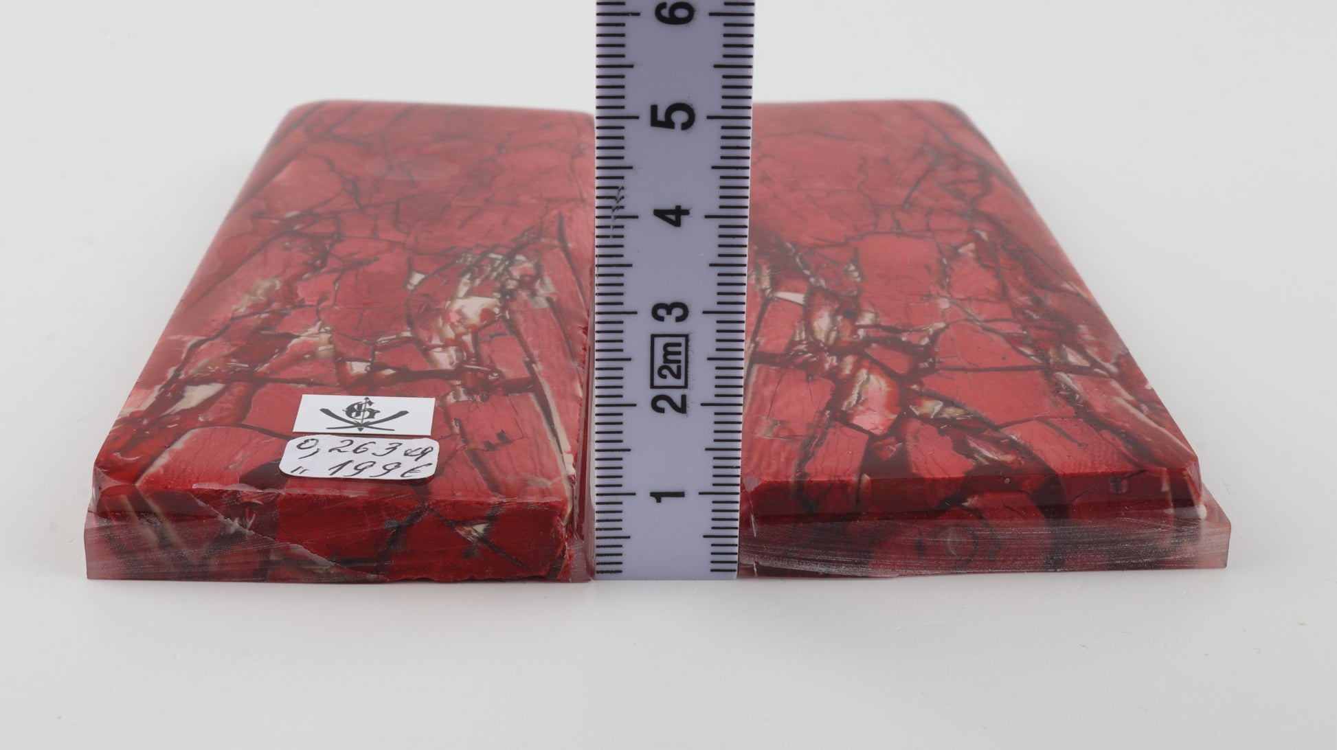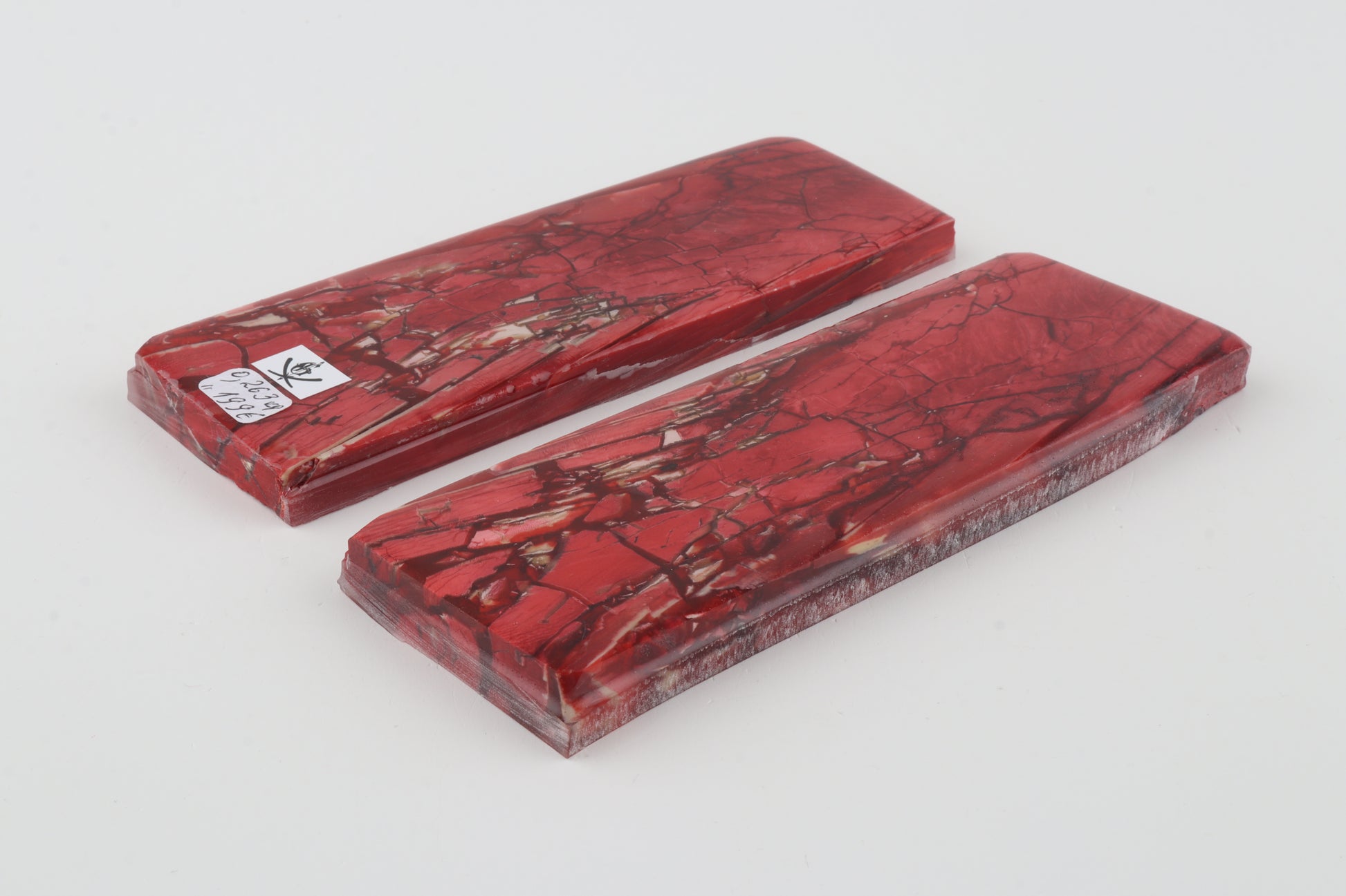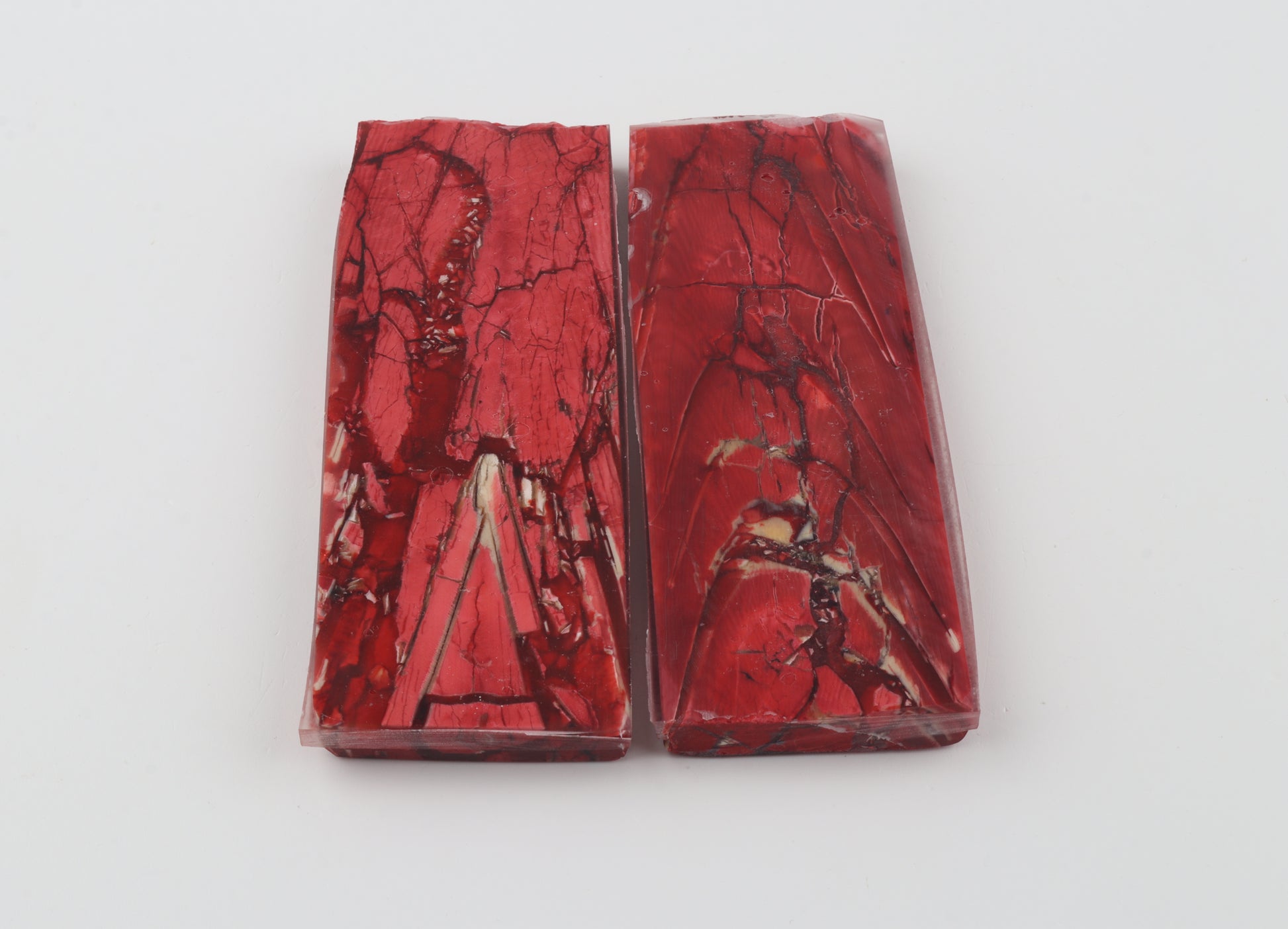 This is a pre-cut pair of stabilised mammoth ivory scales (Mammuthus primigenius). These scales can be precision-cut, drilled, polished, sanded etc. to achieve the desired results. Consistent width and thickness with reserves on both ends. The colour of the ivory is pink.