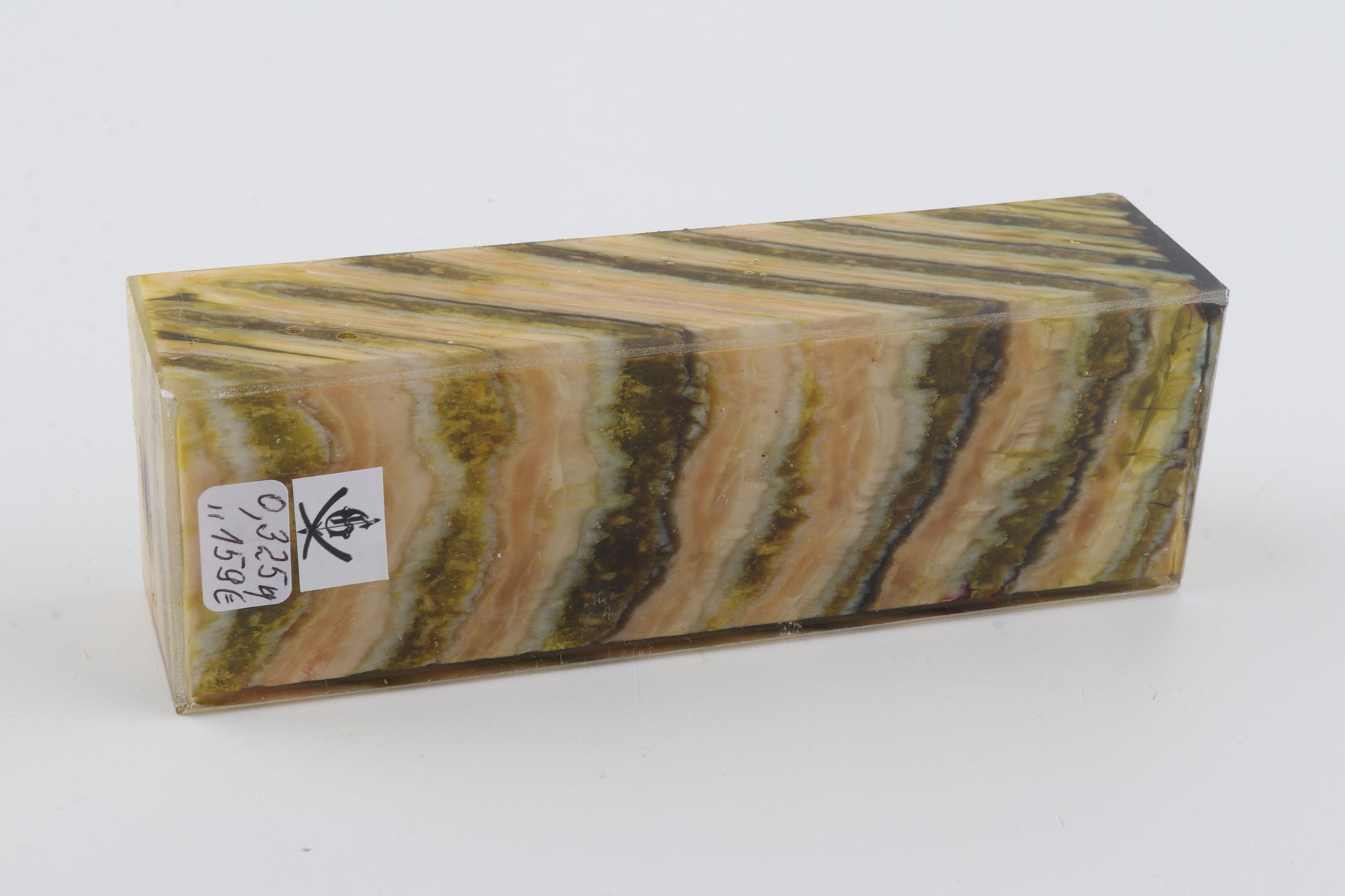 This is a cross-cut, stabilized woolly mammoth molar block (Mammuthus primigenius). This molar block can be precision-cut, drilled, sanded, polished etc. to achieve the desired results. Consistent width and thickness. The colour of the molar is a mix of yellow-green, olive, cream, and light beige tones, with darker greenish-brown bands.