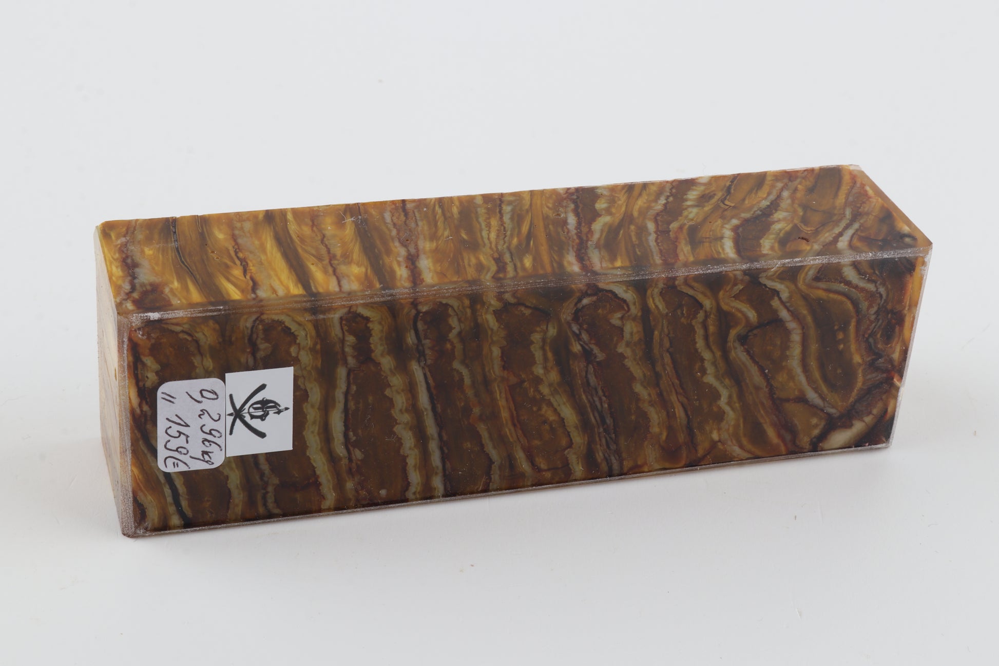 This is a cross-cut, stabilized woolly mammoth molar block (Mammuthus primigenius). This molar block can be precision-cut, drilled, sanded, polished etc. to achieve the desired results. Consistent width and thickness. The colour of the molar is a mix of warm brown, golden-brown, amber, and beige tones.
