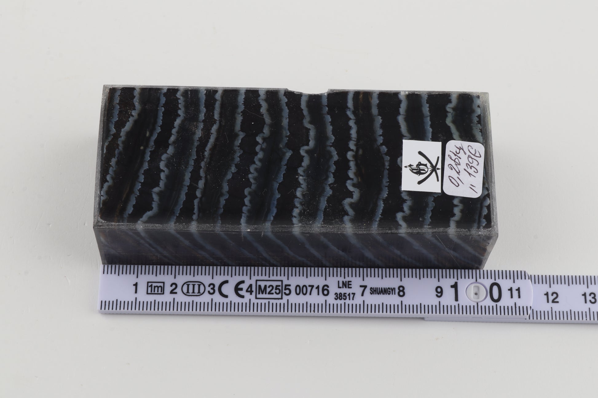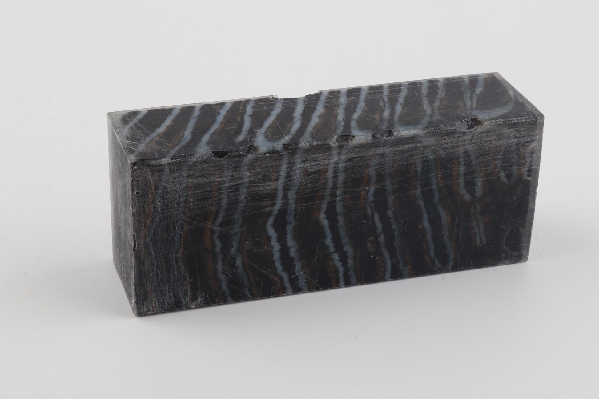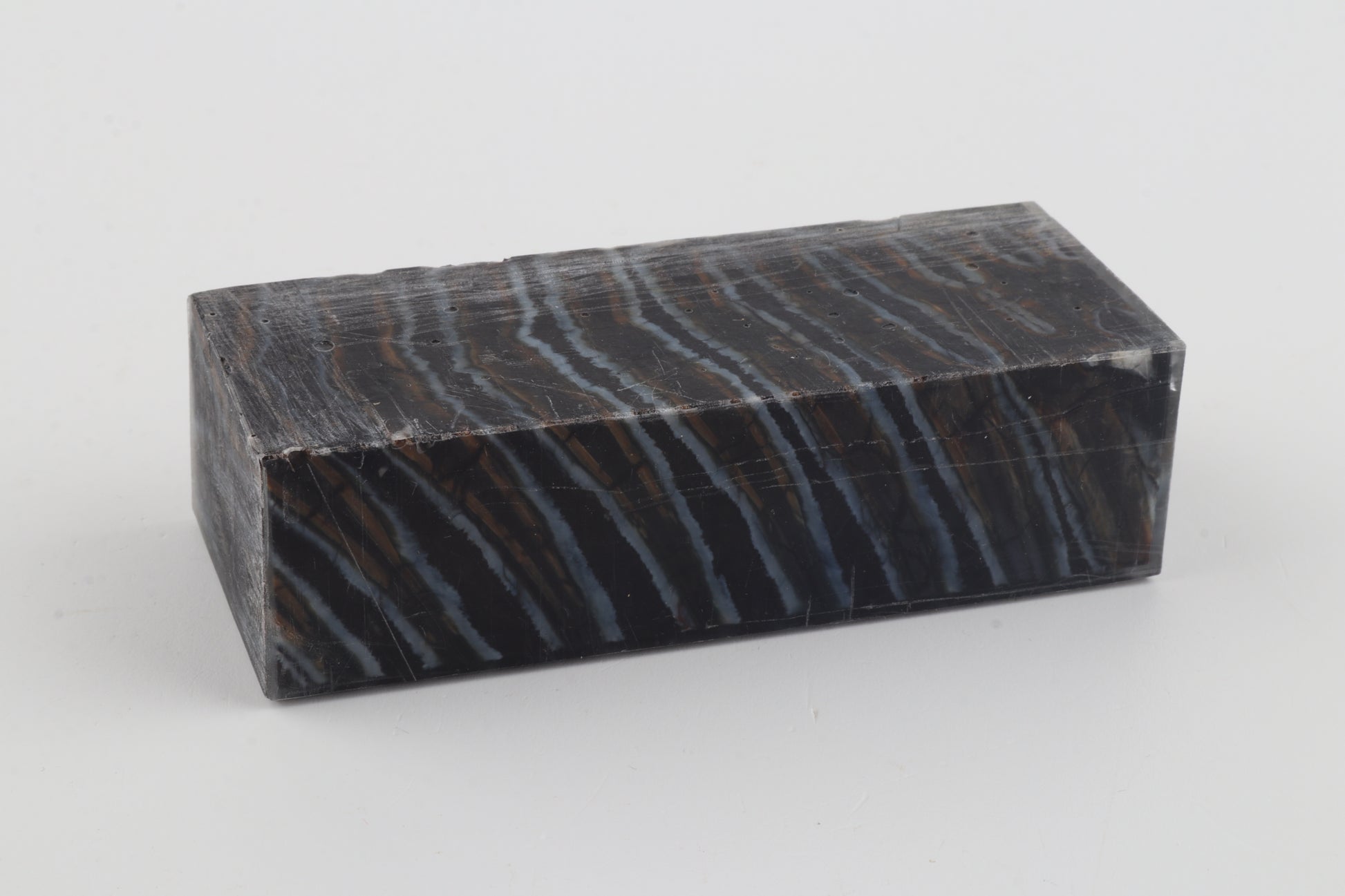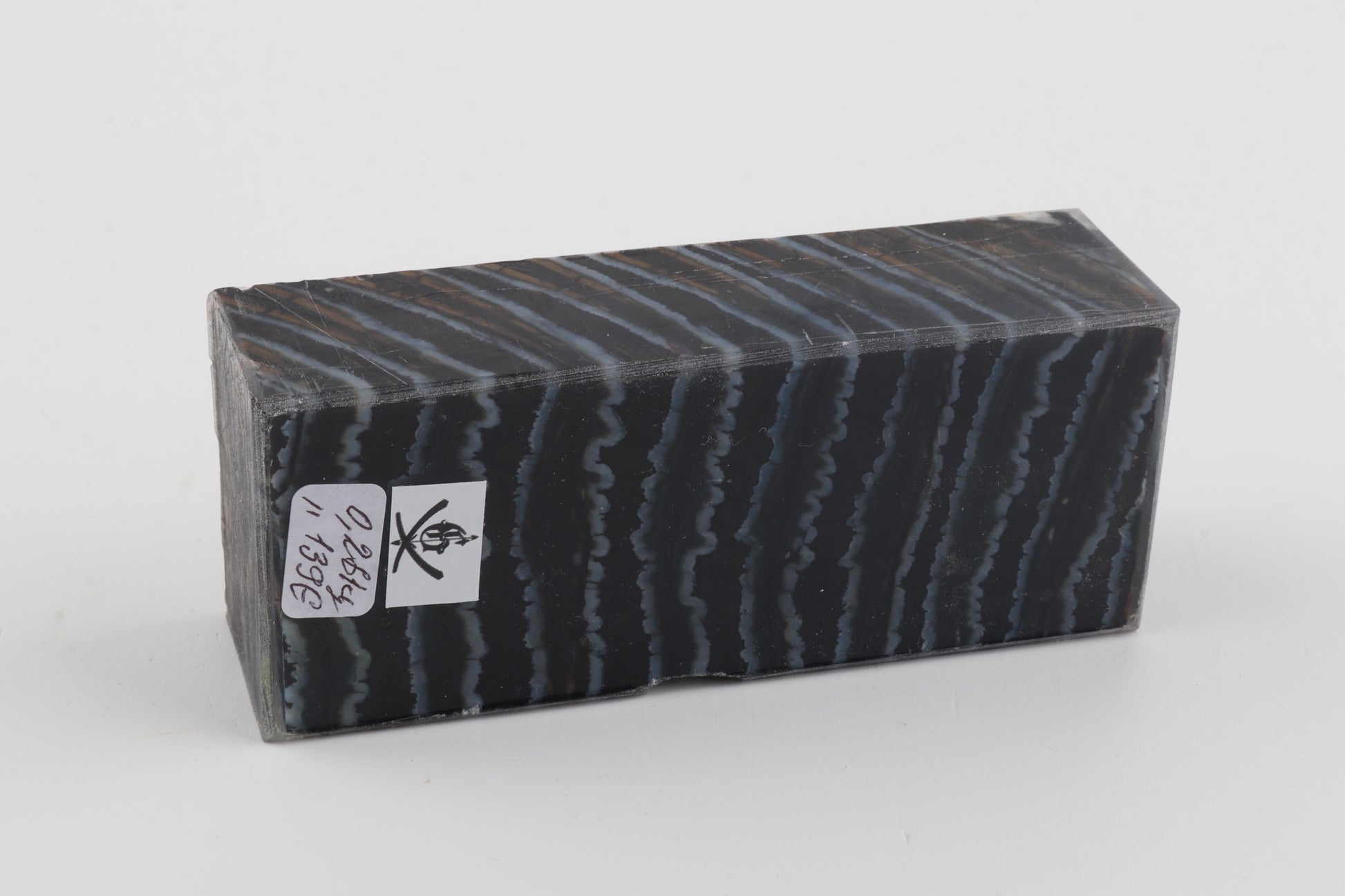 This is a cross-cut, stabilised woolly mammoth molar block (Mammuthus primigenius). This molar block can be precision-cut, drilled, sanded, polished etc. to achieve the desired results. Consistent width and thickness. The color of the molar is a mix of dark blue and black stripes with lighter blue or grayish lines, giving it a layered, agate-like appearance.