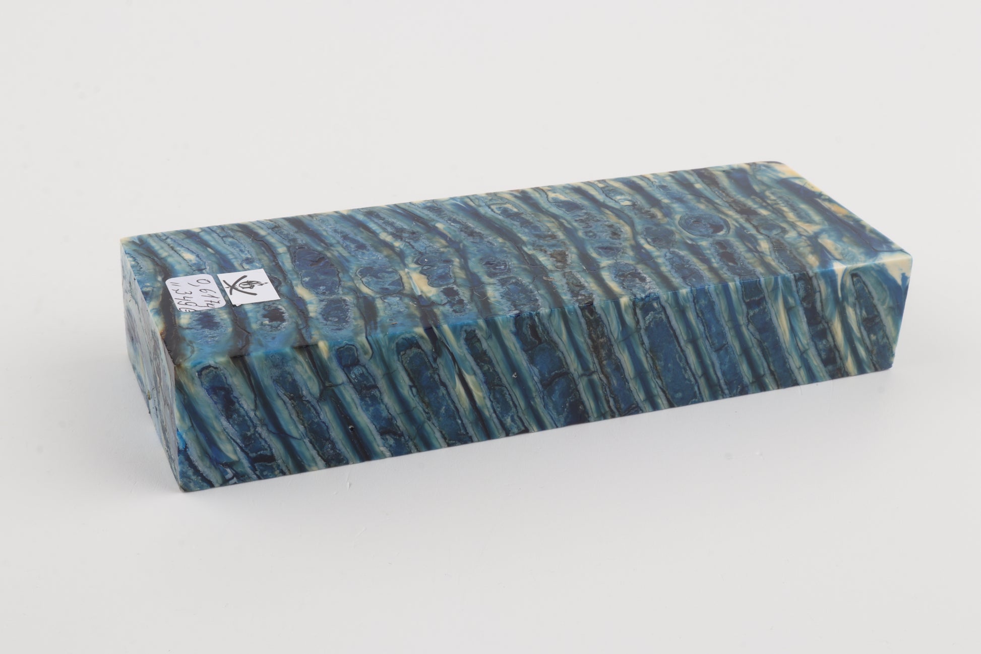 This is a cross-cut, stabilized woolly mammoth molar block (Mammuthus primigenius). This molar block can be precision-cut, drilled, sanded, polished etc. to achieve the desired results. Consistent width and thickness. The colour of the molar is blue.
