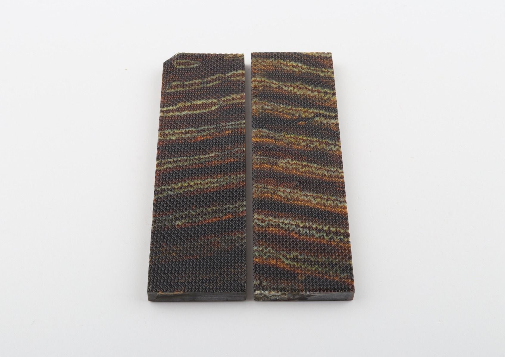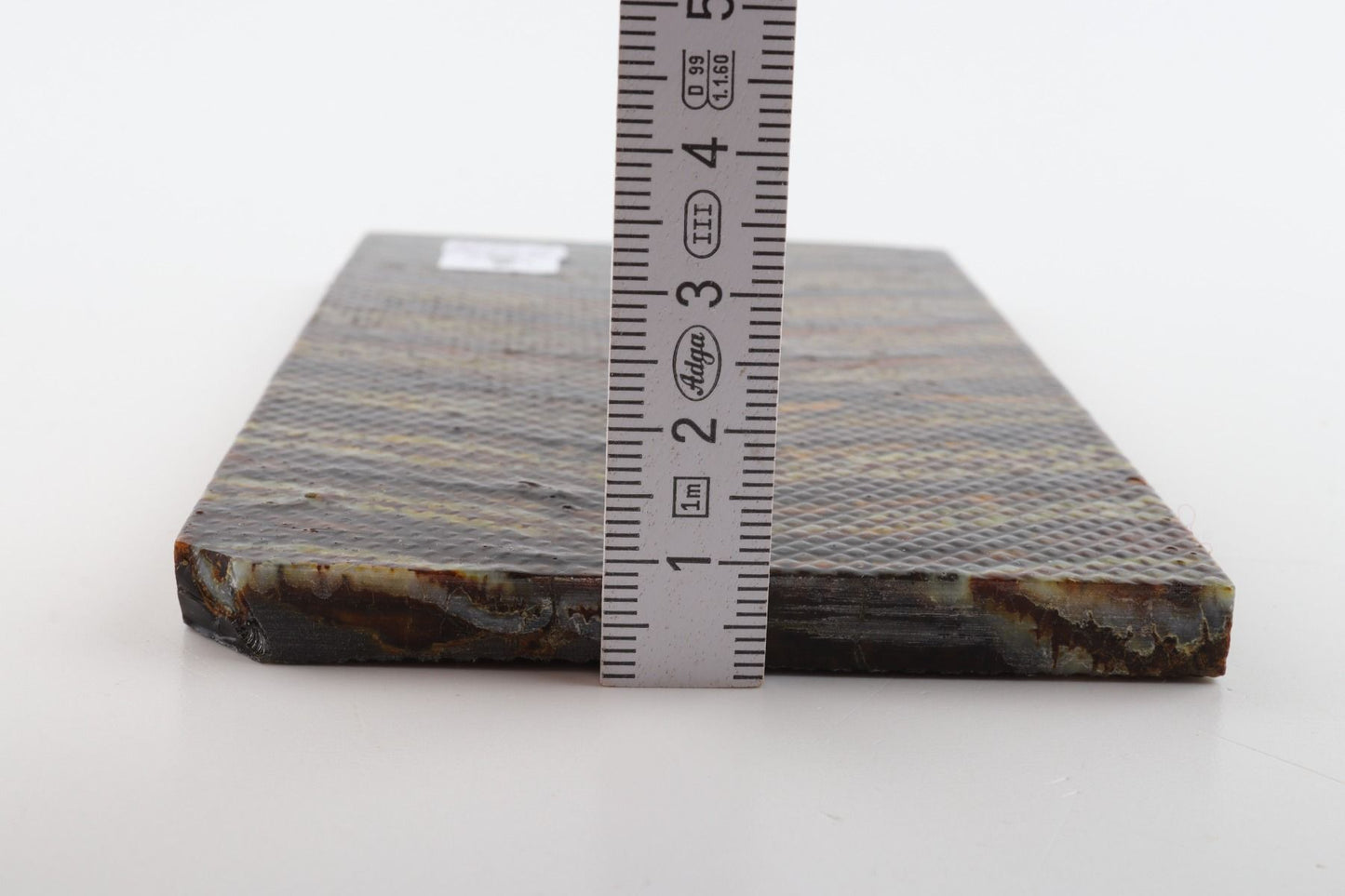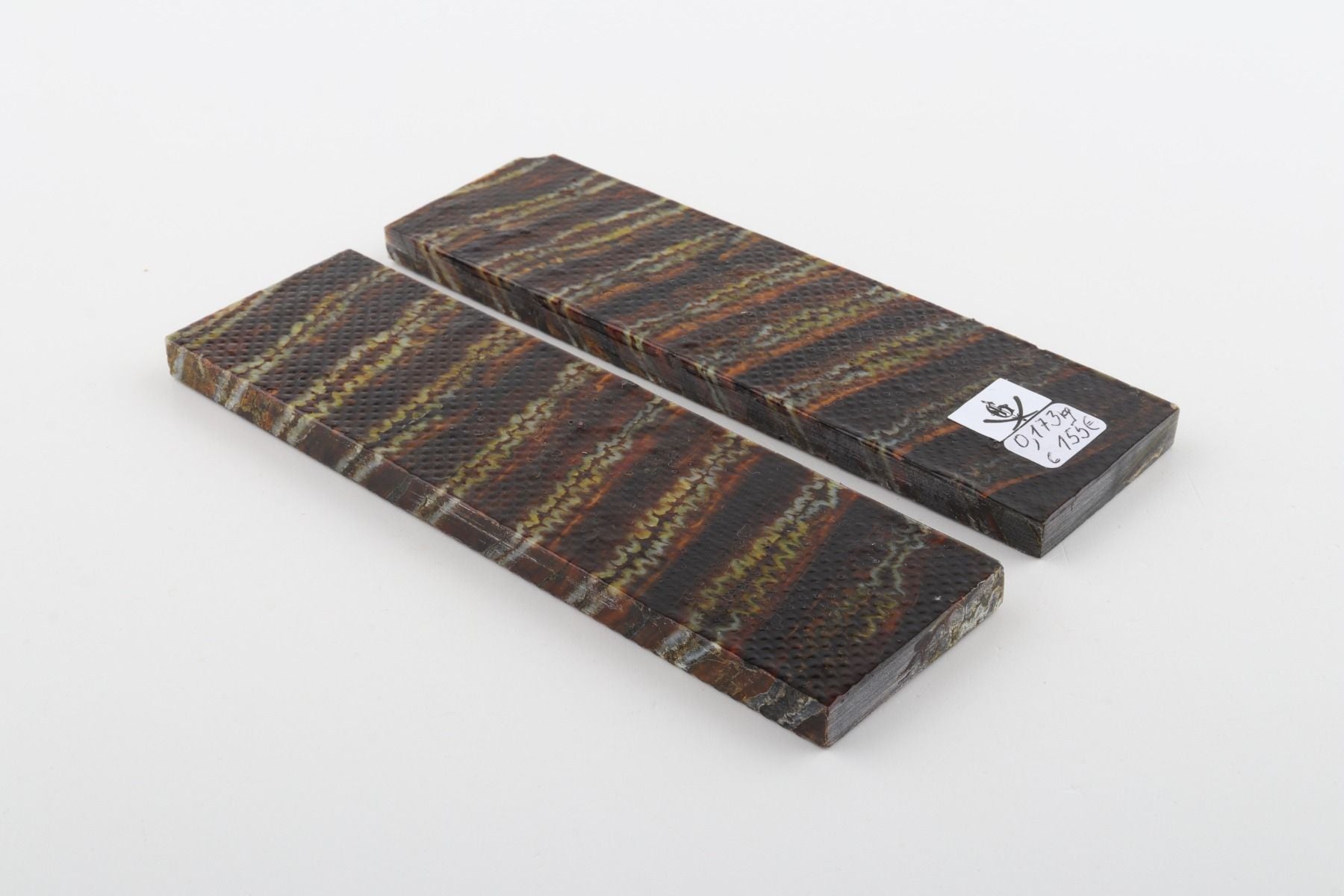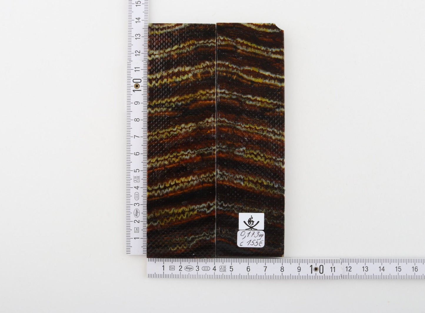 This is a cross-cut pair of stabilised woolly mammoth molar scales (Mammuthus primigenius). These molar scales can be precision-cut, drilled, polished, sanded etc. to achieve the desired results. Consistent width and thickness with reserves on both ends. The colour of the molar is a mix of brown, yellow and orange.