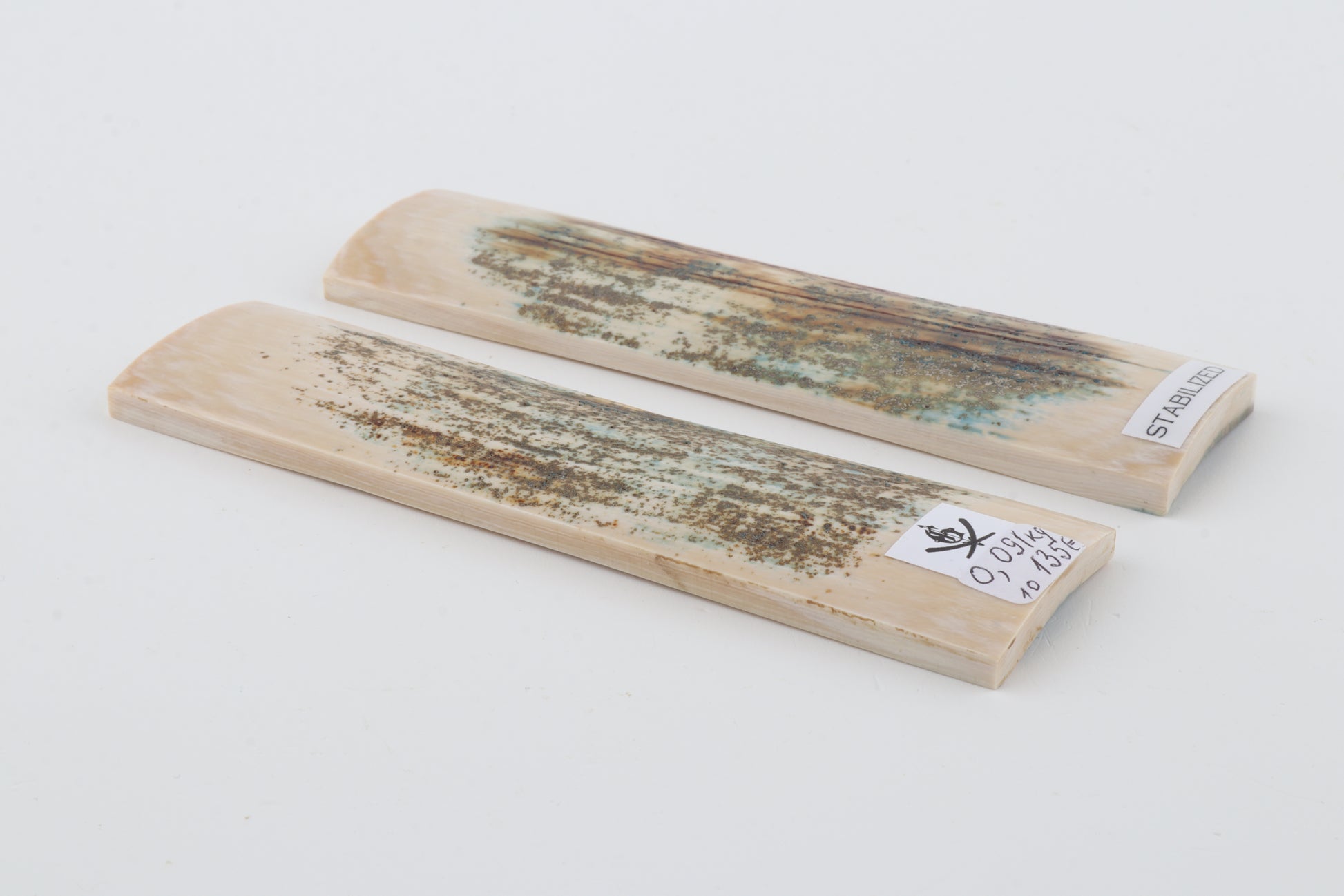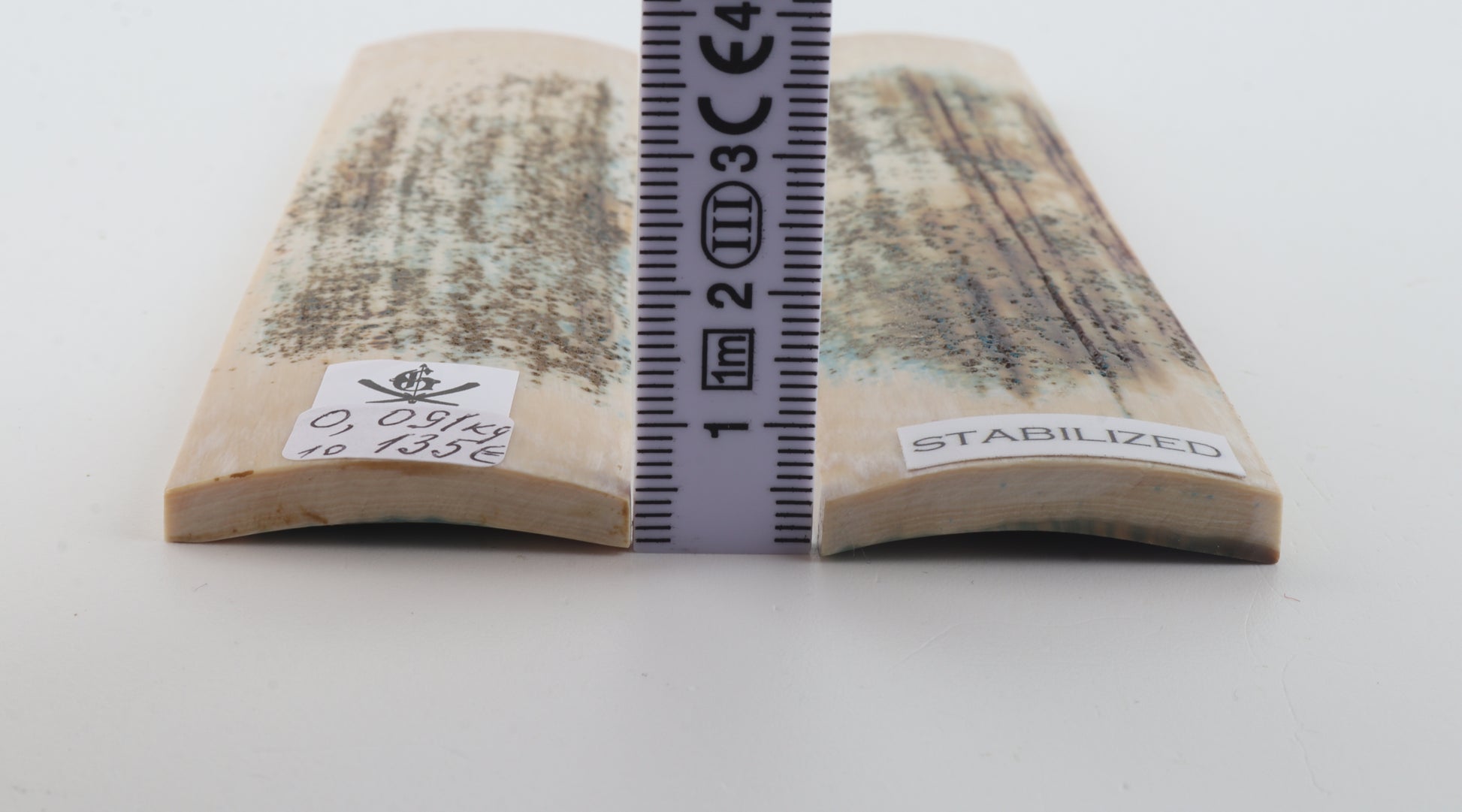 This is a pre-cut pair of stabilized woolly mammoth bark scales (Mammuthus primigenius). These scales can be cut, drilled, sanded, polished etc. to achieve the desired results. Consistent width and thickness with reserves on both ends. The undersides are almost flat. The colour of the bark is a mix of white, blue and green.
