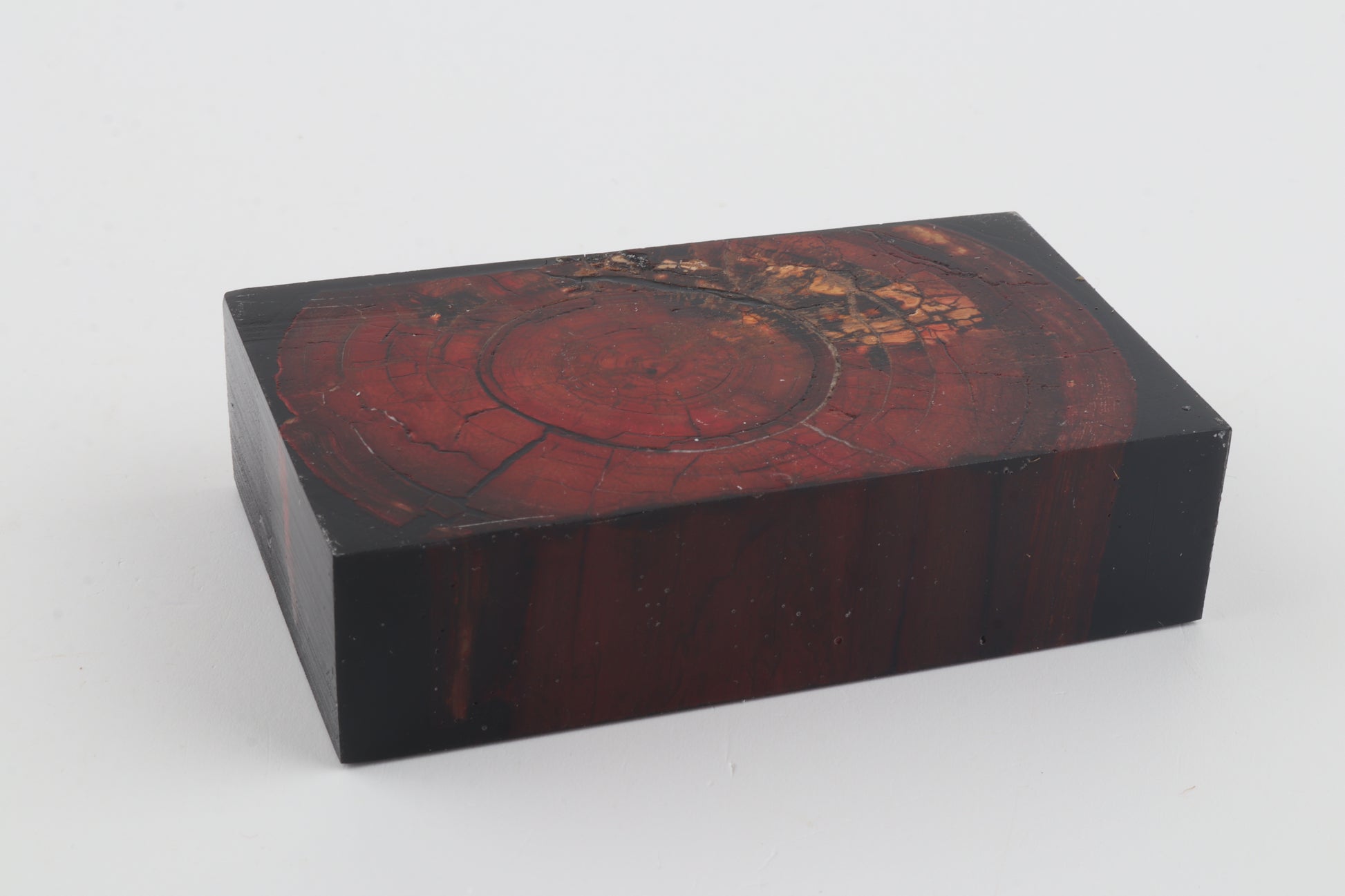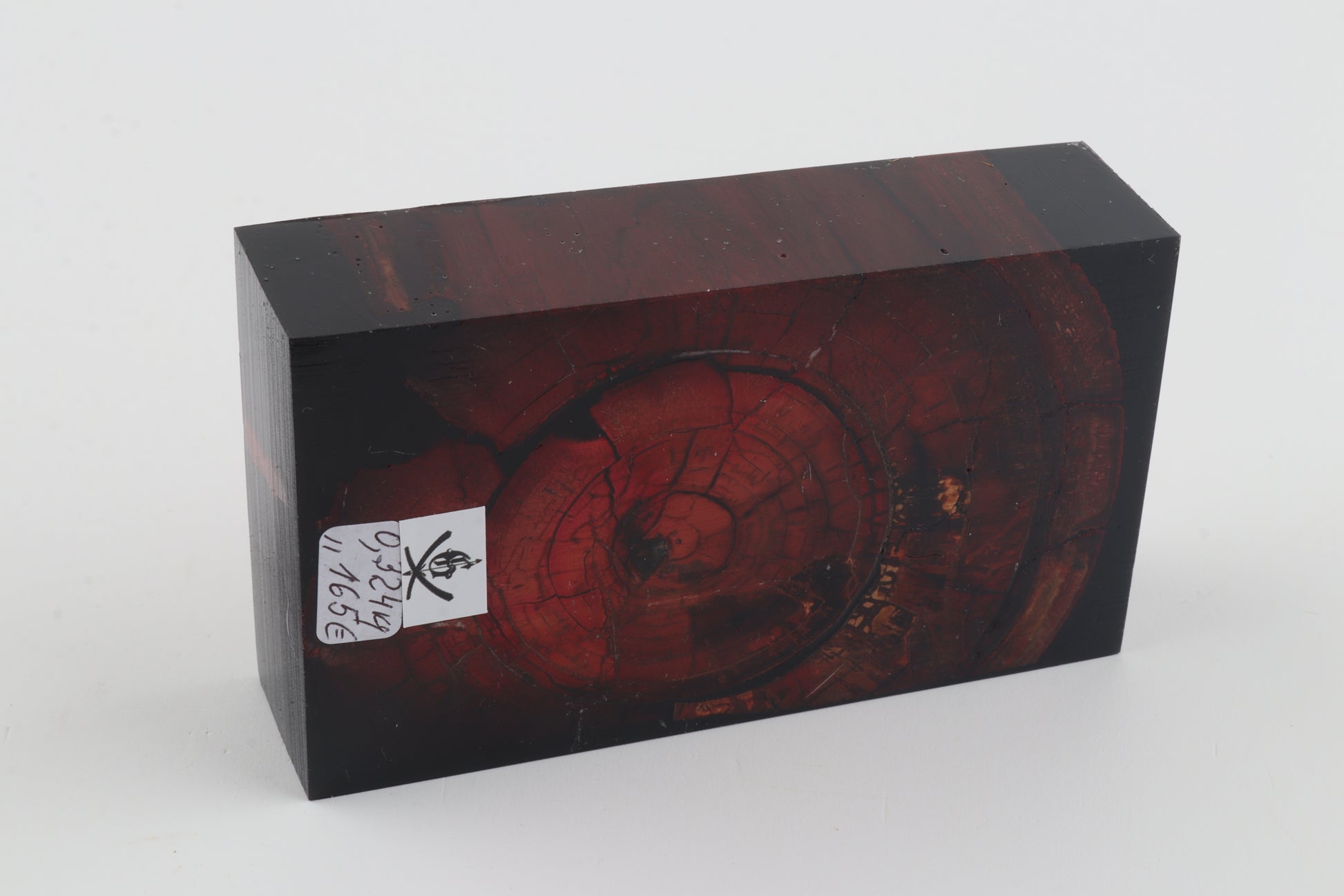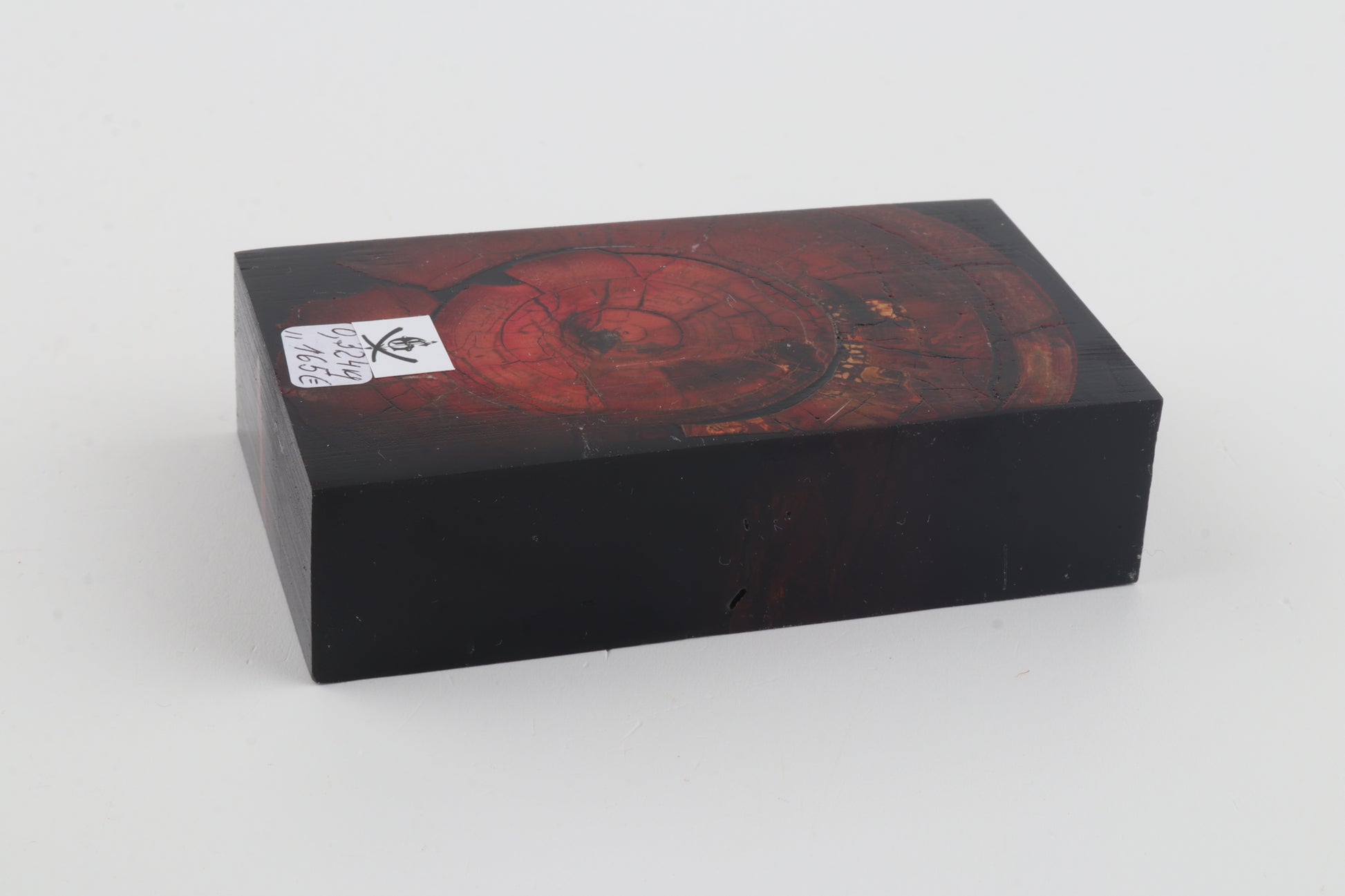 This is a cross-cut stabilized woolly mammoth ivory block (Mammuthus primigenius). This block can be precision-cut, drilled, sanded, polished etc. to achieve the desired results. Consistent width and thickness with reserves on both ends. The color of the ivory is deep red with swirling dark red patterns.