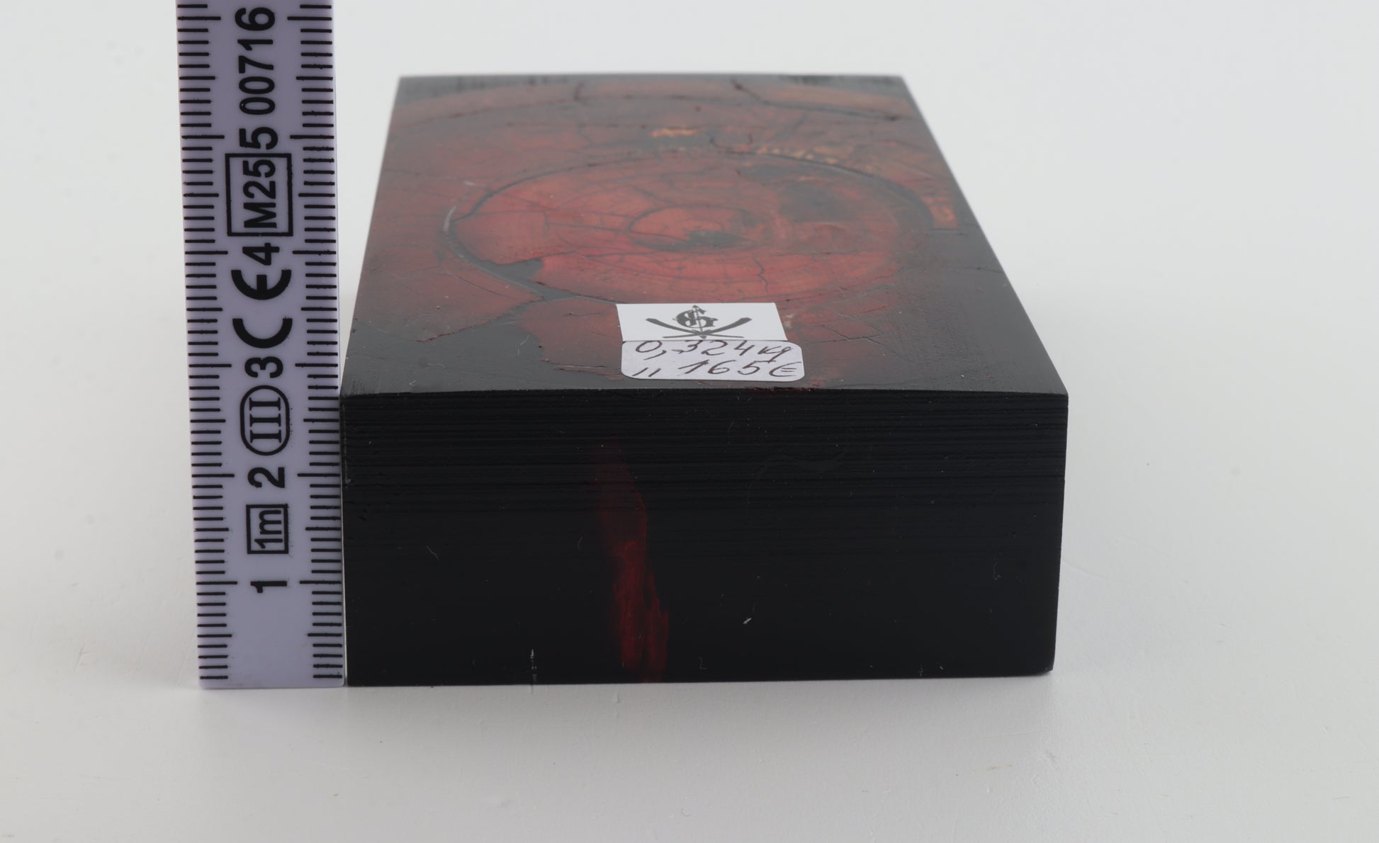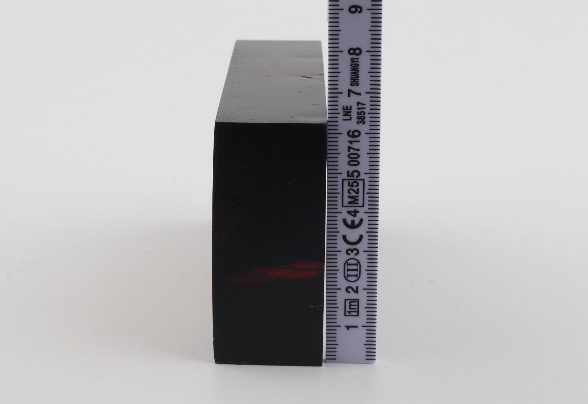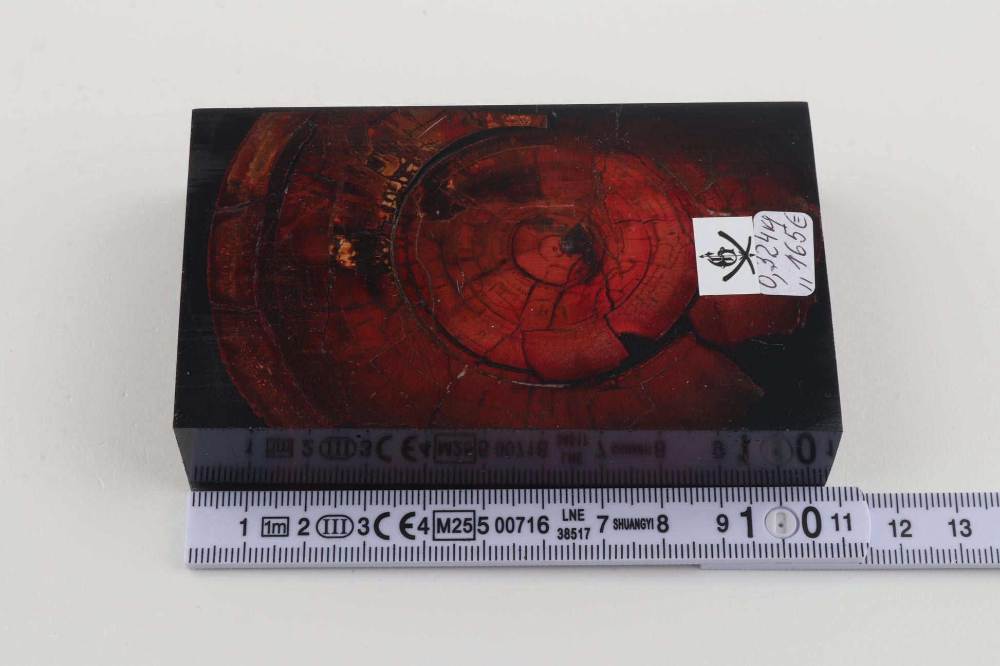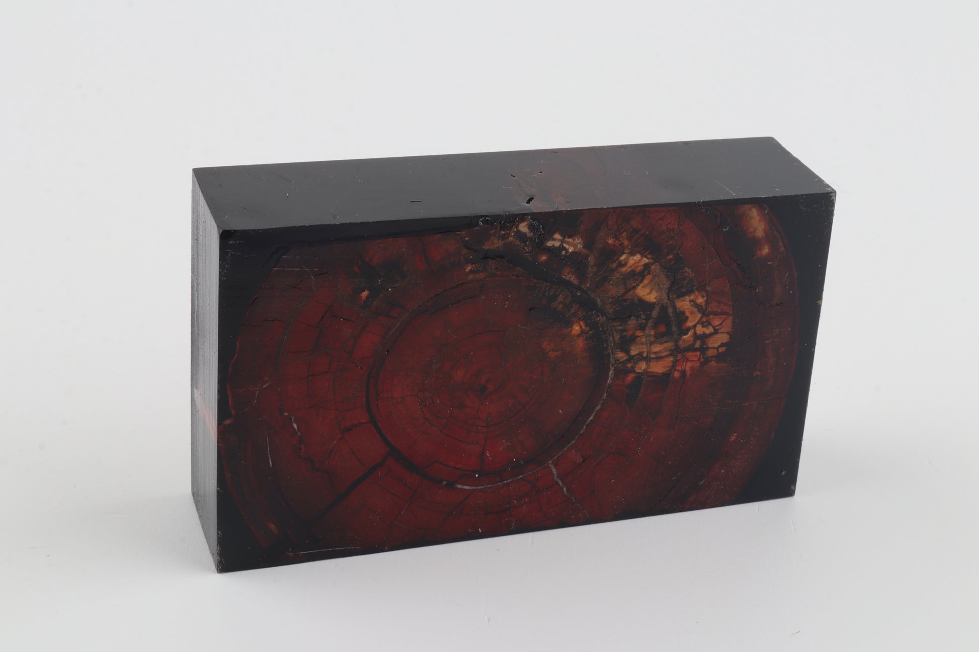 This is a cross-cut stabilized woolly mammoth ivory block (Mammuthus primigenius). This block can be precision-cut, drilled, sanded, polished etc. to achieve the desired results. Consistent width and thickness with reserves on both ends. The color of the ivory is deep red with swirling dark red patterns.