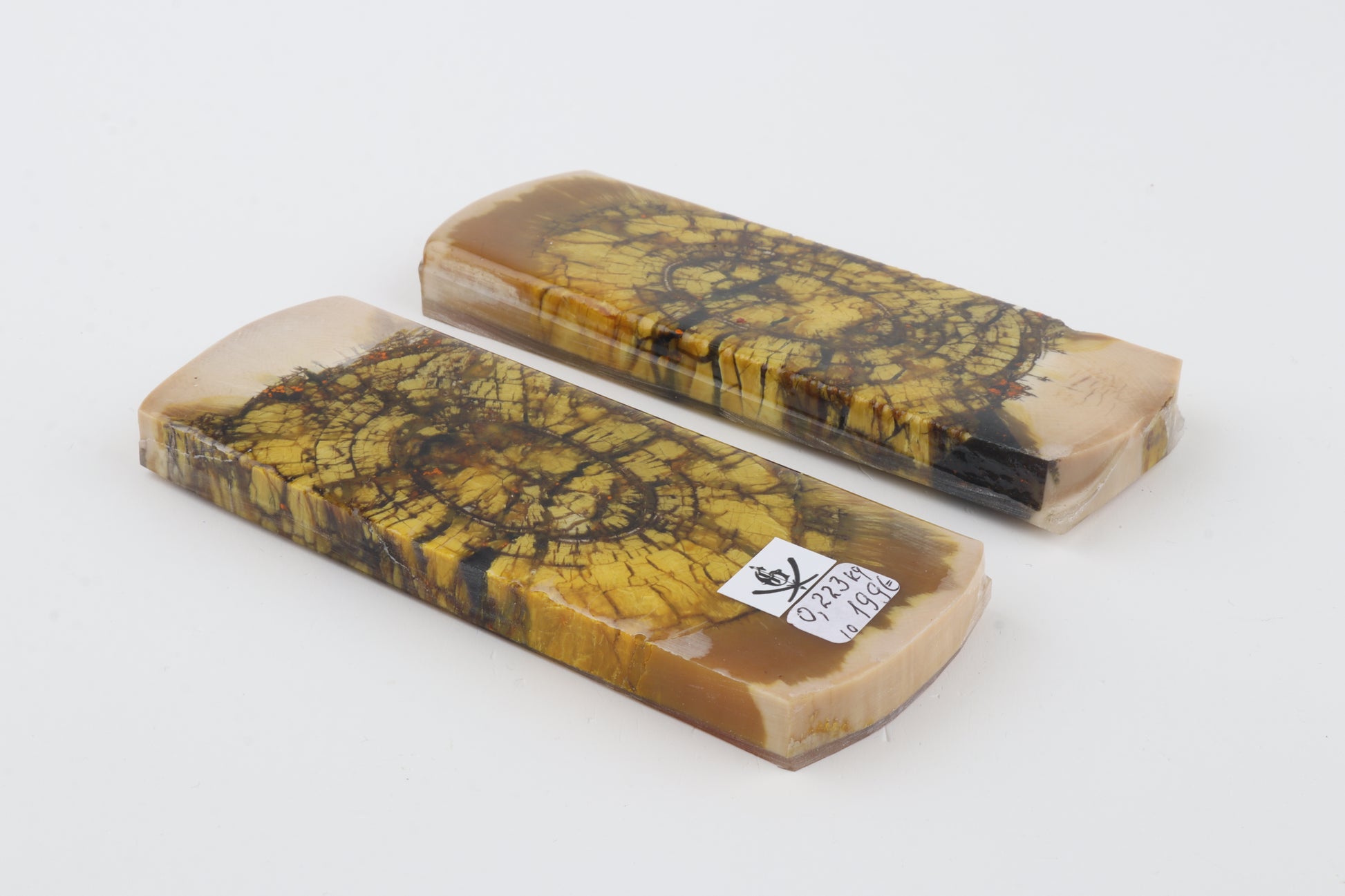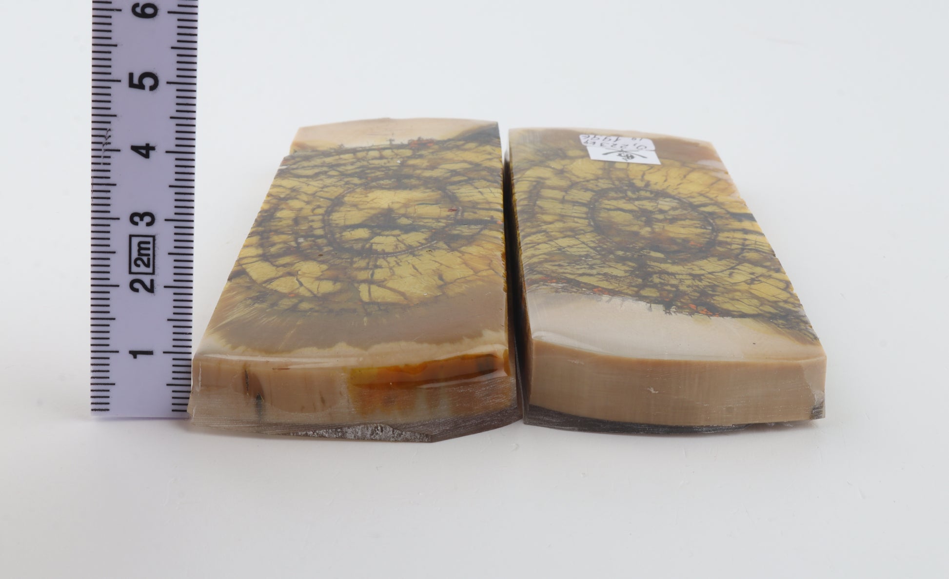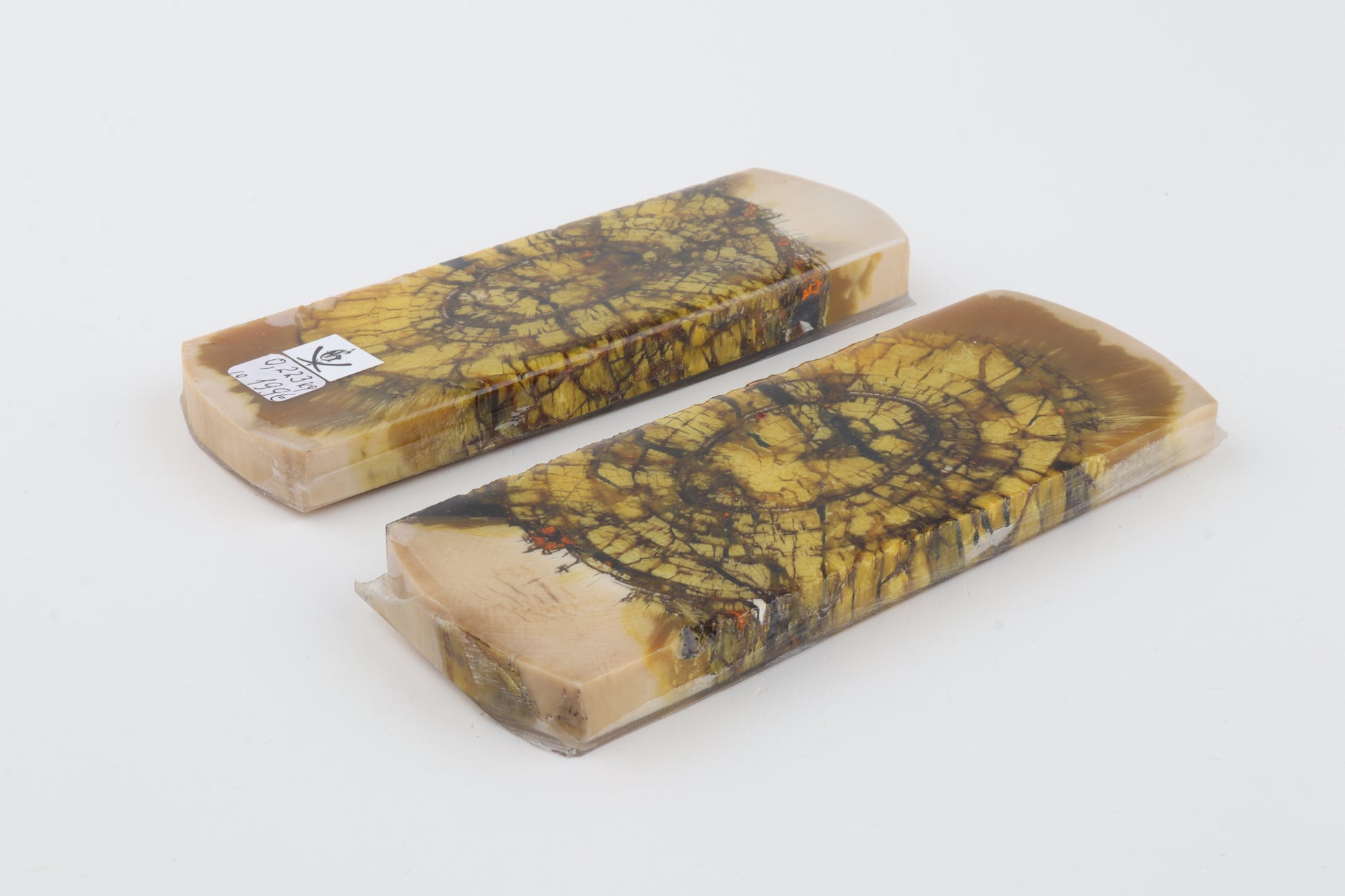 This is a pre-cut pair of stabilised mammoth ivory scales (Mammuthus primigenius). These scales can be precision-cut, drilled, polished, sanded etc. to achieve the desired results. One slab is larger than the other. Consistent width and thickness with reserves on both ends. The colour of the ivory is yellow.