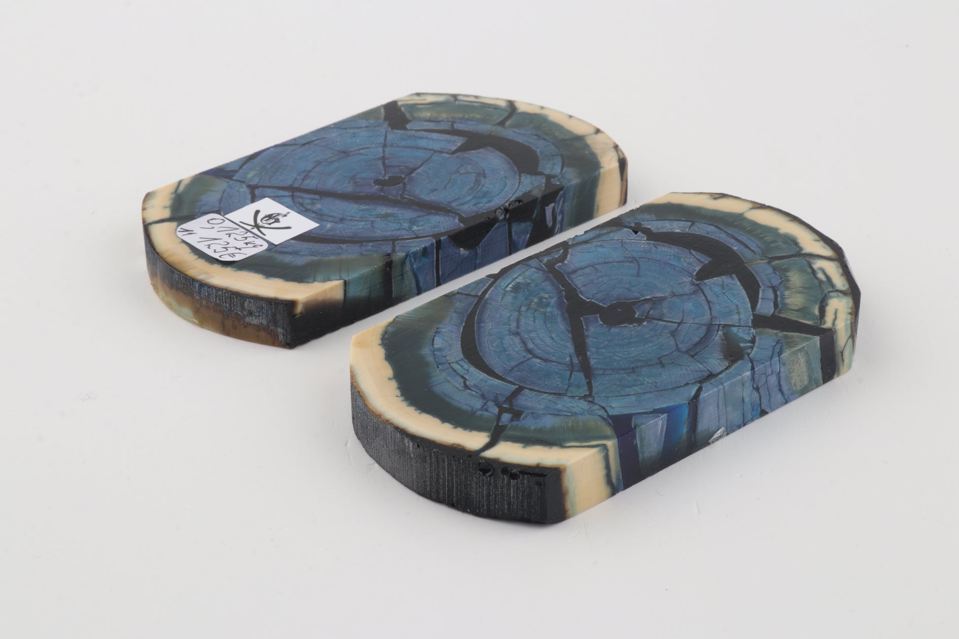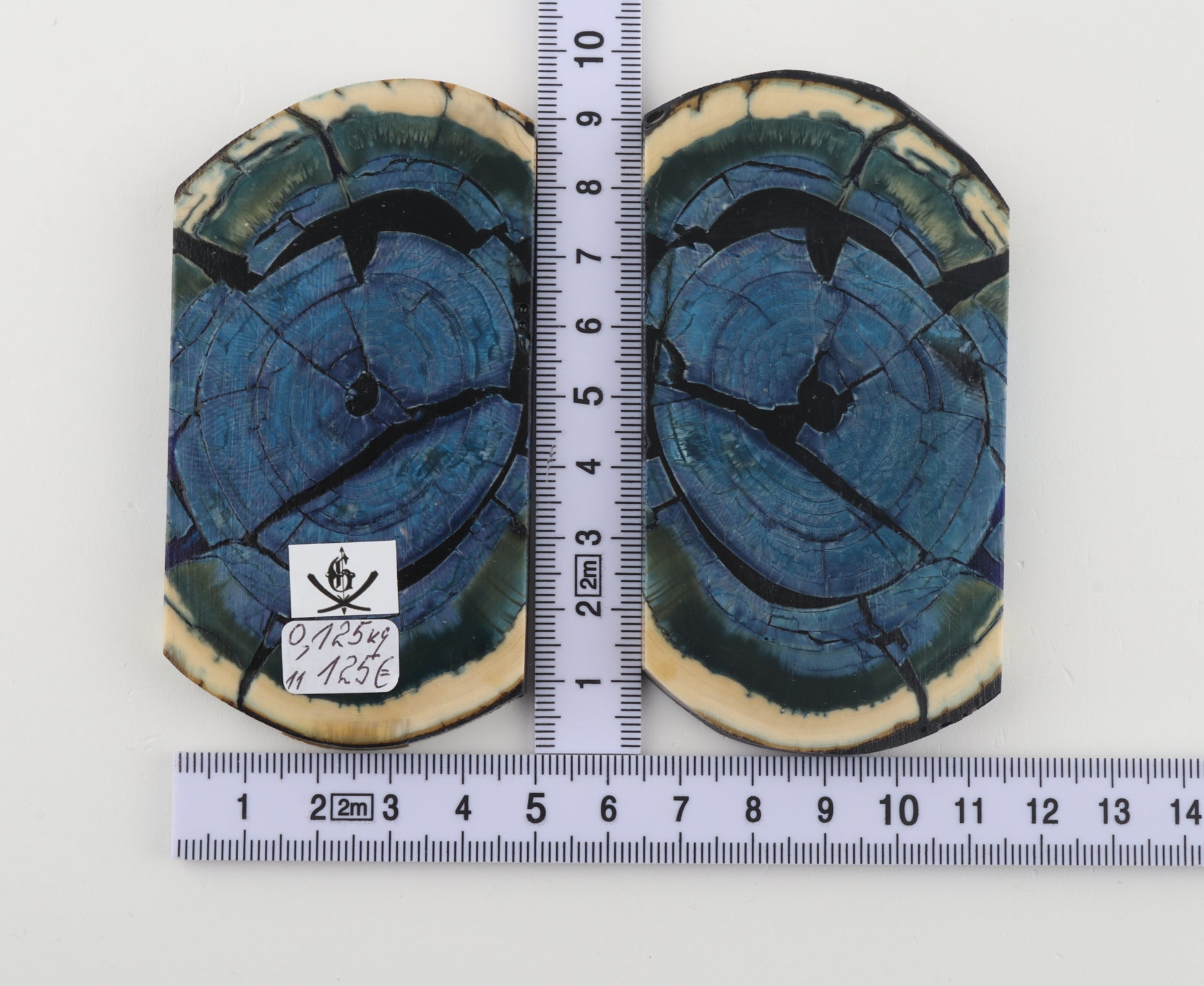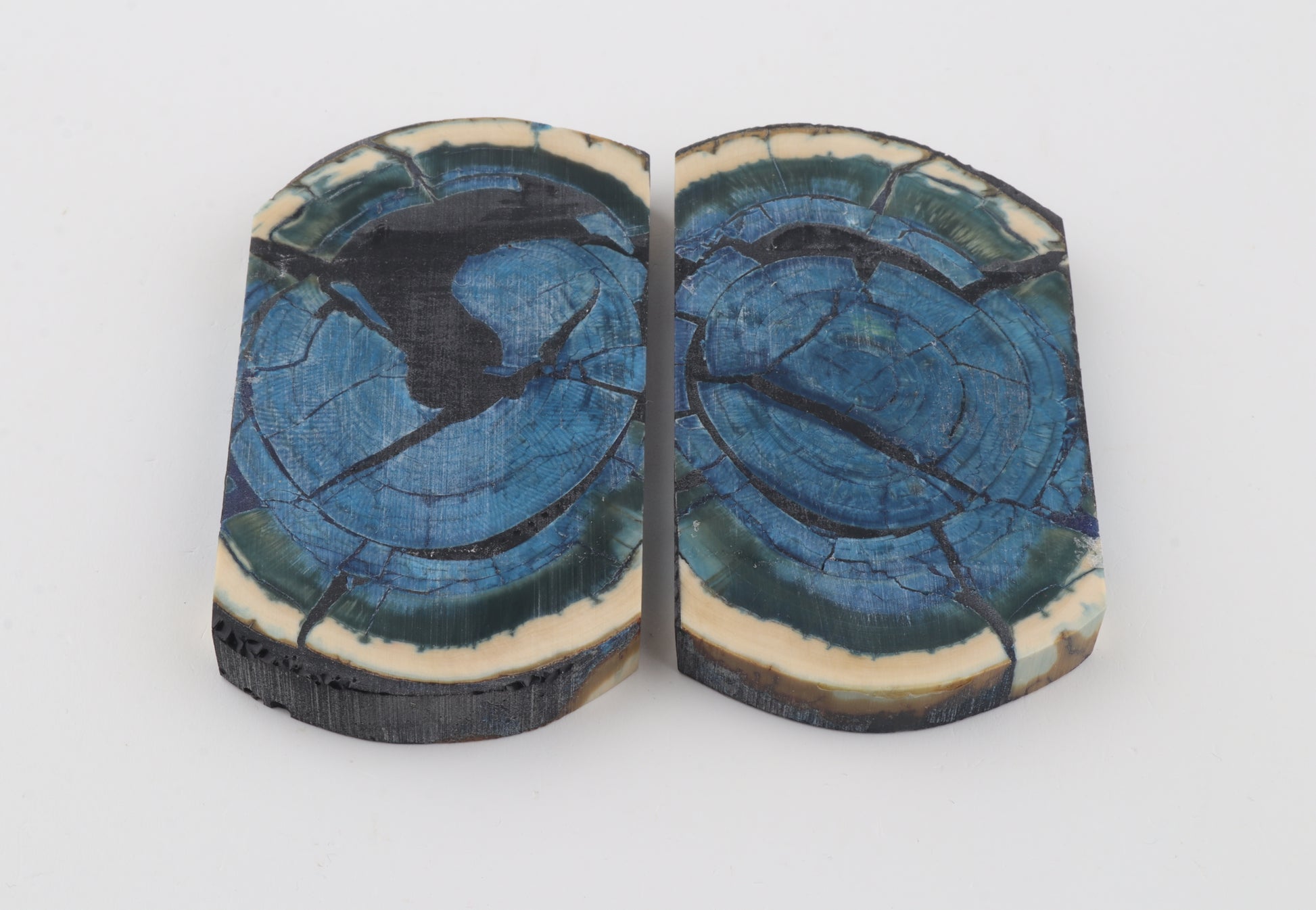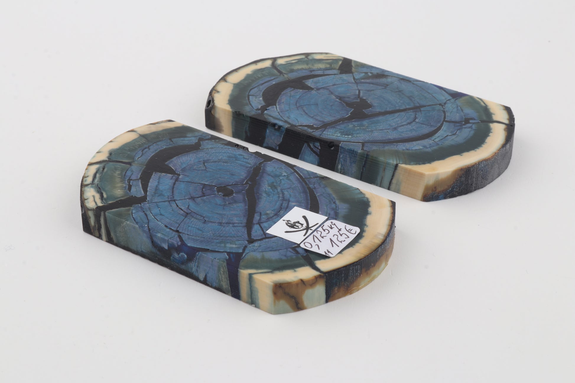 This is a pre-cut pair of stabilised mammoth ivory scales (Mammuthus primigenius). These scales can be precision-cut, drilled, polished, sanded etc. to achieve the desired results. One slab is larger than the other. Consistent width and thickness with reserves on both ends. The colour of the ivory is blue.