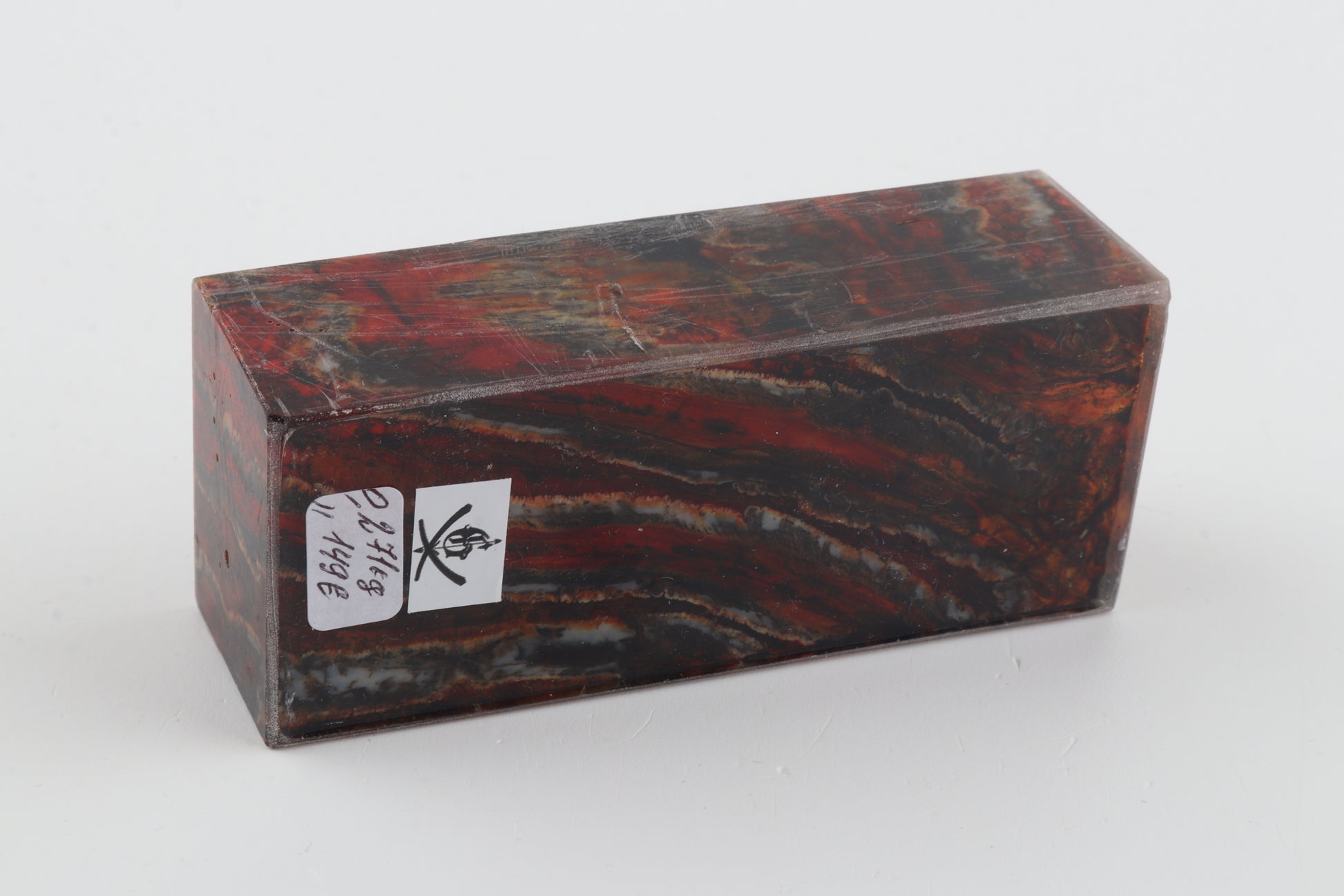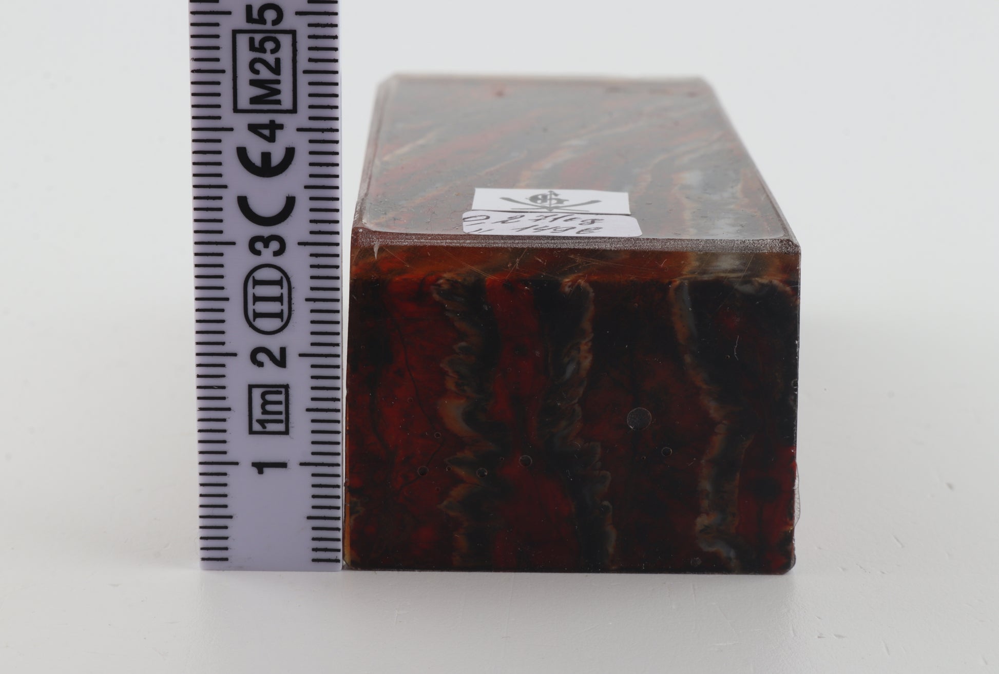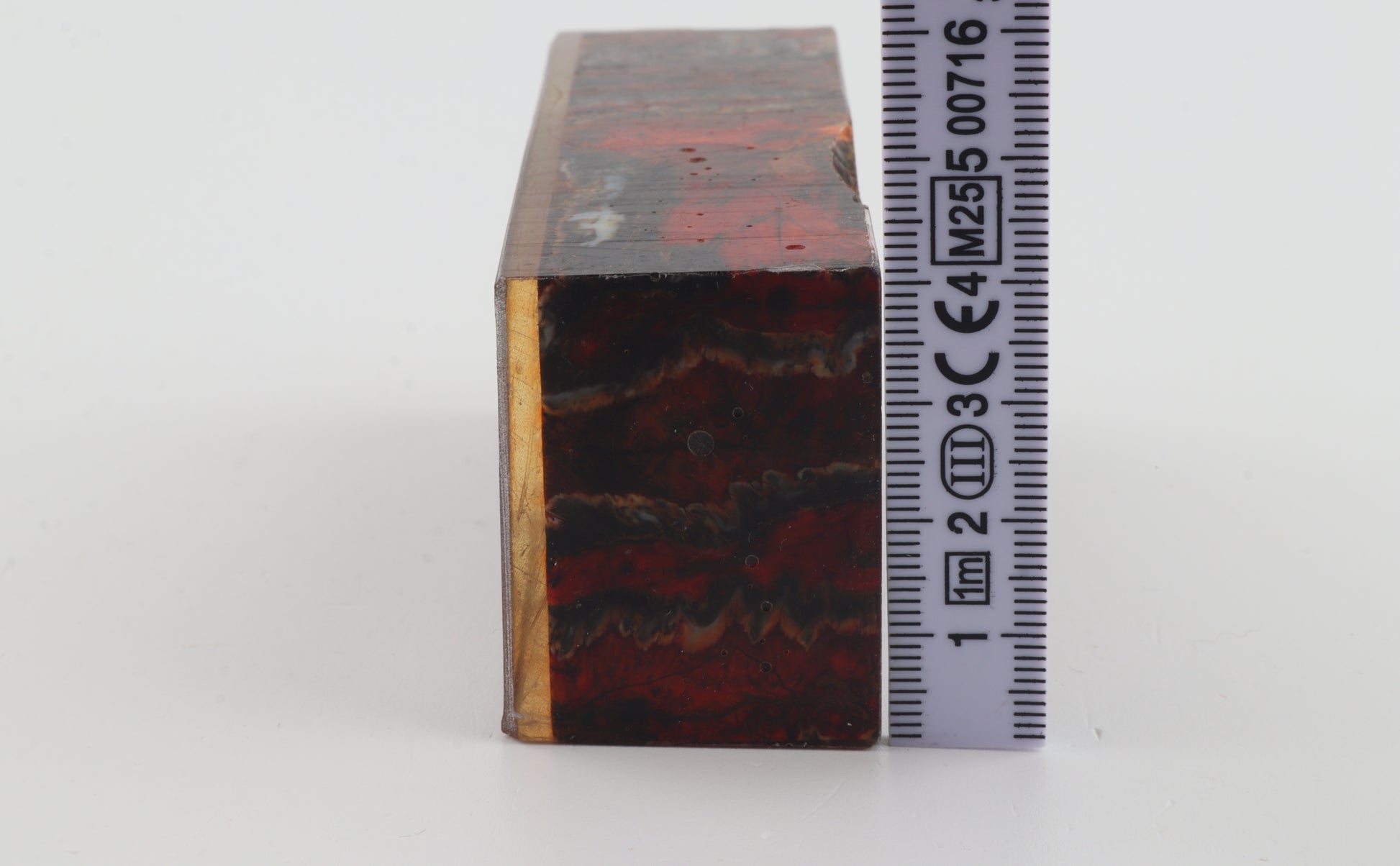 This is a length-cut, stabilized woolly mammoth molar block (Mammuthus primigenius). This molar block can be precision-cut, drilled, sanded, polished etc. to achieve the desired results. Consistent width and thickness. The colour of the molar is a mix of deep reddish tones with black and dark brown streaks running through it.