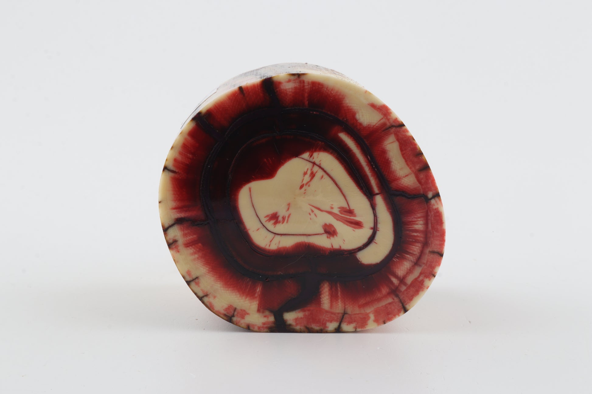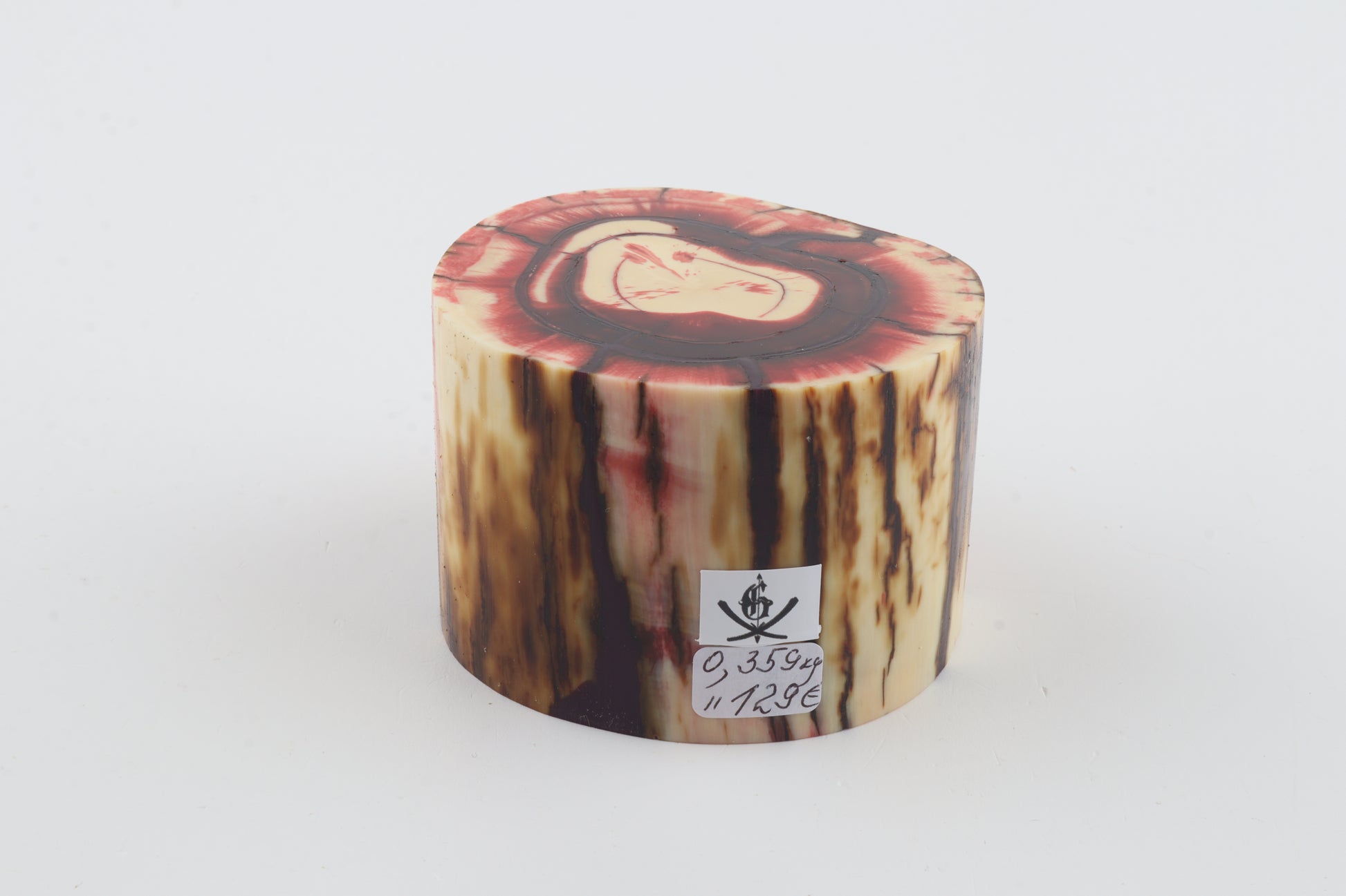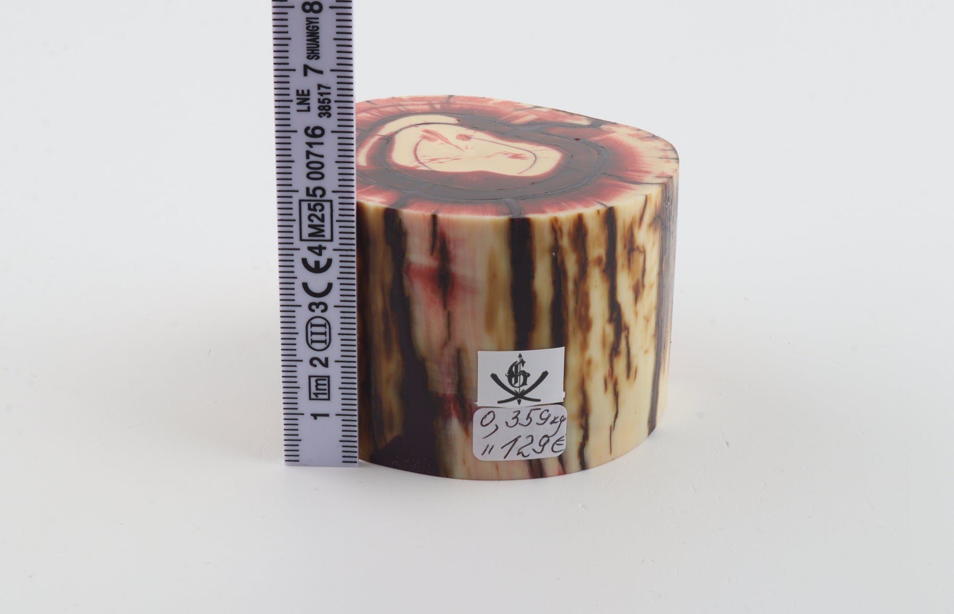 This is a round, cross-cut stabilised woolly mammoth ivory block (Mammuthus primigenius). This block can be precision-cut, drilled, sanded, polished etc. to achieve the desired results. Consistent diameter with reserves on both ends. The colour of the ivory is rich red and cream, with darker black lines outlining the layers.