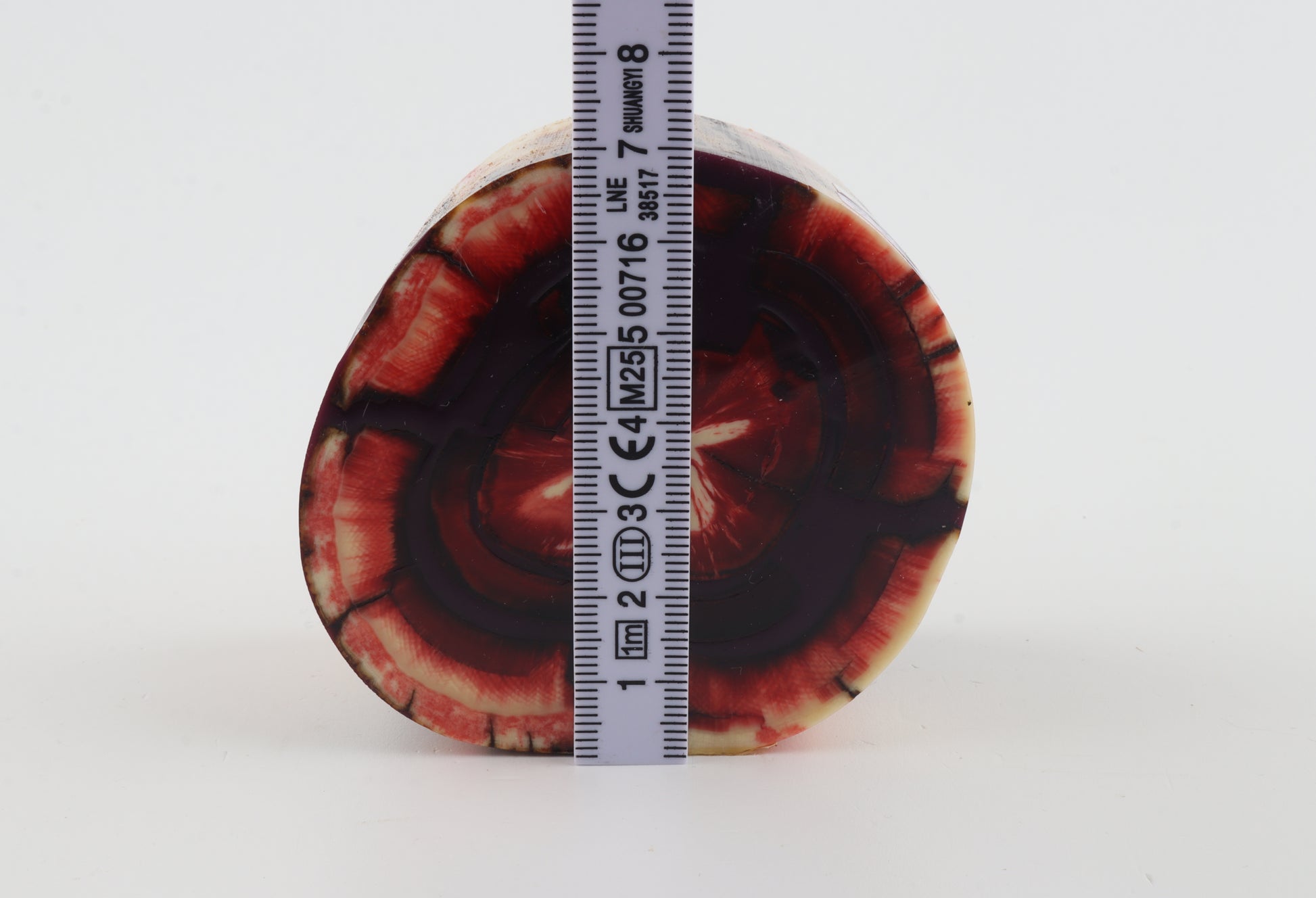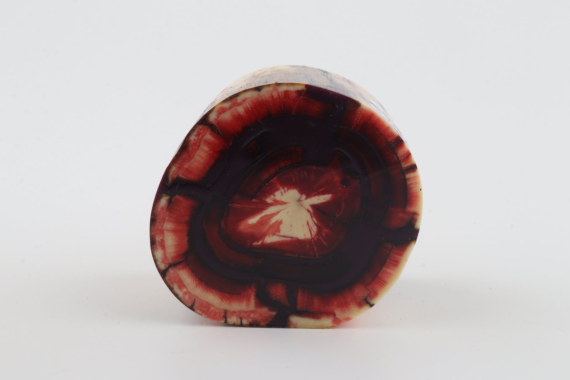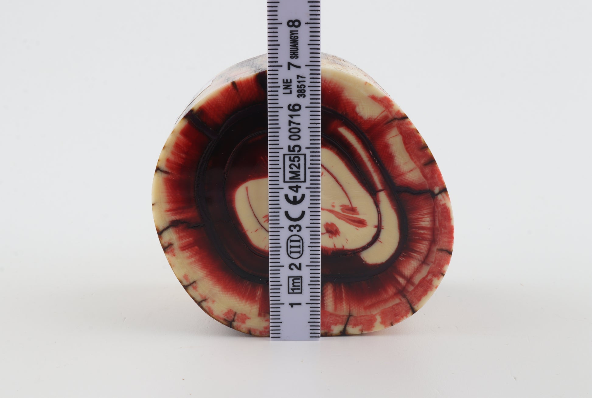 This is a round, cross-cut stabilised woolly mammoth ivory block (Mammuthus primigenius). This block can be precision-cut, drilled, sanded, polished etc. to achieve the desired results. Consistent diameter with reserves on both ends. The colour of the ivory is rich red and cream, with darker black lines outlining the layers.