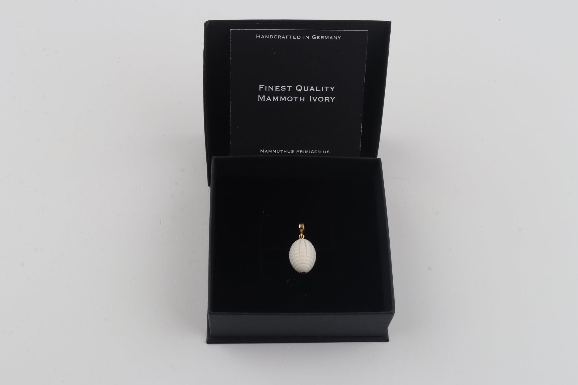 This unique pendant features a carved mammoth ivory bead (Mammuthus primigenius) with a detailed, textured surface that highlights the natural beauty and structure of genuine mammoth ivory.