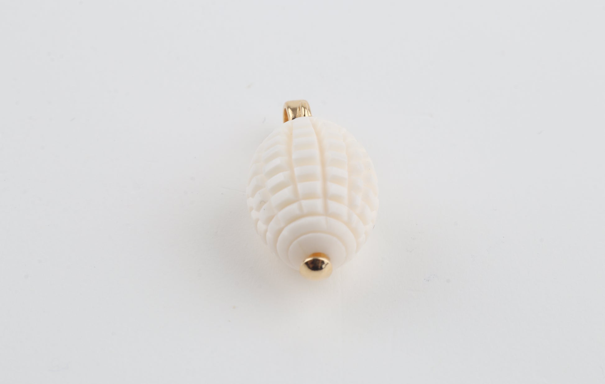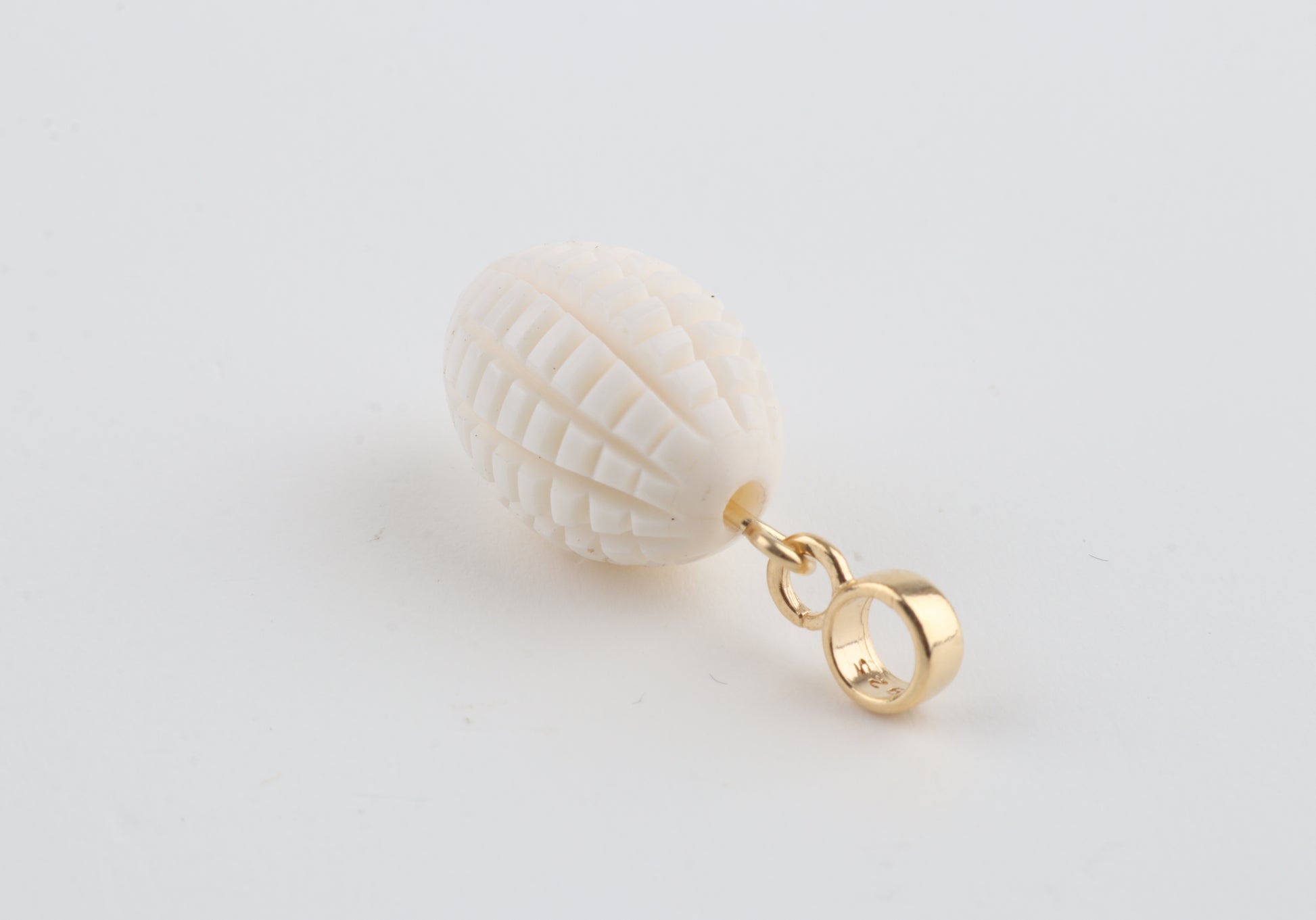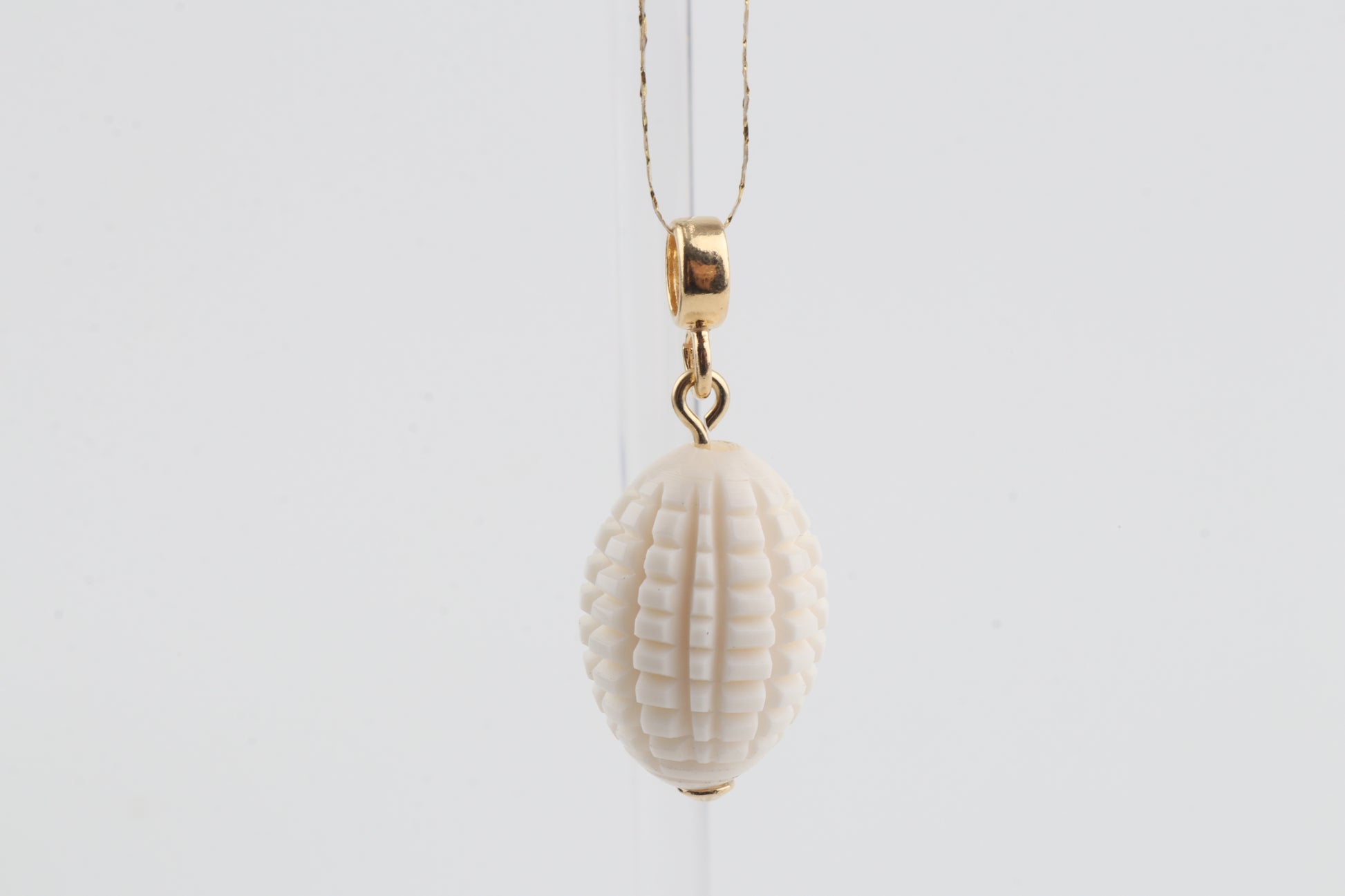 The intricate carving gives the piece a sculptural, organic character, complemented by a simple gold-plated sterling silver bail.