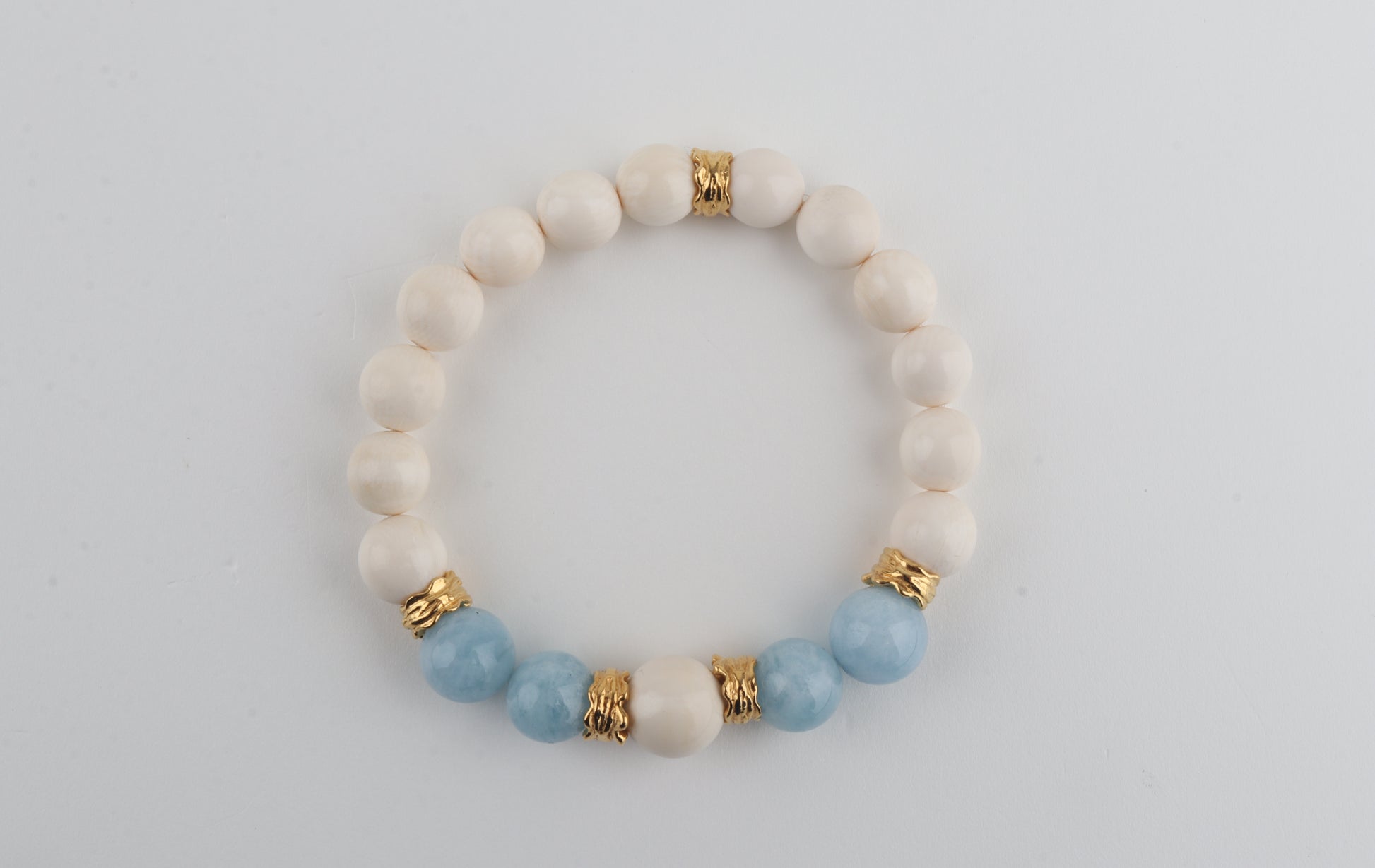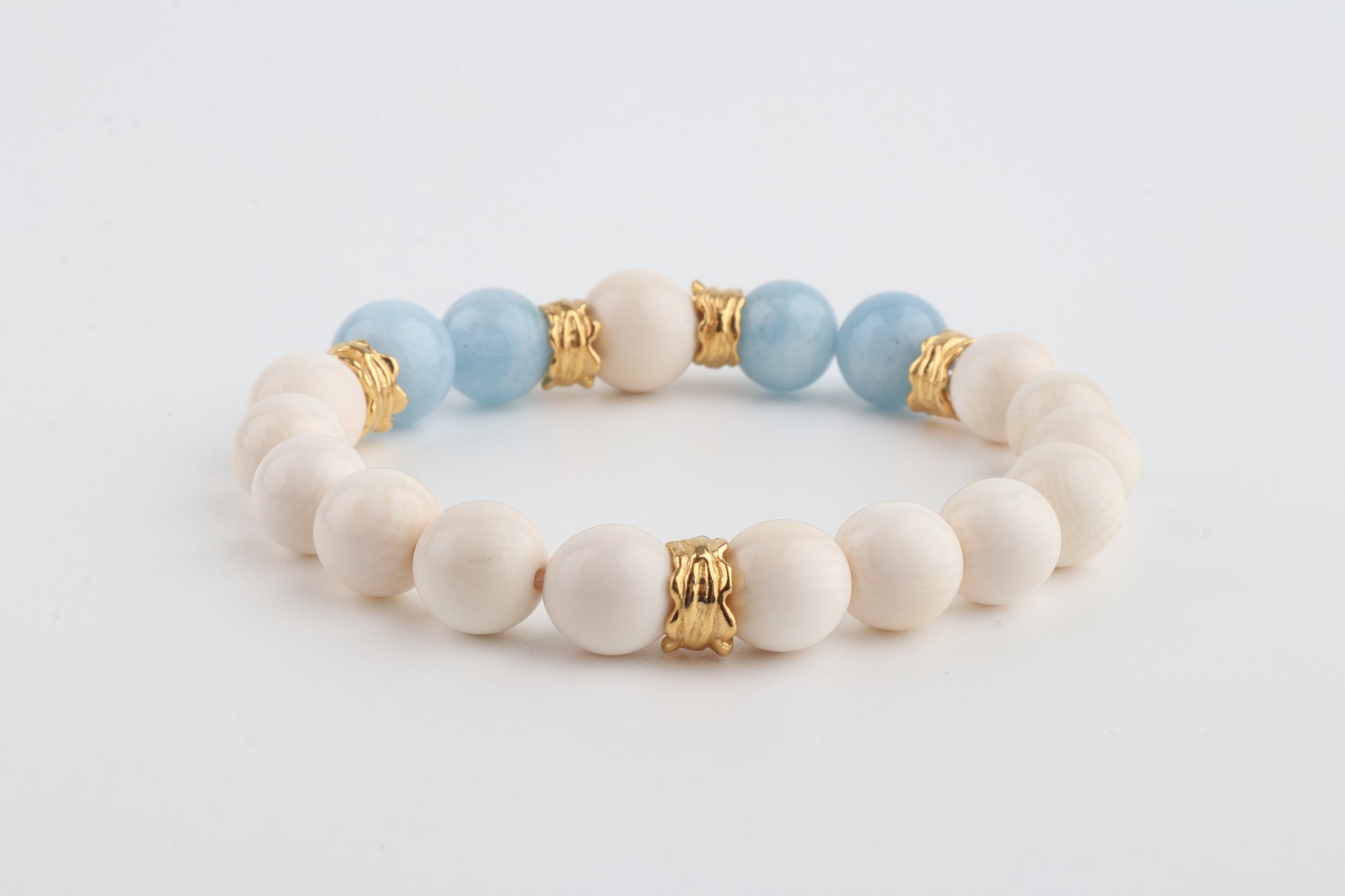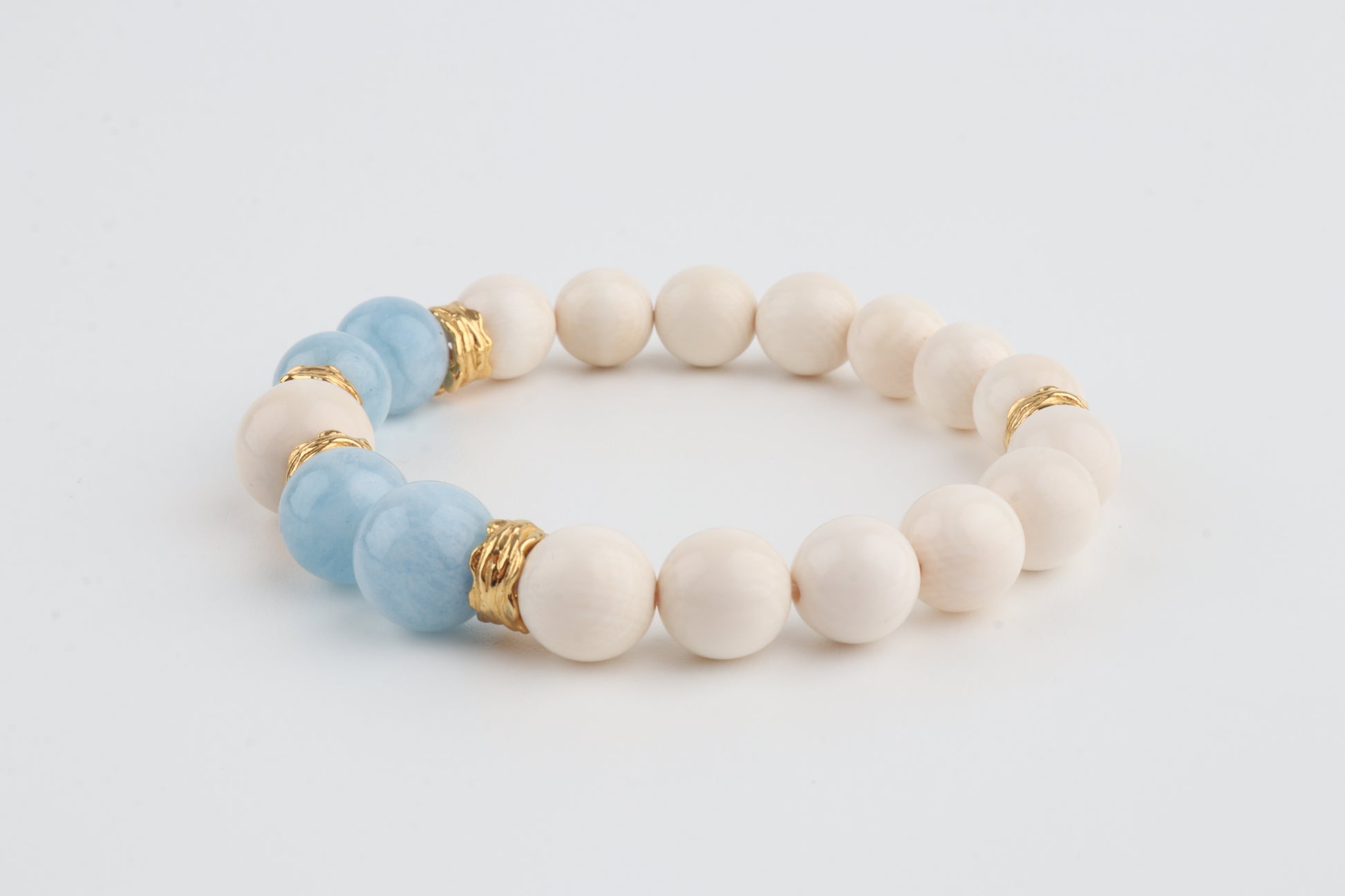 This refined bestseller variation pairs mammoth ivory beads (Mammuthus primigenius) with soft blue aquamarine gemstones, accented by detailed gold-plated sterling silver spacers. The gentle contrast between creamy ivory and cool aquamarine creates a serene, balanced composition inspired by Arctic light and northern waters.