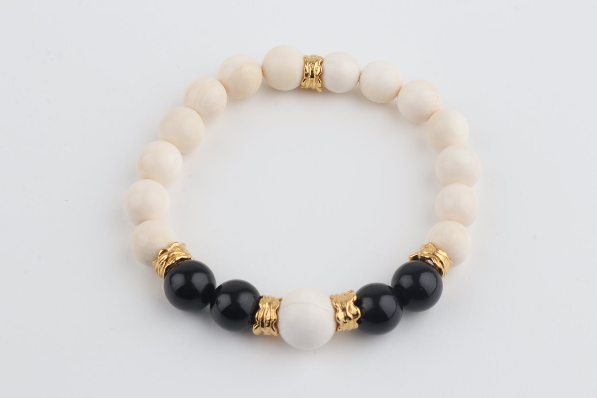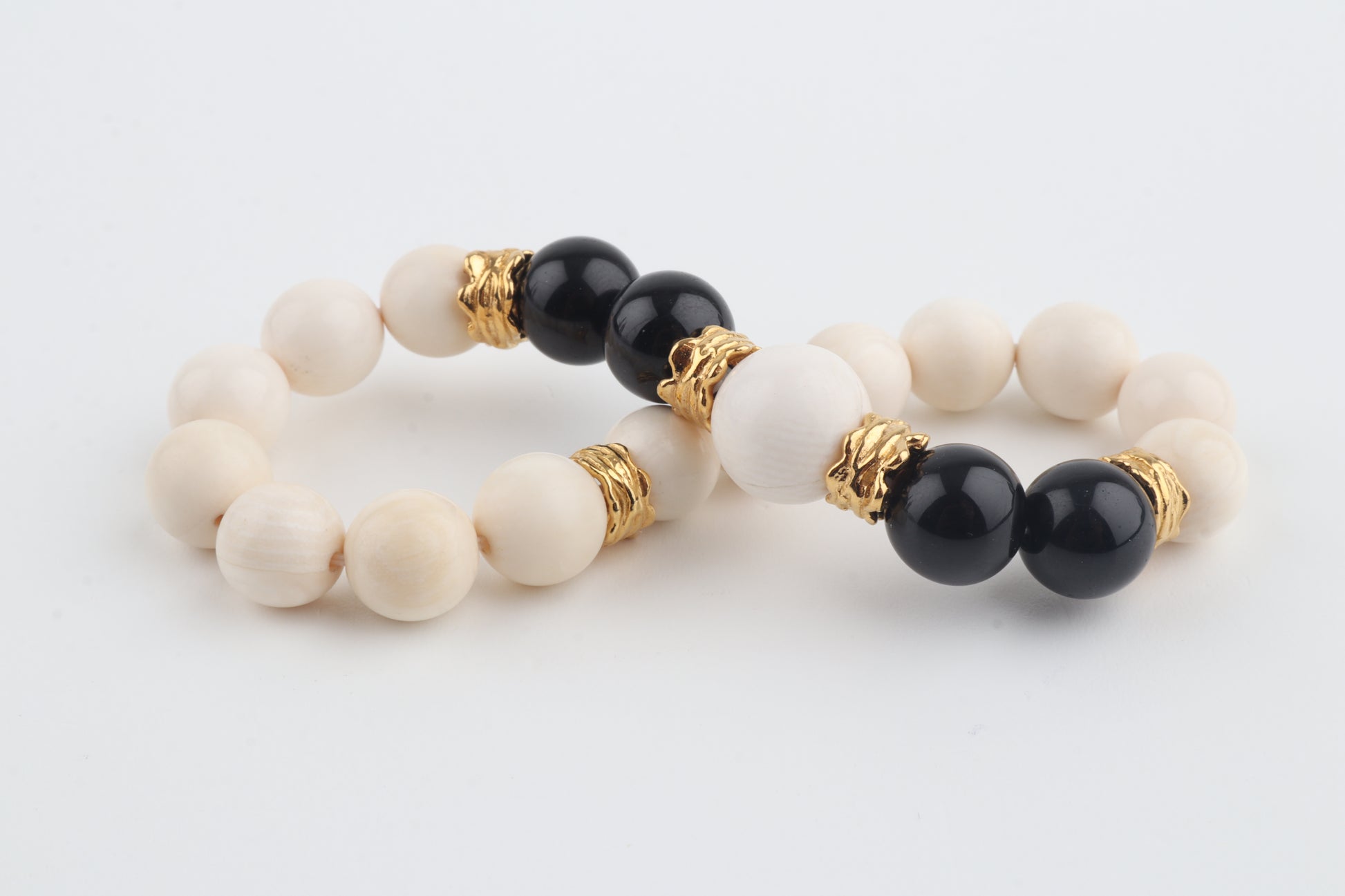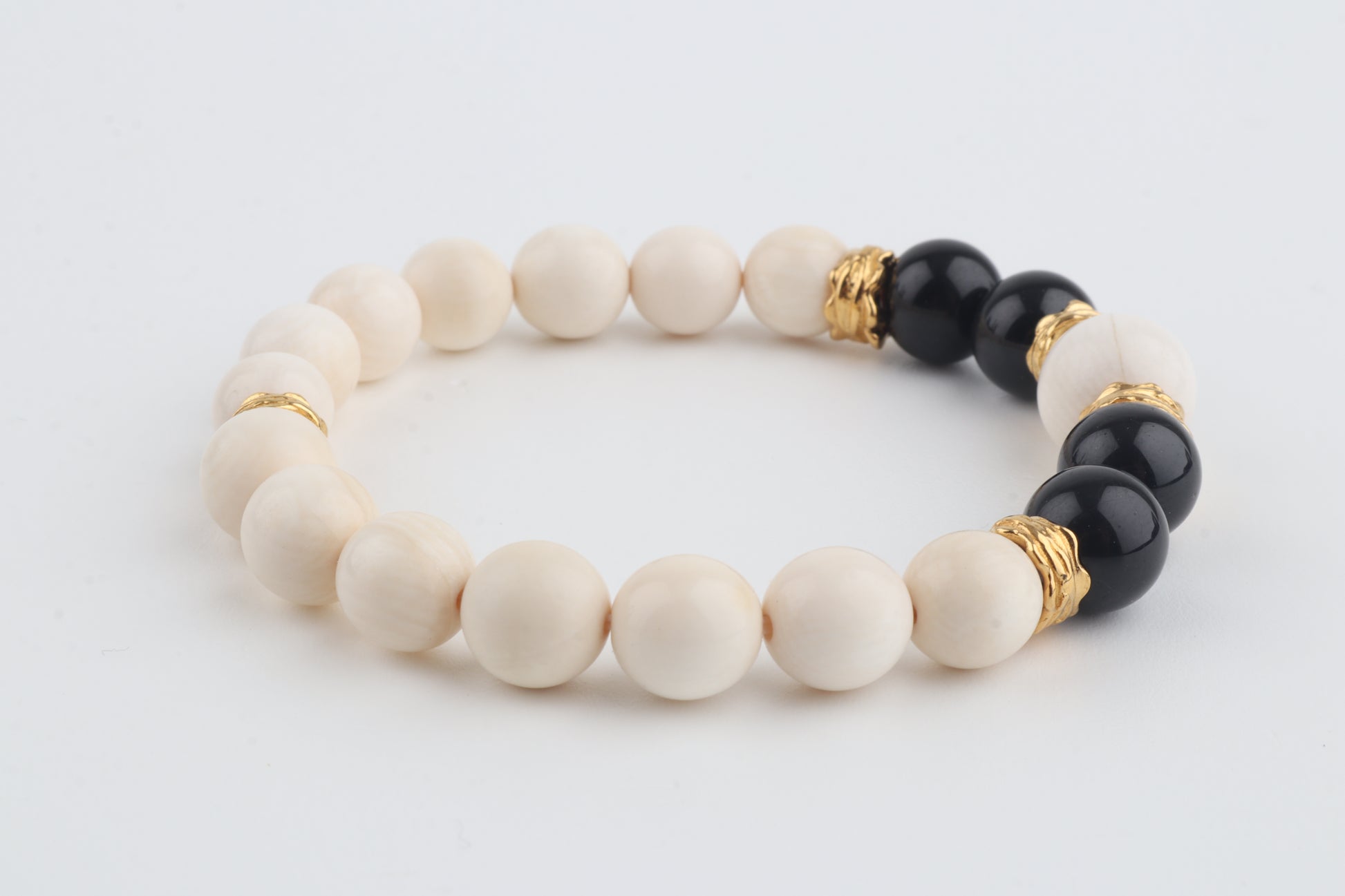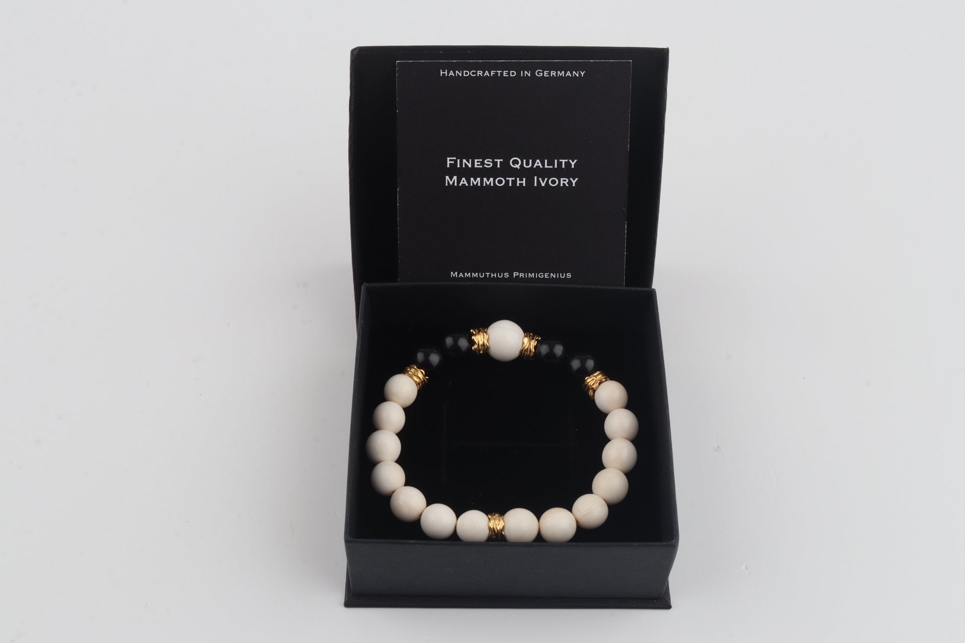 This striking variation of our Cleo bestseller unites 9 mm mammoth ivory beads (Mammuthus primigenius) with the deep brilliance of obsidian. Obsidian with its natural reflective depth, contrasts beautifully against the soft, matte creaminess of Arctic mammoth ivory. Gold-plated sterling silver spacers add a subtle but chic touch to this quiet luxury bracelet.