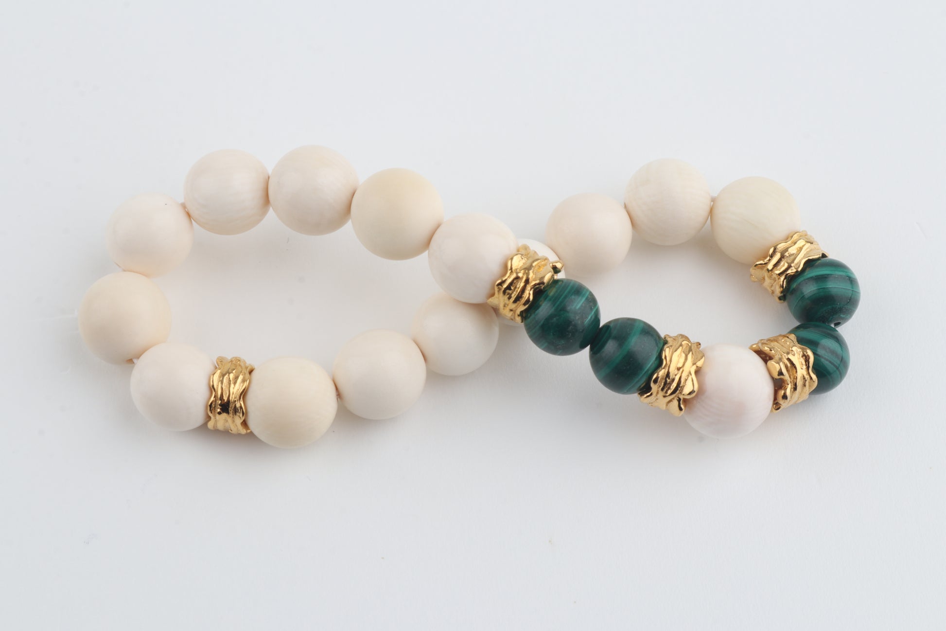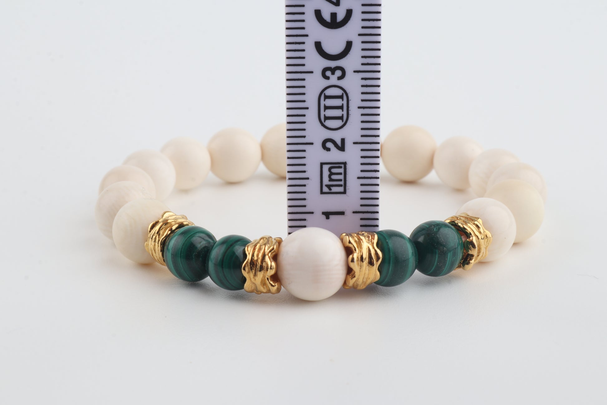 This bestseller bracelet pairs 9 mm mammoth ivory beads (Mammuthus primigenius) with vivid green natural malachite gemstones accented by gold-plated sterling silver spacers. The deep banded greens of malachite contrast elegantly with the smooth creaminess of mammoth ivory.