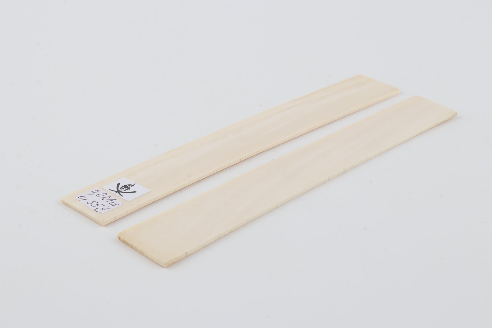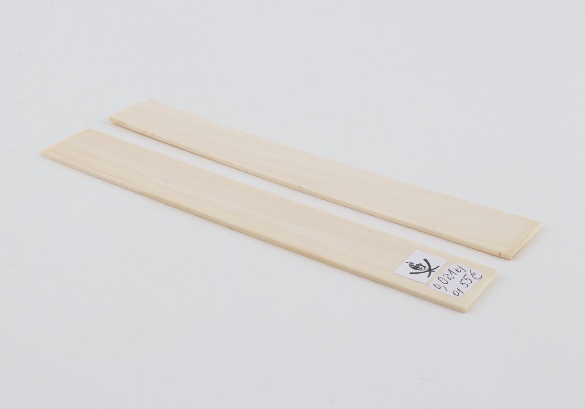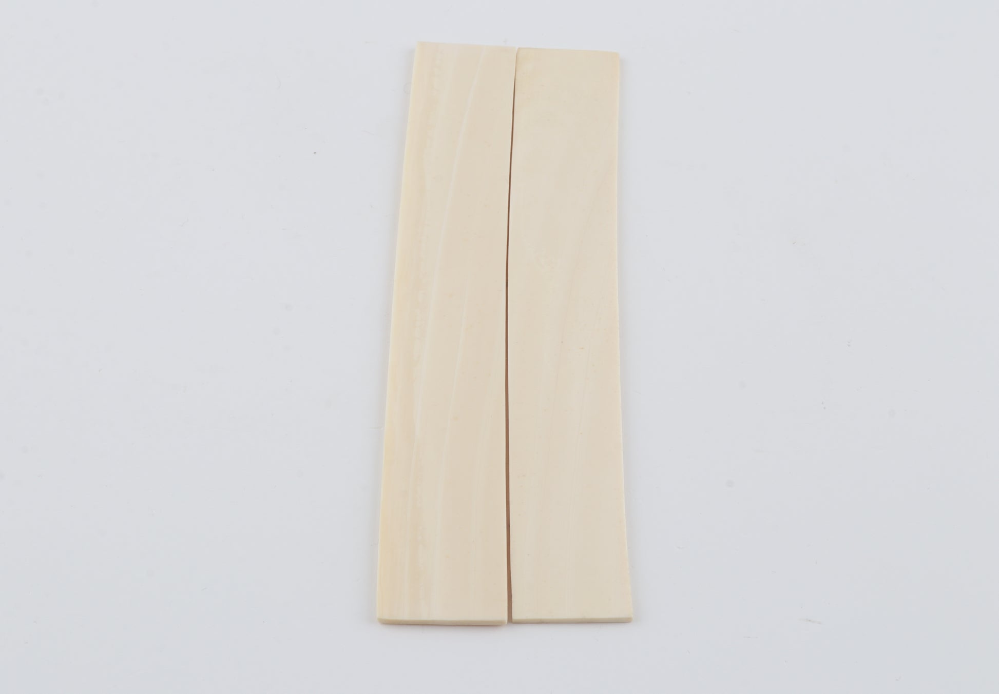 This is a pre-cut pair of natural woolly mammoth ivory scales (Mammuthus primigenius). These scales are in an immaculate condition. The ivory is dry and without cracks. Consistent width and thickness with reserves on both ends. The undersides are flat. These pieces display the typical ivory tone.