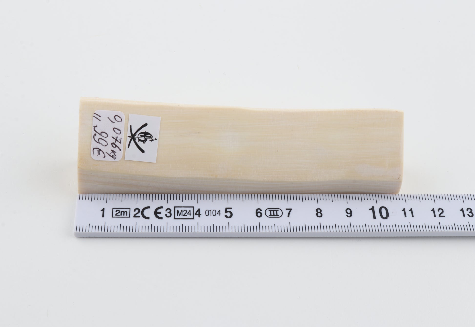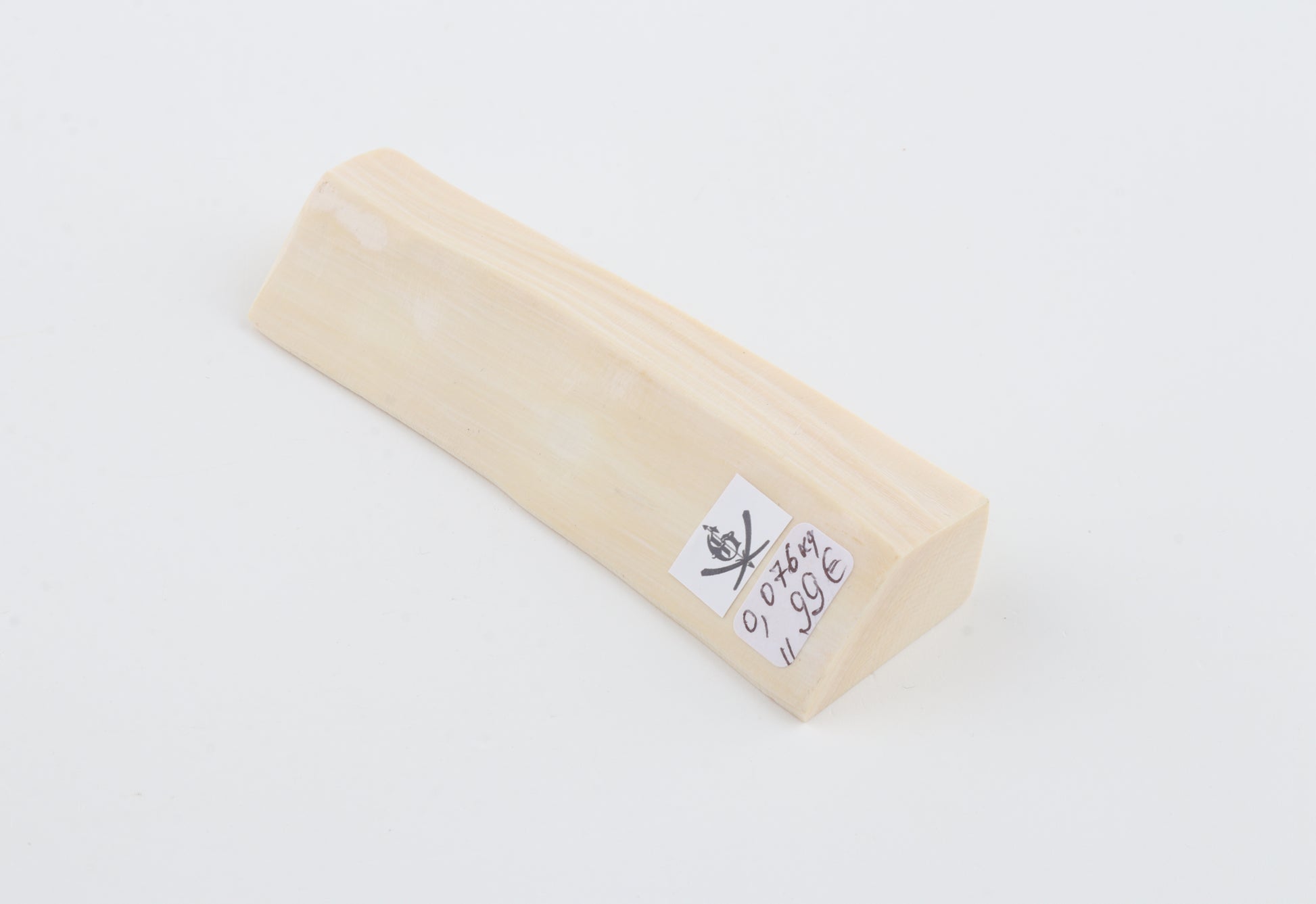 This is a premium-quality piece of Siberian woolly mammoth ivory (Mammuthus primigenius). The ivory is naturally dense and solid, without cracks. One cross-cut section is slightly larger than the other. Reserves on both ends. Please carefully look at the pictures for precise dimensions. The piece displays its original, natural ivory tone.